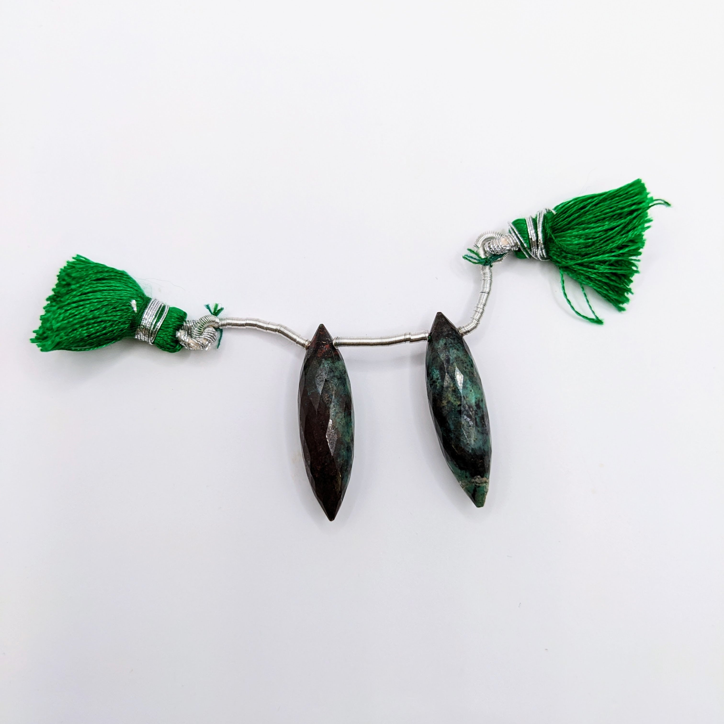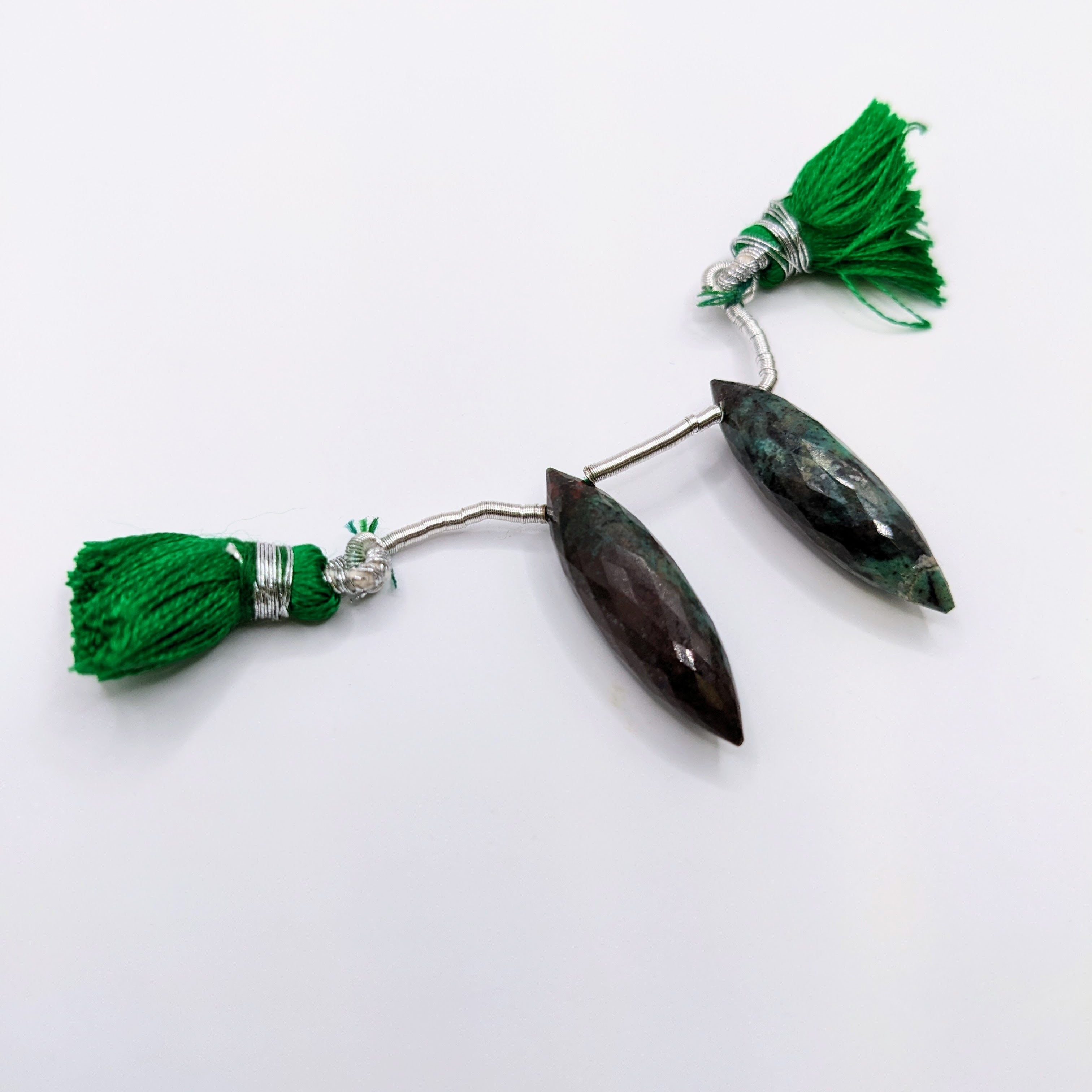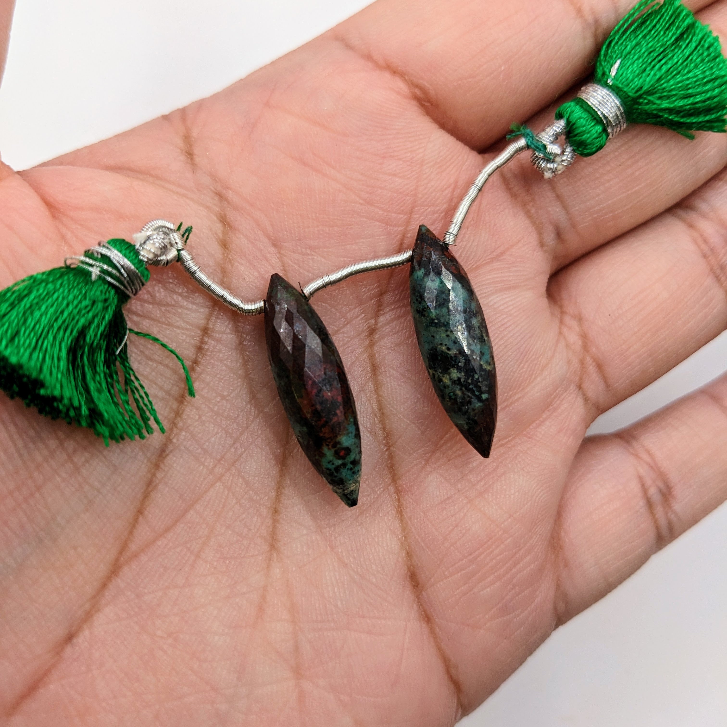 Natural Green Sanora Jasper Drilled Matched Pair Okra Shape- Side Drilled Faceted Gem 26x7mm