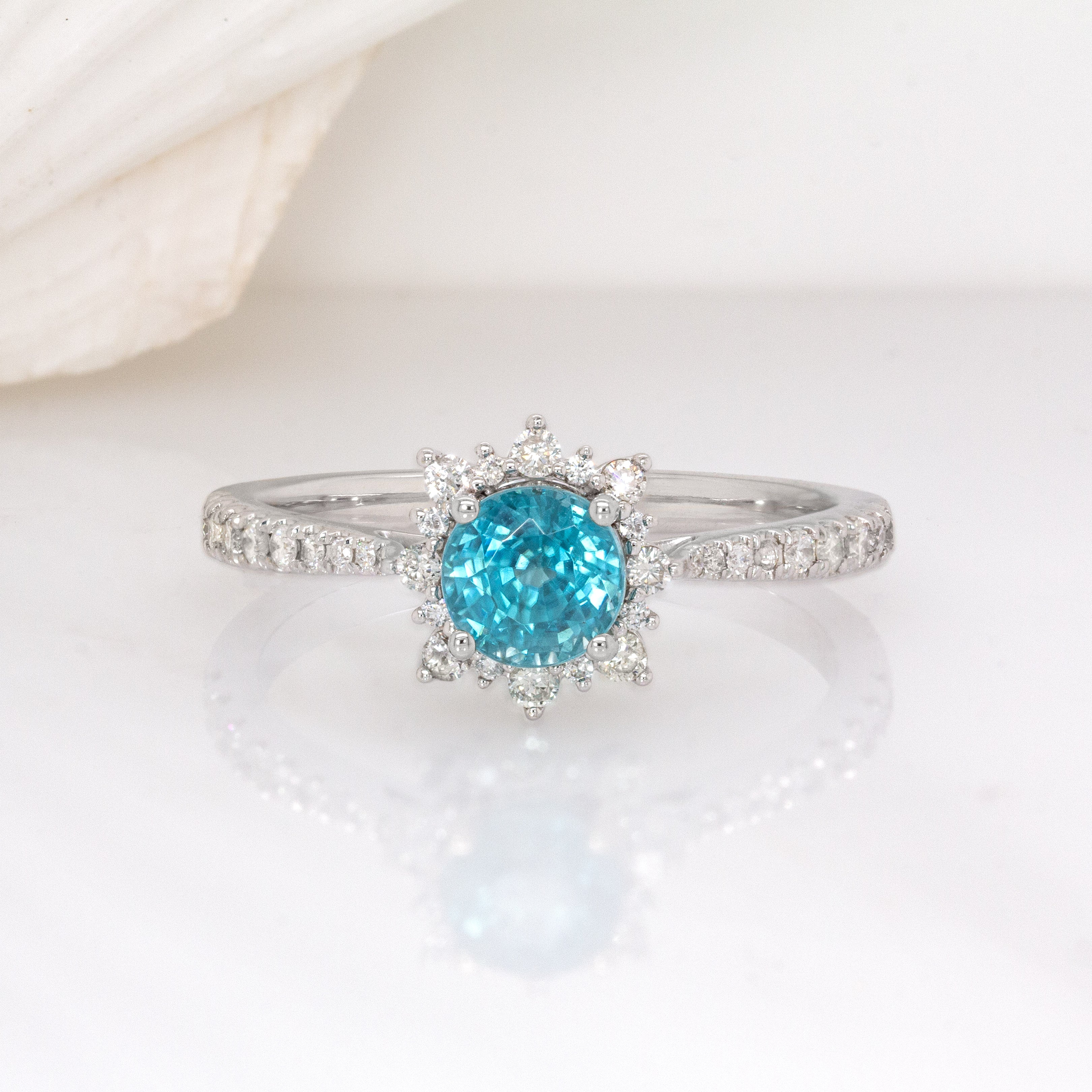 Zoya 14k Solid White Gold Blue Zircon Ring W Natural Diamonds | Round, 5mm