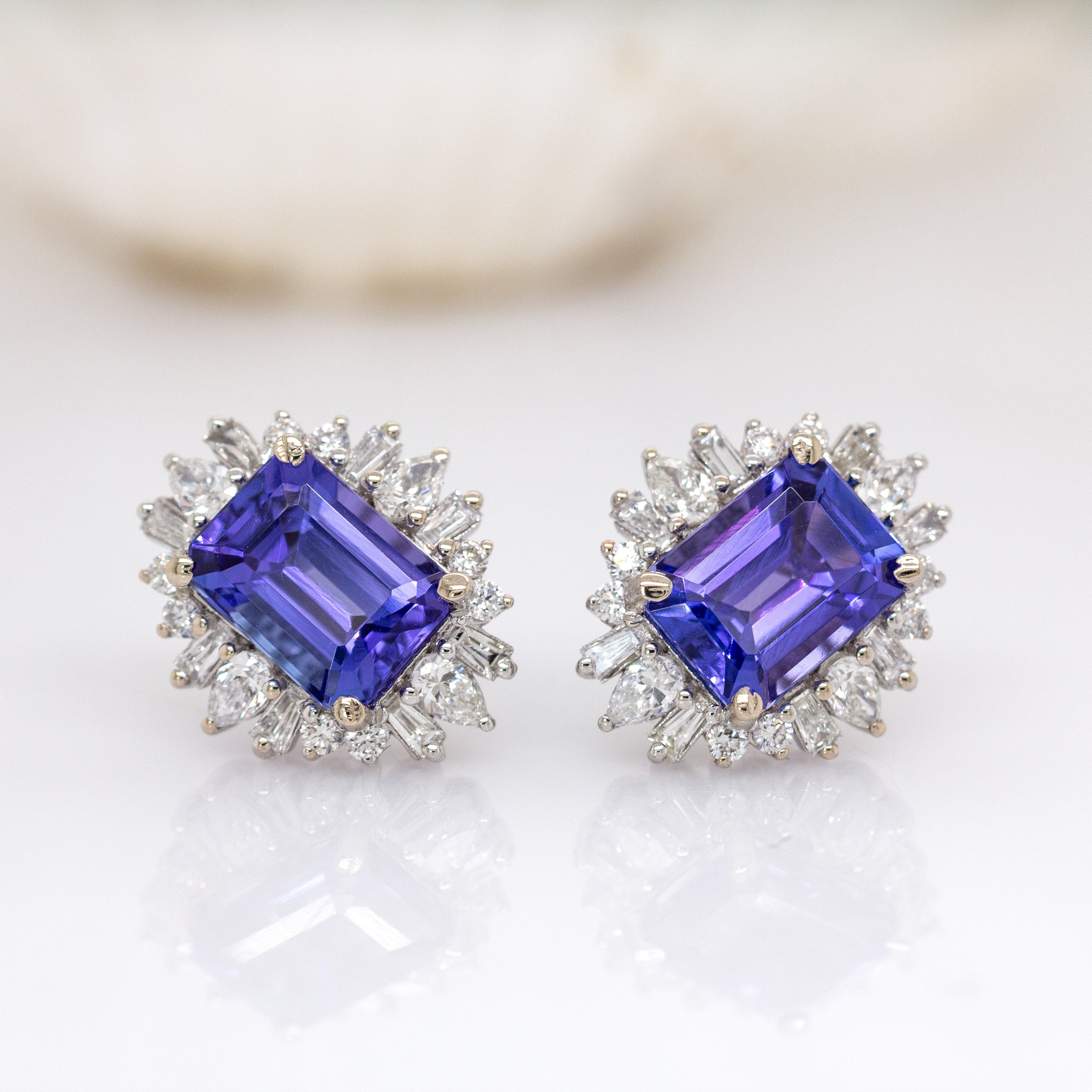 Elevate your elegance with these radiant 14K gold earrings, centred on striking emerald‑cut tanzanites (≈ 2–3.79 total carats, 8×6 mm). Each stone shines with a rich violet‑blue hue exclusive to gems mined near Merelani, Tanzania—where no other gem matches its rarity. Framed by 40 precision‑cut diamonds (≈ 0.83 cttw), these earrings dazzle with every turn, every light, every moment.