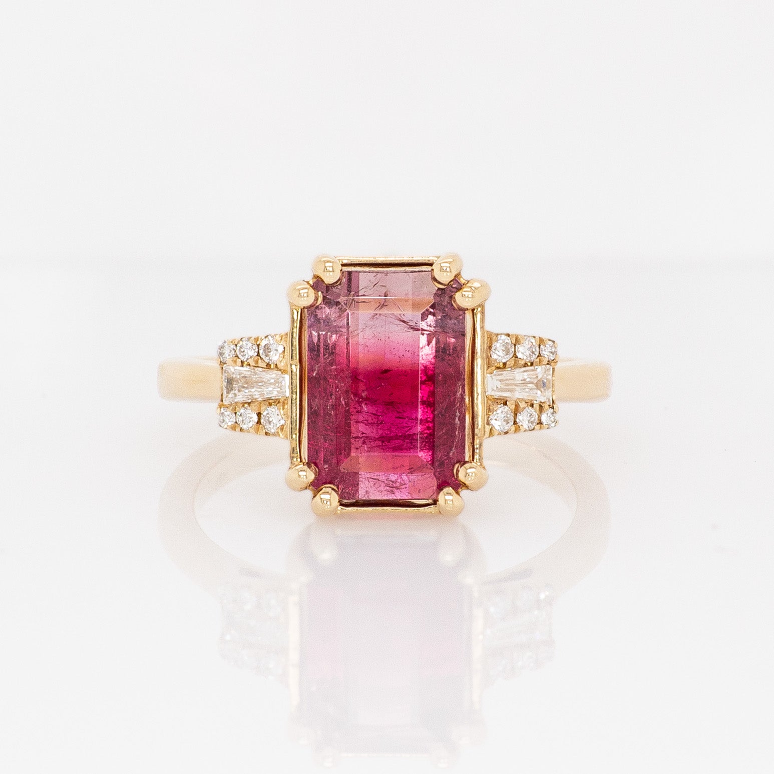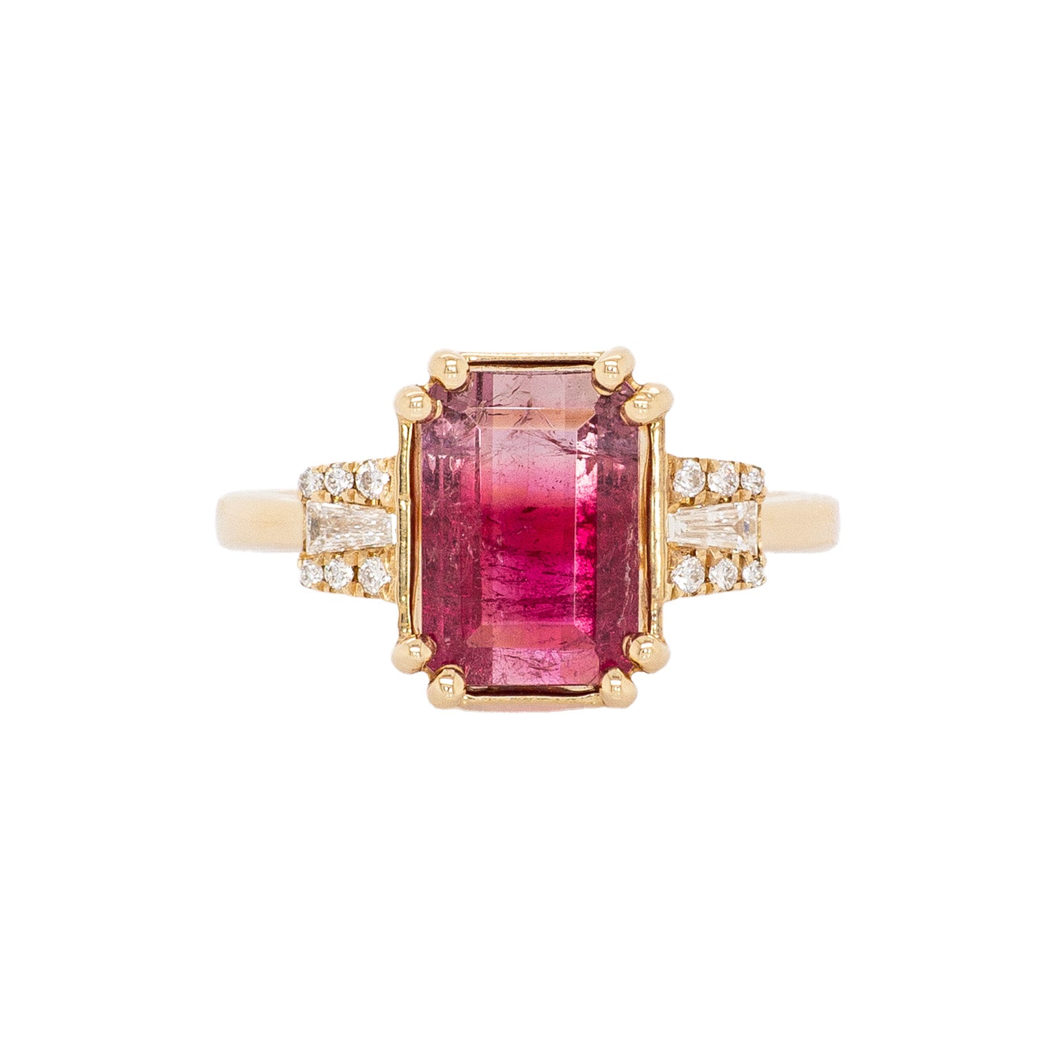 Lumi 14k Solid Gold Bi-color Tourmaline Ring with Natural Diamond Accents | Emerald cut 10.5x8mm