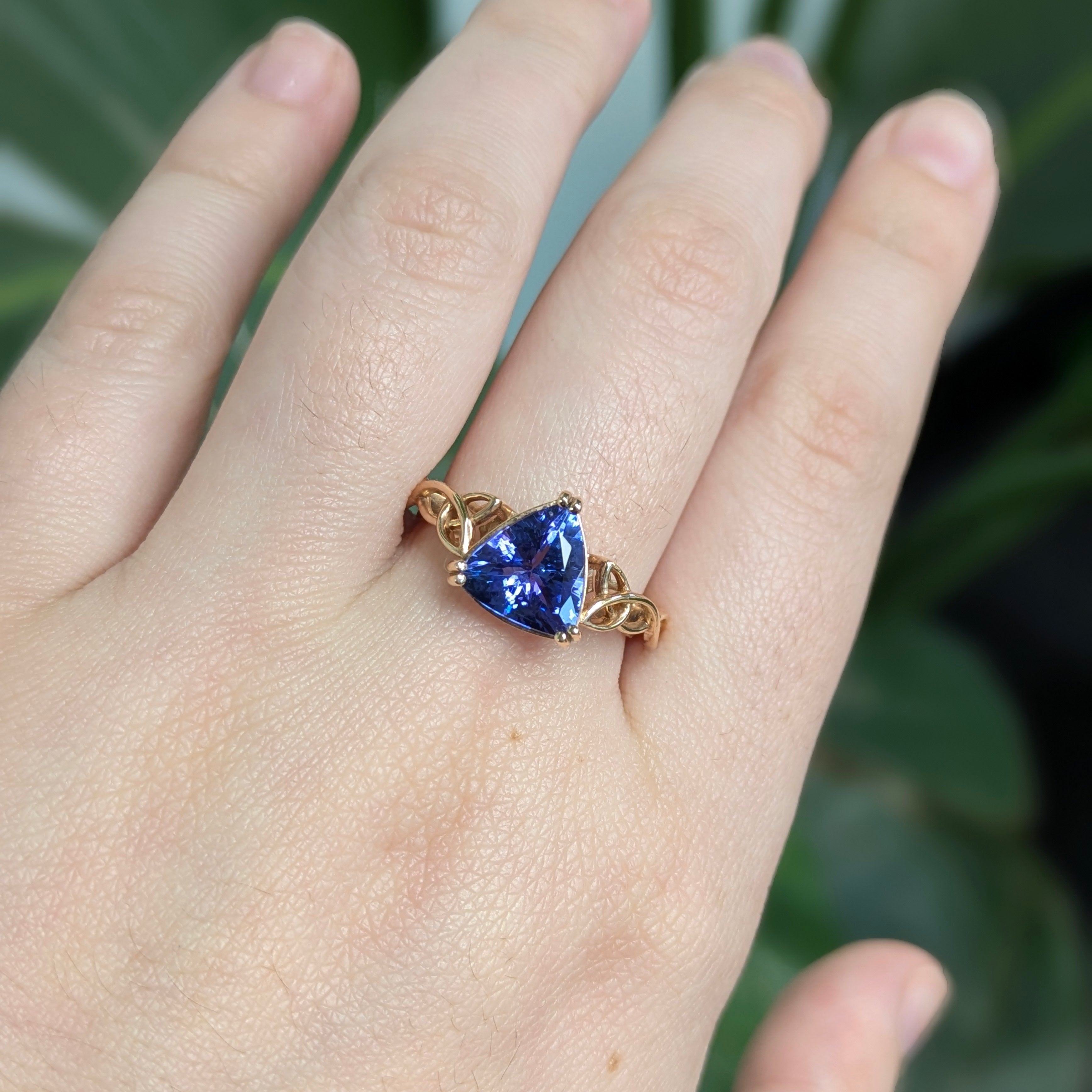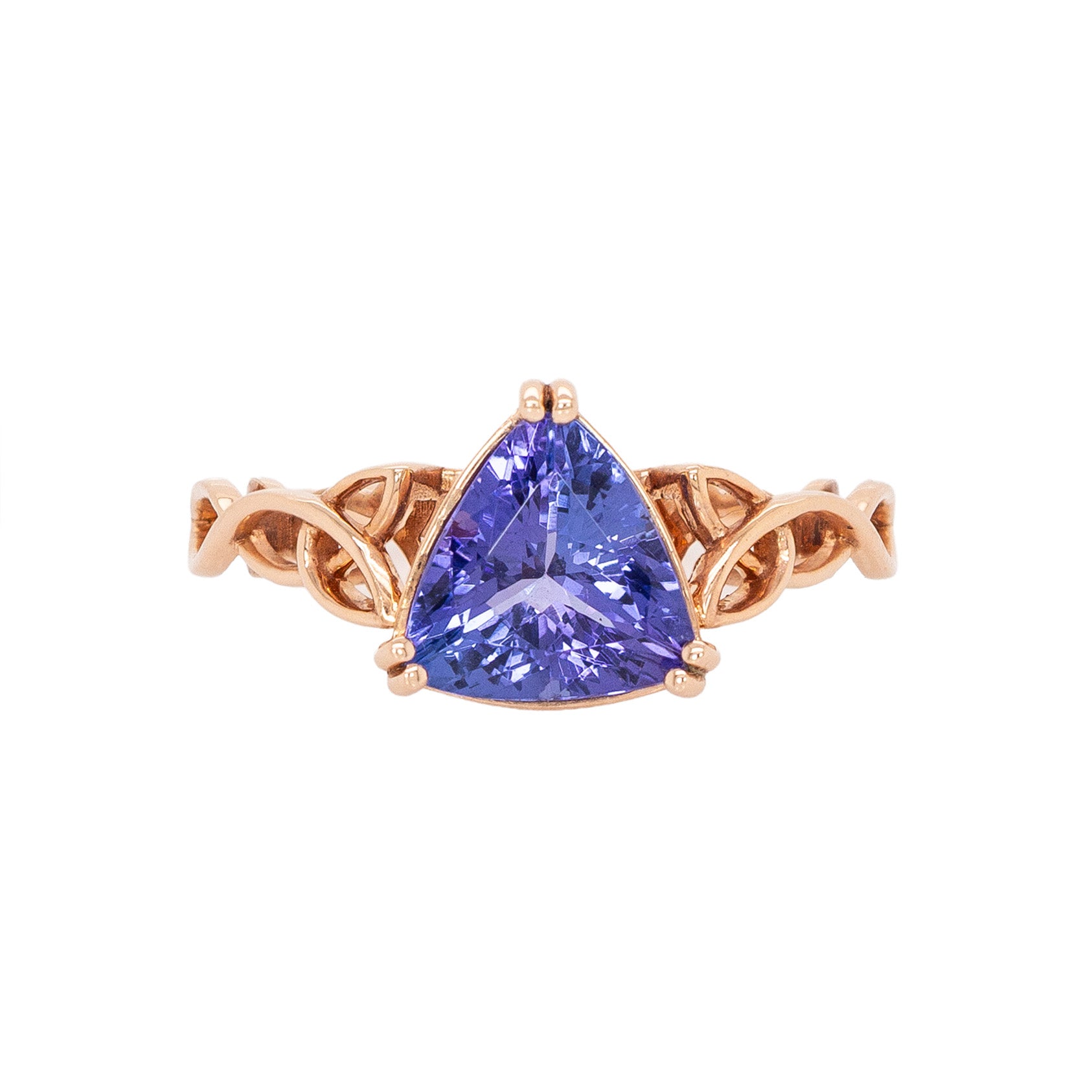 Dahlia Solid 14k Rose Gold Tanzanite Ring | Trillion Shaped, 9mm | Celtic love Knot Shank