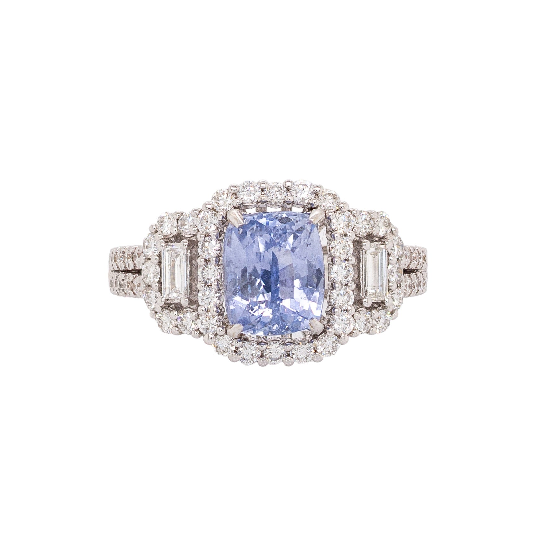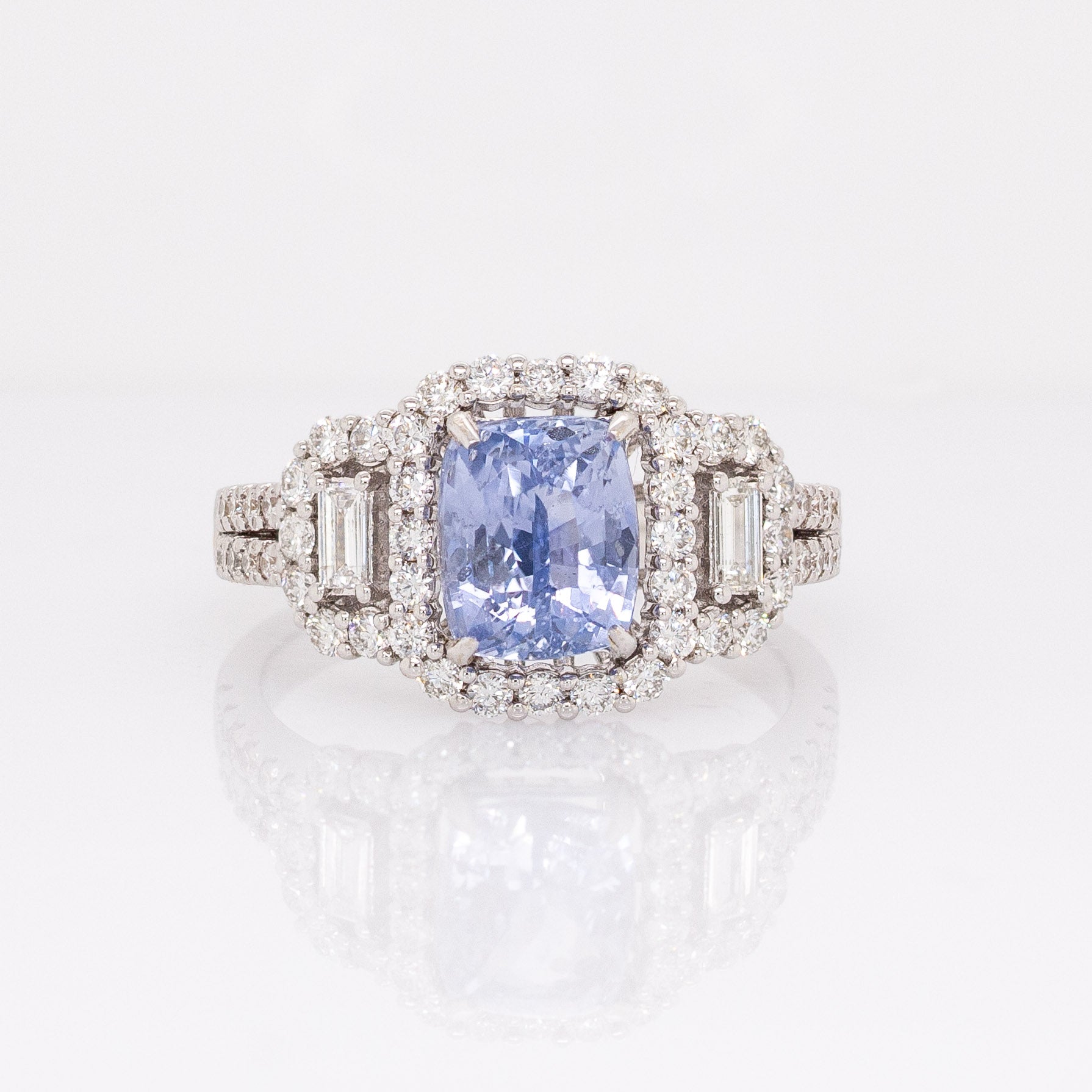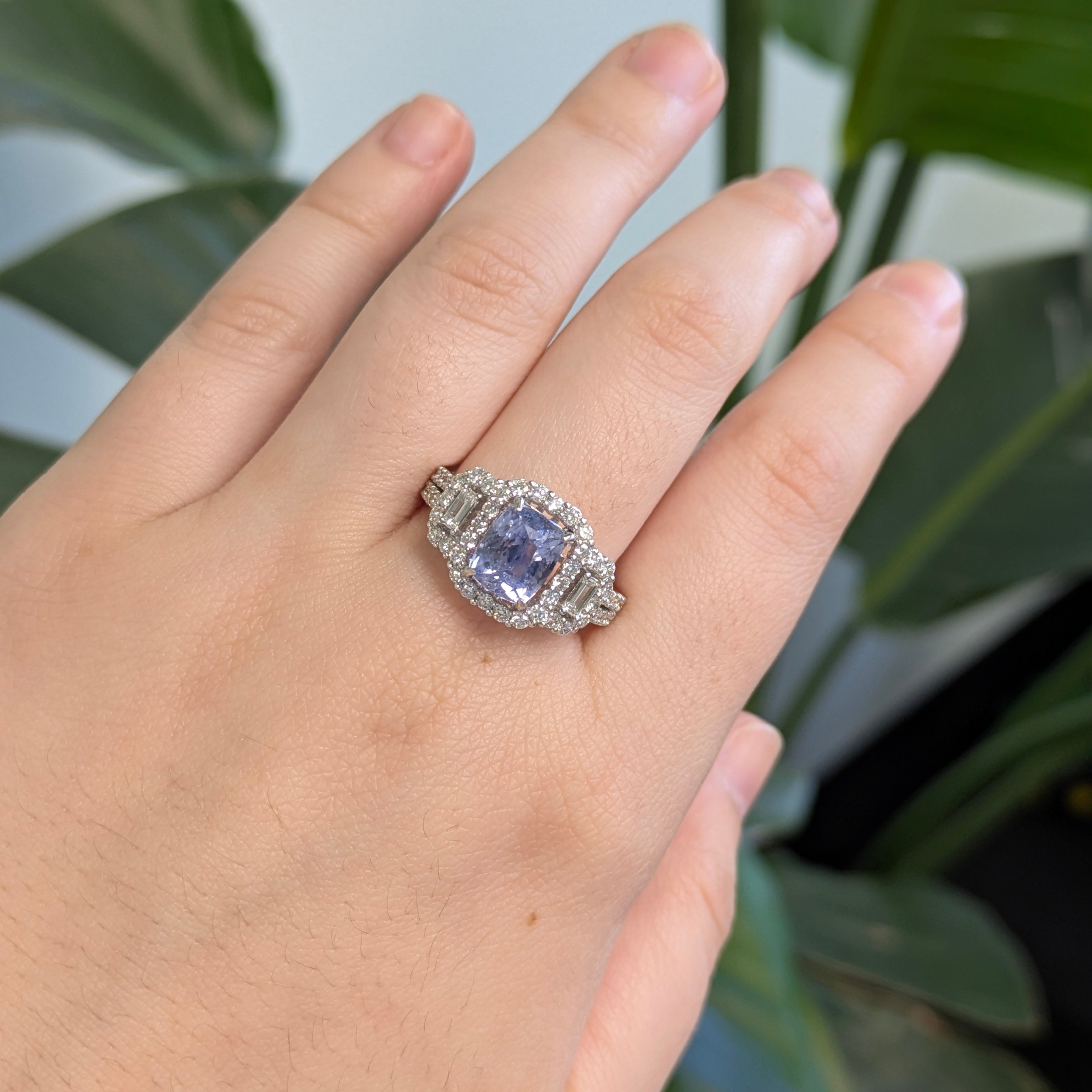 Cinderella Solid 14k White Gold Cornflower Blue Sapphire Ring with Natural Diamond Accents | Emerald cut, 8x7mm