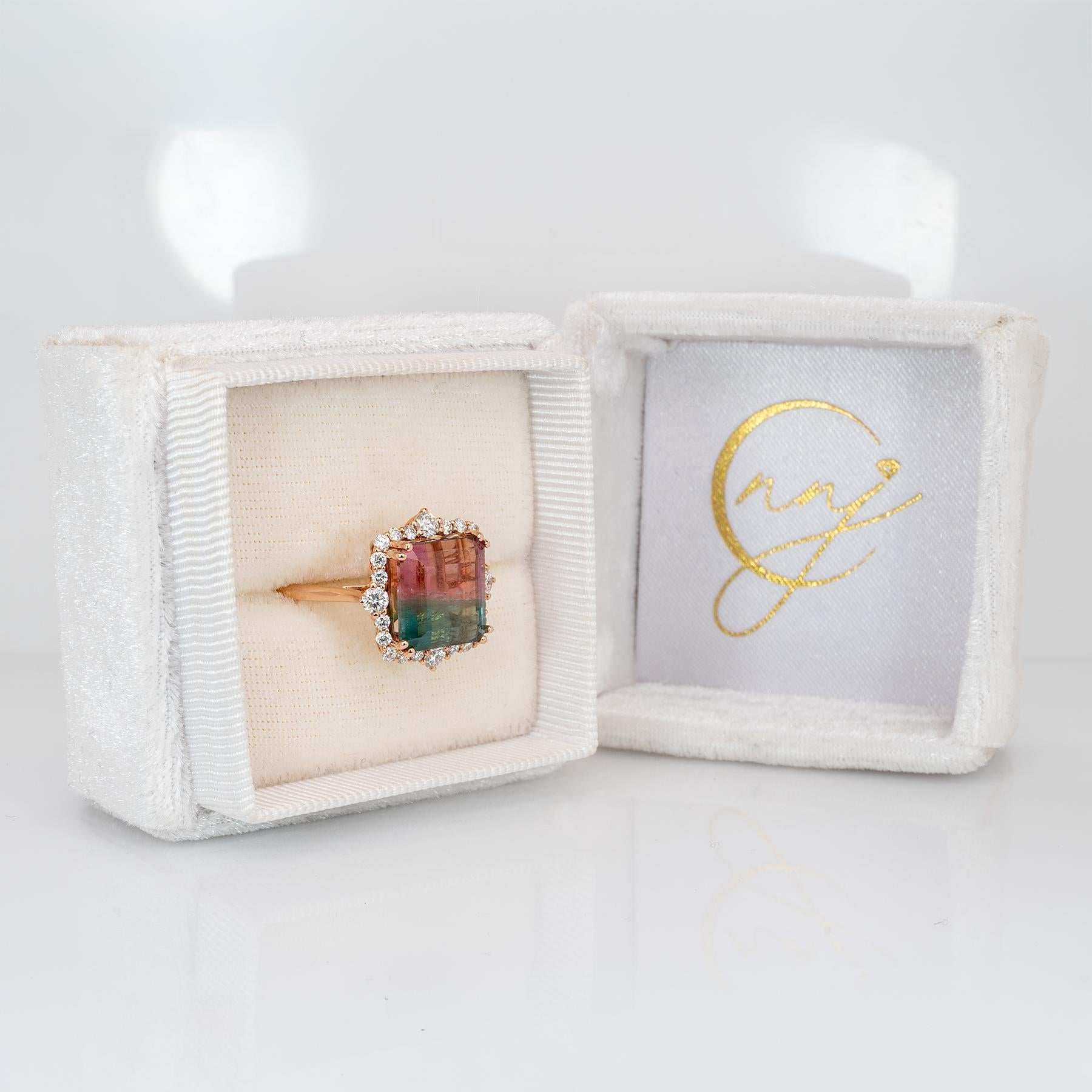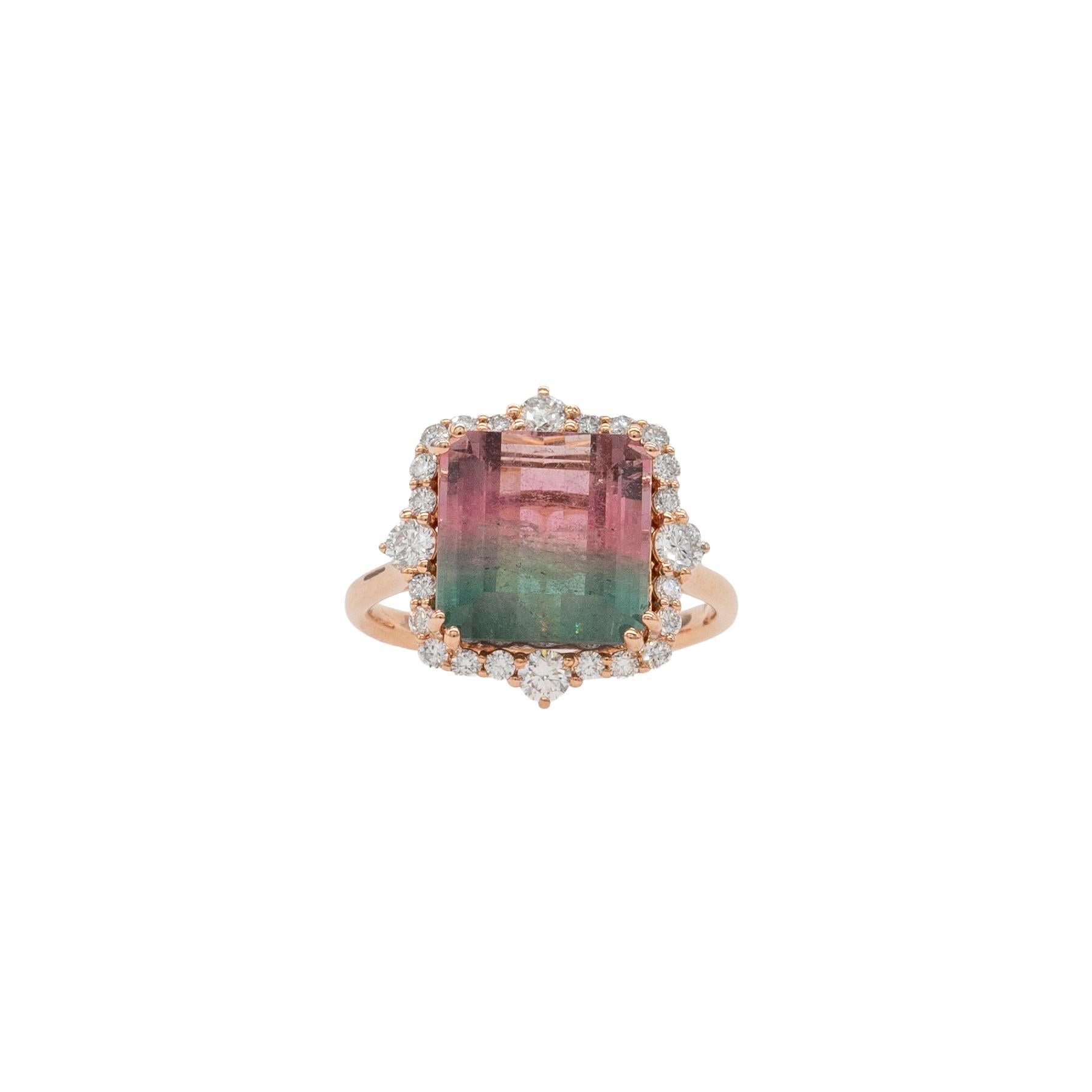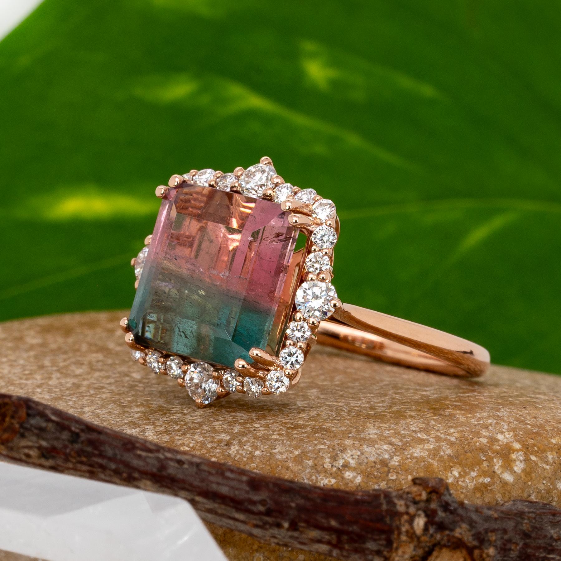 Striking 6.1-carat bi-color tourmaline showcased in a luxurious solid 14k gold setting.