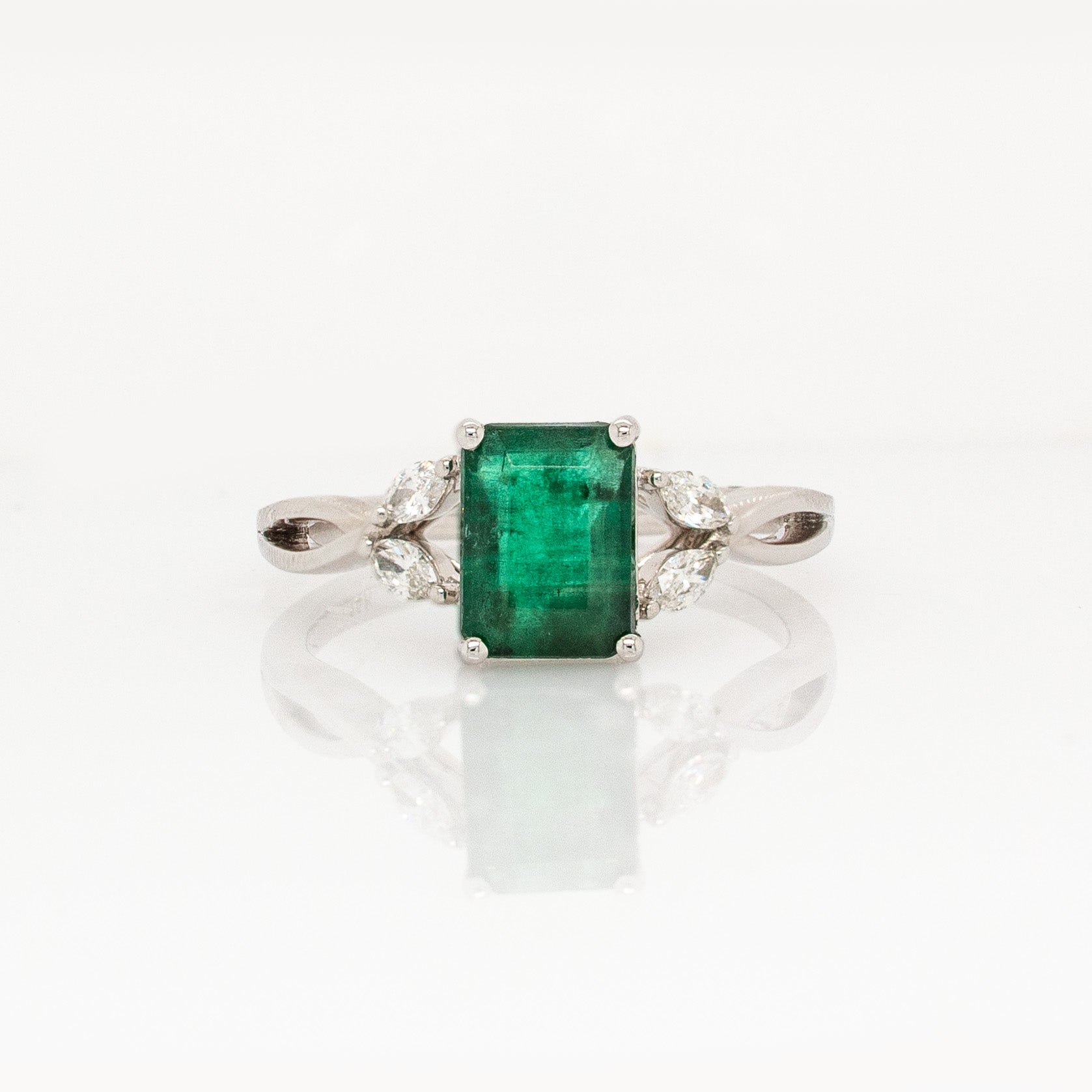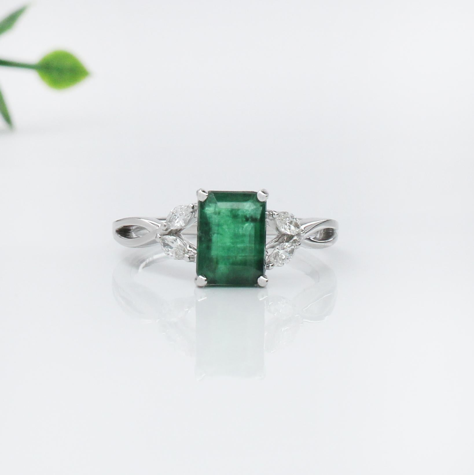 Make a statement with this 1.6ct Zambian emerald ring, featuring an 8x6mm emerald-cut center stone that dazzles from every angle. Accented with sparkling natural diamonds, it balances bold color with refined brilliance. Crafted in solid 14k gold, this ring radiates sophistication and timeless elegance. Perfect for adding a vibrant touch of luxury to any occasion.