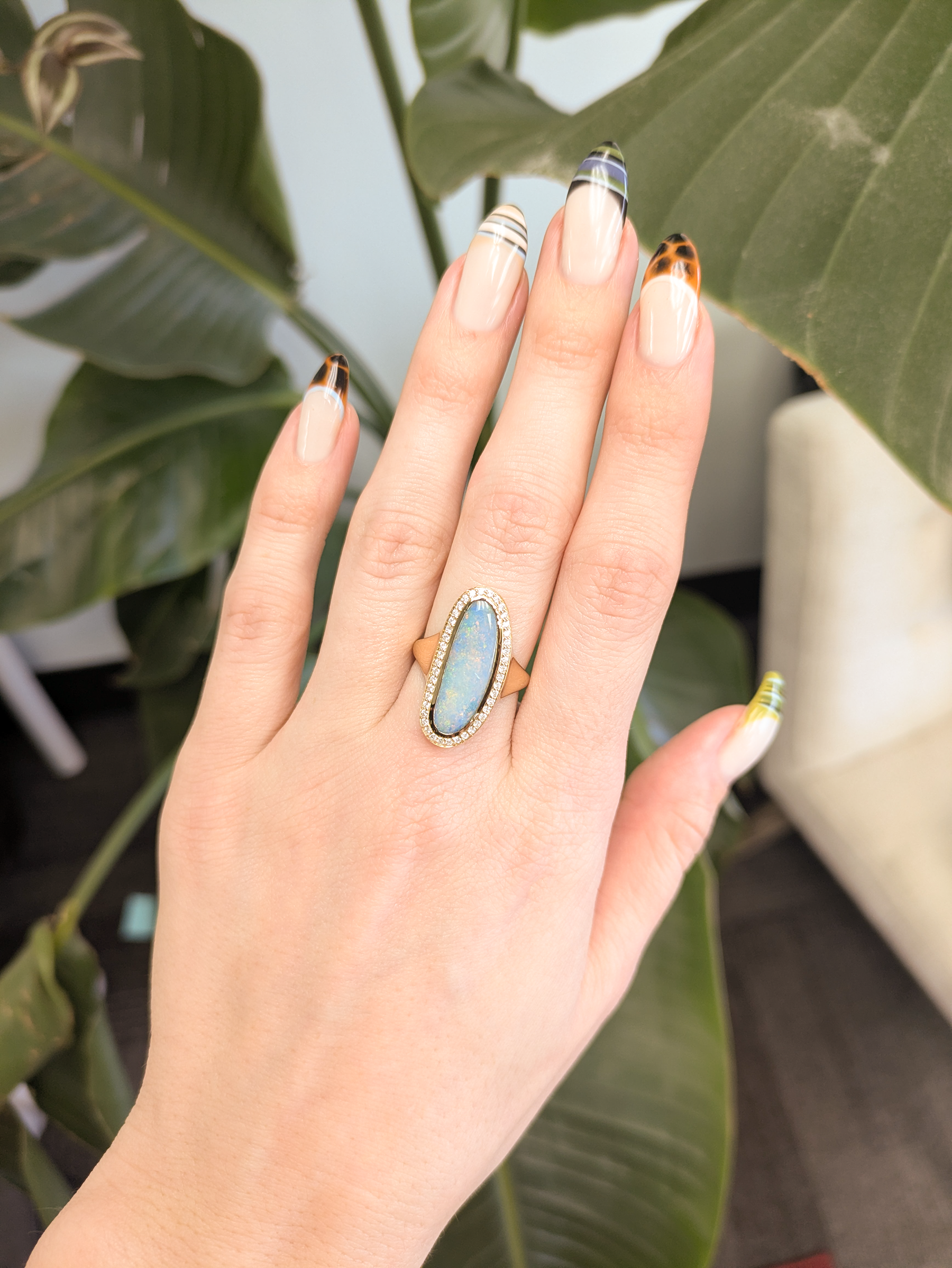 This 3.7cts boulder opal statement ring showcases a mesmerizing natural play-of-color that makes every glance unforgettable. Accented with sparkling natural diamonds, it delivers the perfect balance of boldness and elegance. Crafted in solid 14k gold, the setting enhances the opal’s raw beauty while offering lasting quality. A true one-of-a-kind piece designed for those who love jewelry with attitude and presence.
