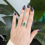 This stunning ring features a 1.7 carat Colombian emerald, beautifully cut in a pear shape measuring 12x7mm.