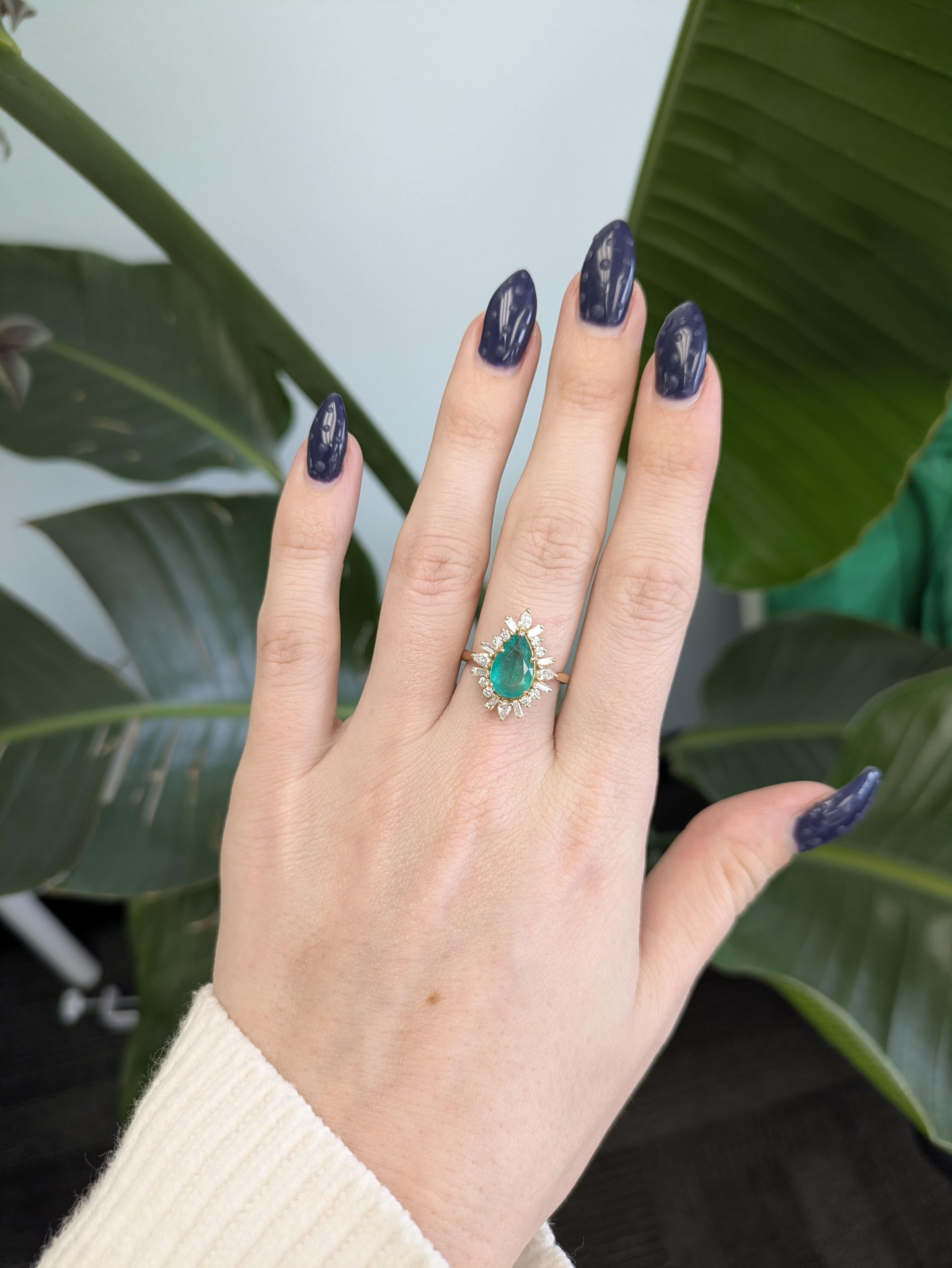 Lysette Solid 14k Gold Colombian Emerald Ring with Natural Diamonds, Pear 12x7mm