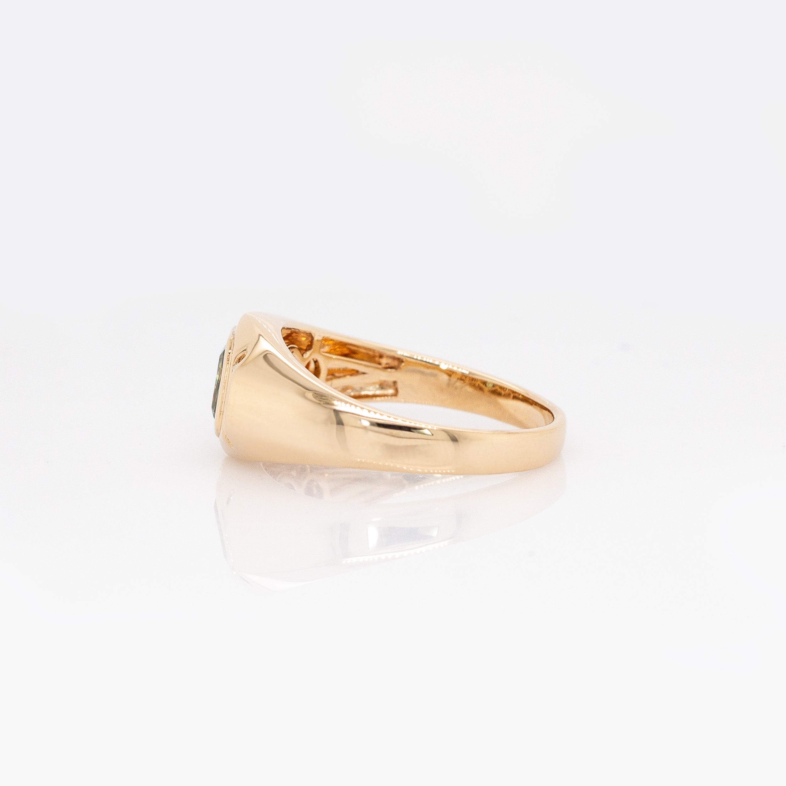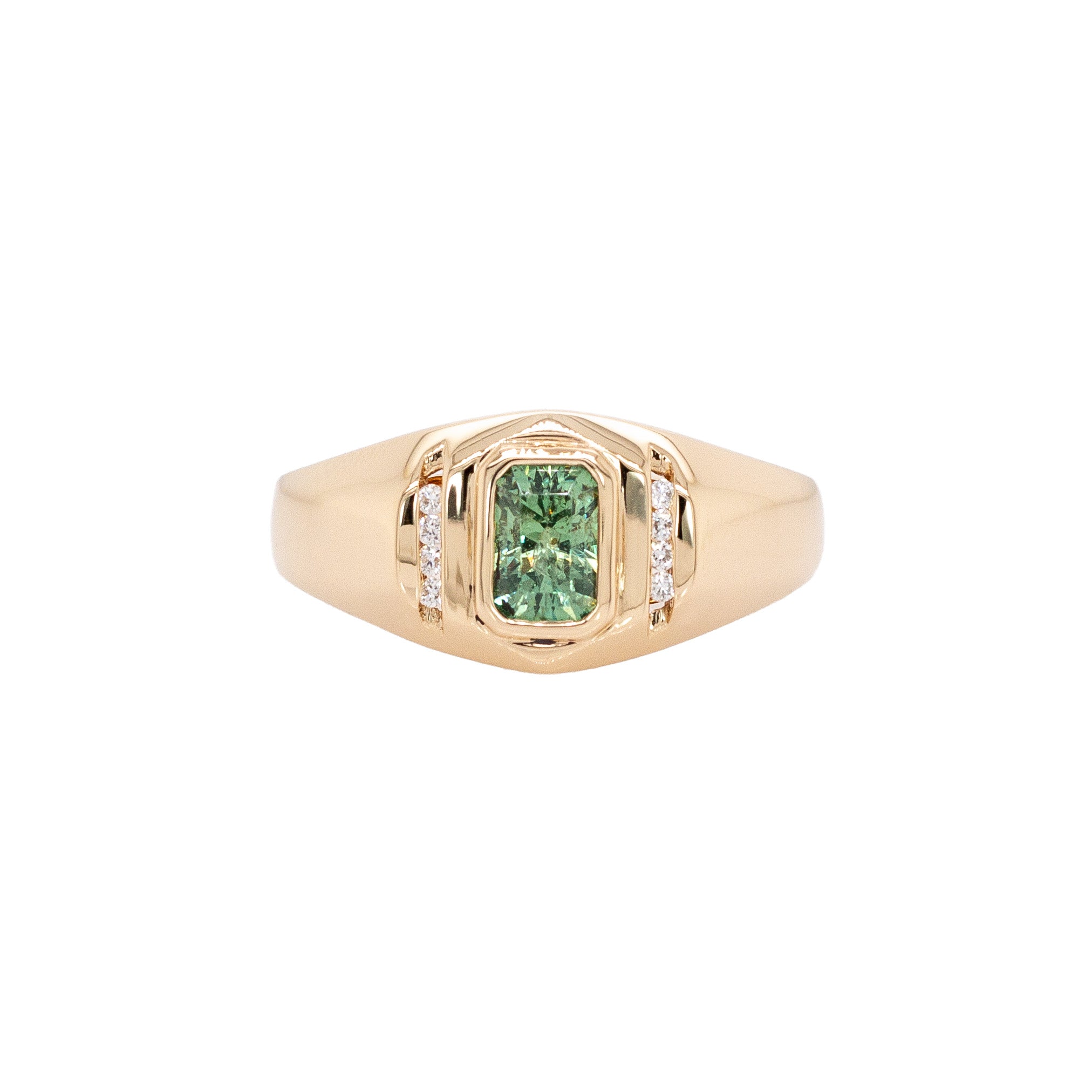 Radiating a rare and captivating brilliance, this 6x4mm emerald-cut Demantoid from the legendary Green Dragon Mine showcases one of the world’s most vibrant and sought-after greens. Its extraordinary fire is beautifully complemented by natural diamond accents, each chosen to enhance the gem’s radiance. Expertly crafted in solid 14K gold, the setting highlights the Demantoid’s unmatched sparkle and depth of color. Timeless and elegant, this piece is a celebration of nature’s artistry and fine craftsmanship—an heirloom-worthy treasure that transcends trends.