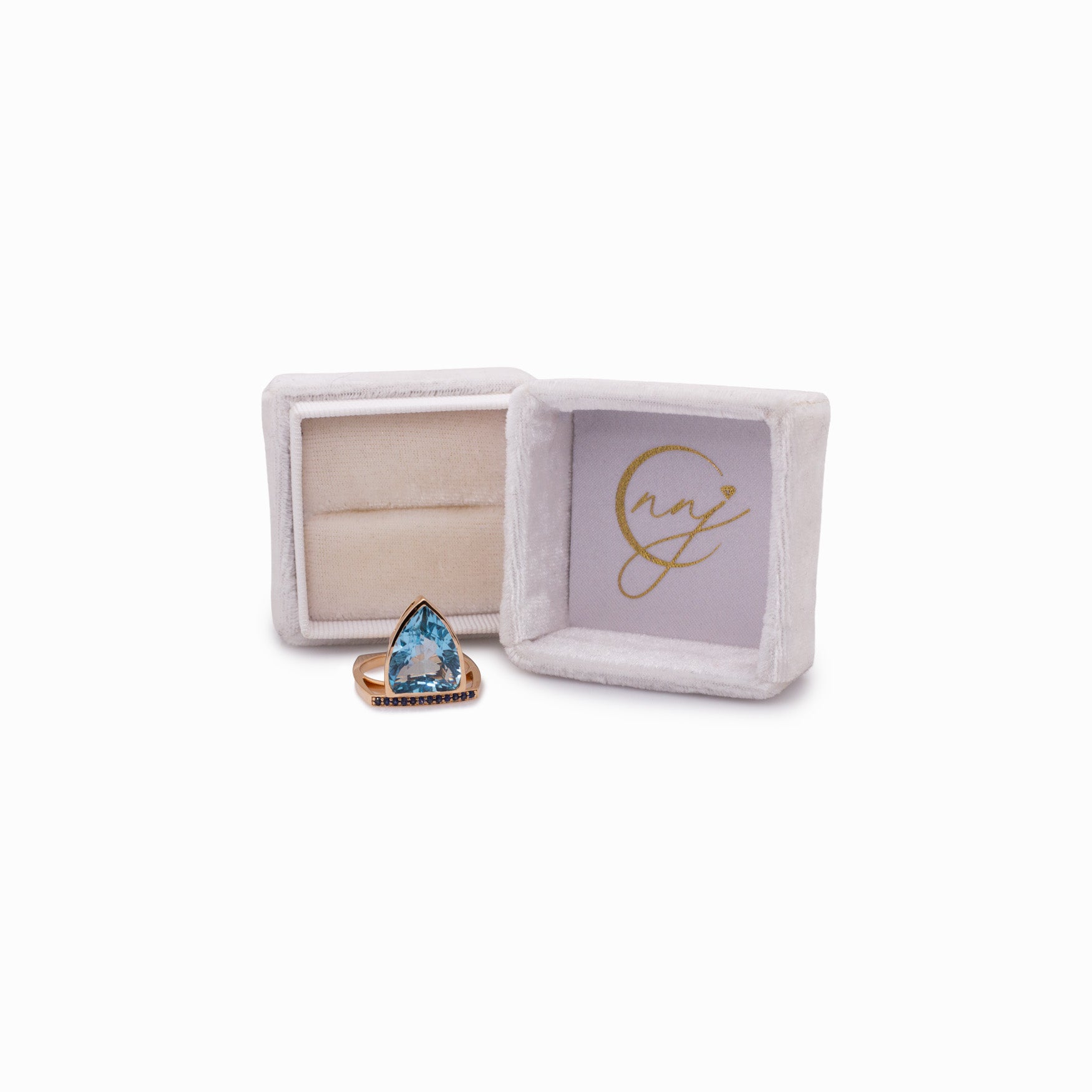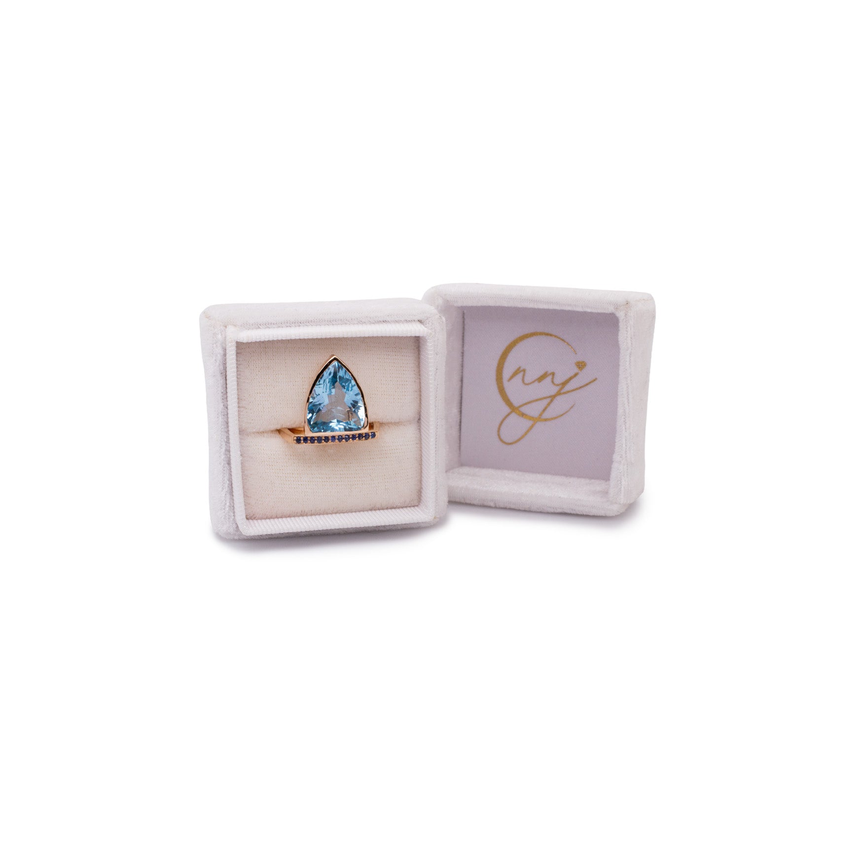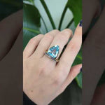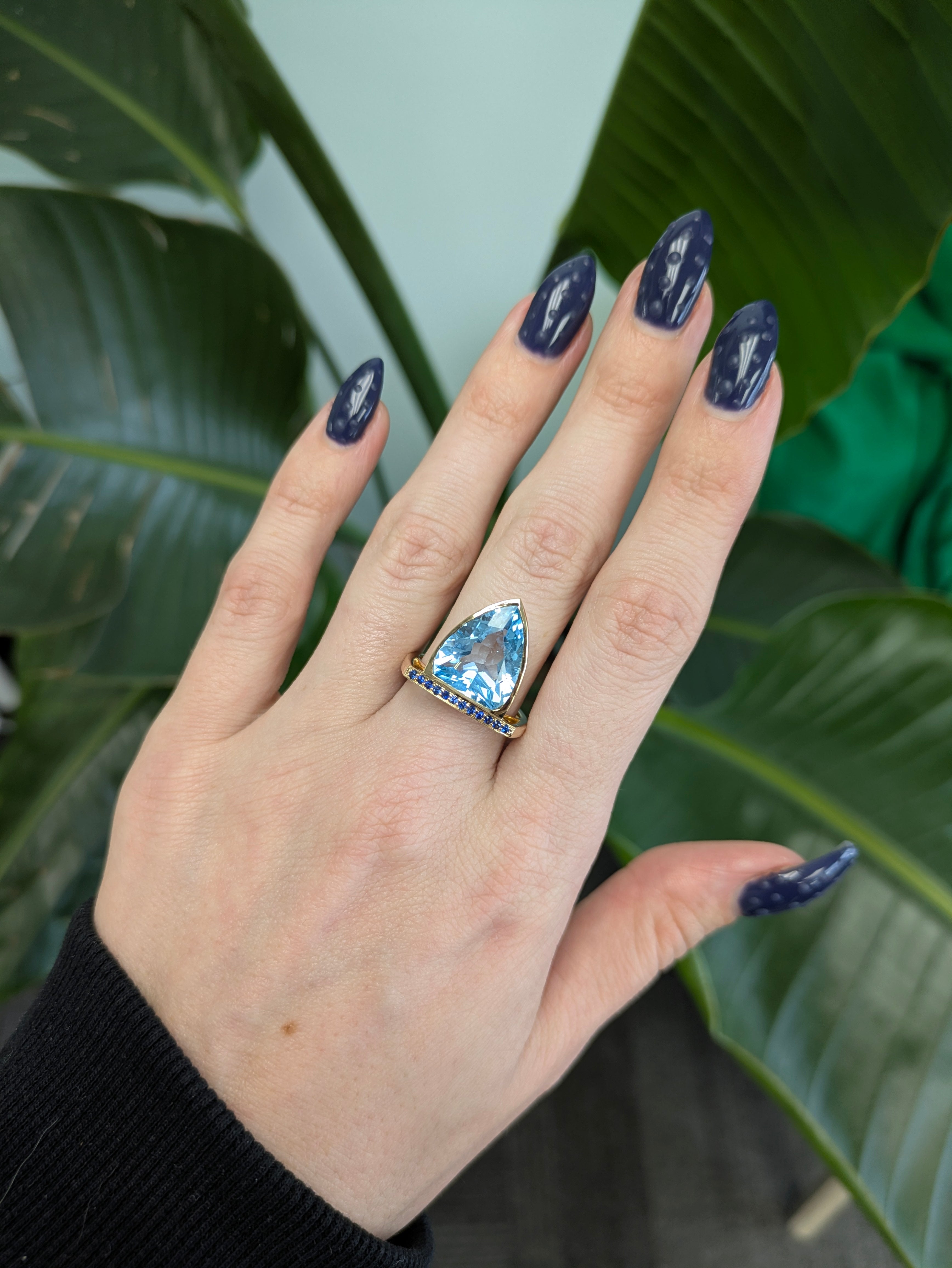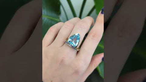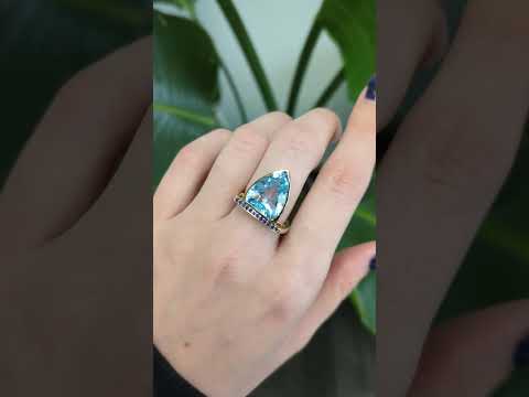 Featuring a striking Swiss topaz in a bold trillion cut (15 × 12.5 mm), this ring is accented with deep blue sapphires that enhance its brilliance and contrast. Crafted in luxurious solid 14k gold, it offers lasting beauty and a refined finish, making it a standout statement piece with a modern yet elegant edge.