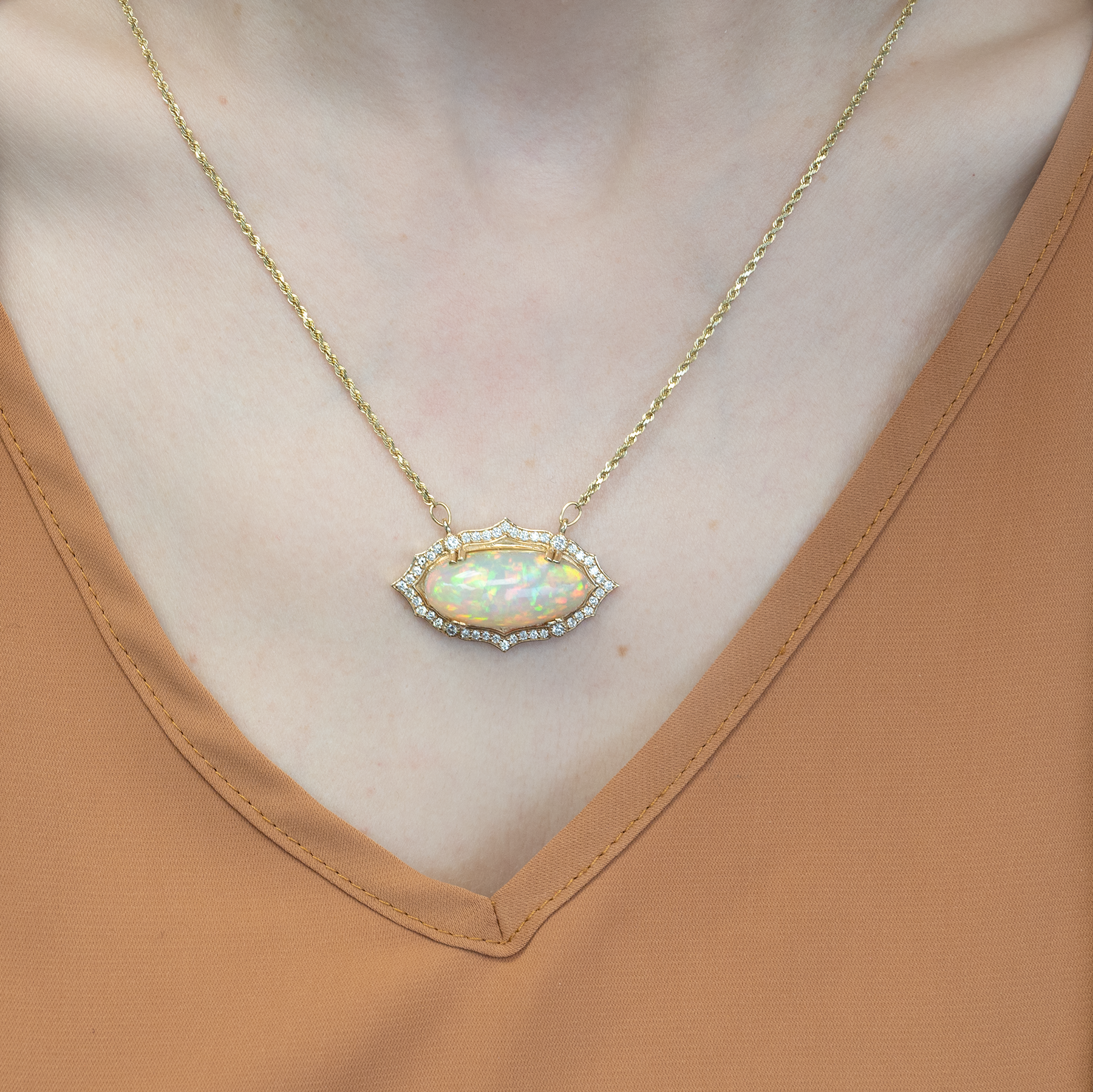 11.2 Ct Natural Opal Necklace with Diamond Accents – Solid 14K Gold Opal Pendant Necklace with Attached Chain