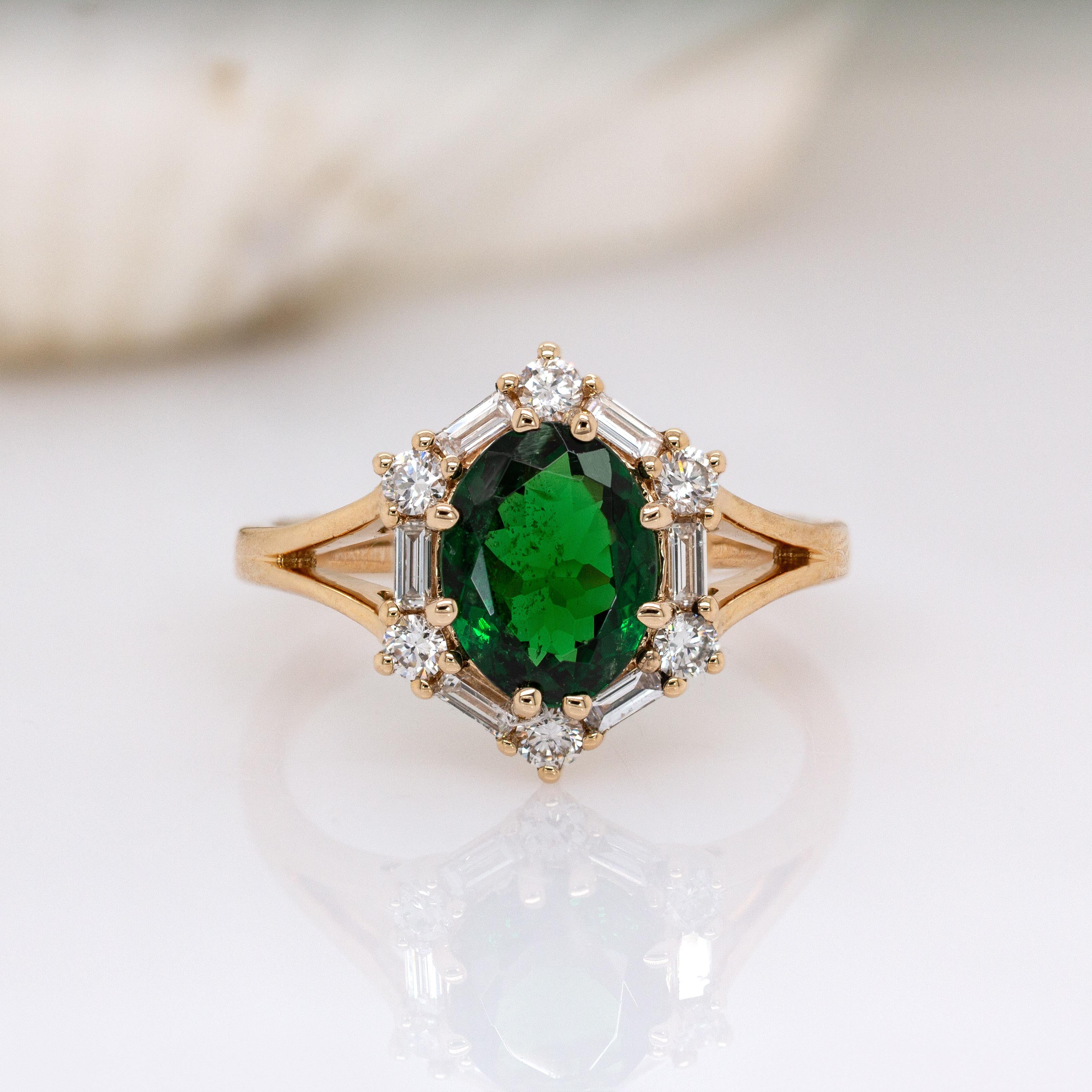 Prissy 14K Yellow Gold Tsavorite and Diamond Ring | OV 9x7mm