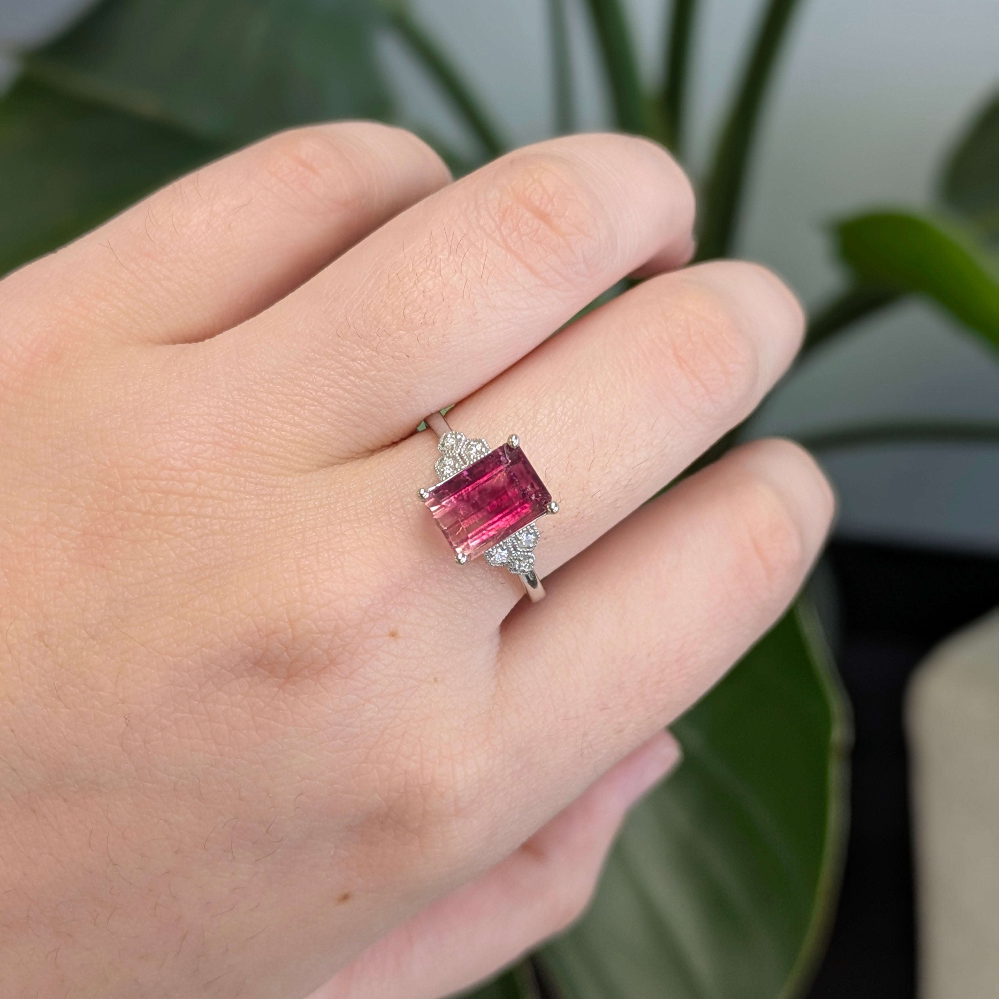 Estate 14K Solid White Gold Rubellite Tourmaline Ring and Diamond Ring | RD 6mm