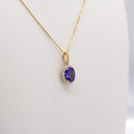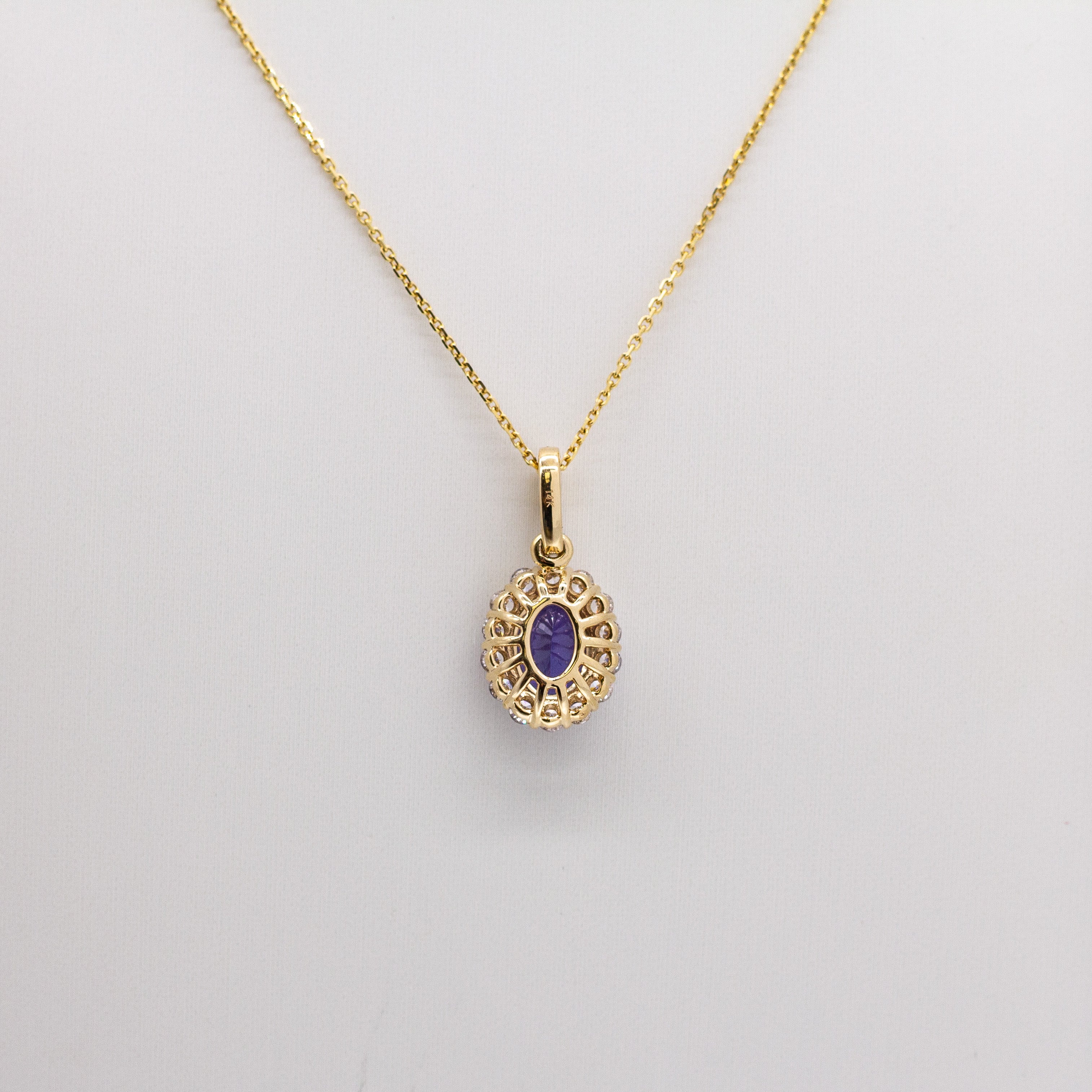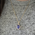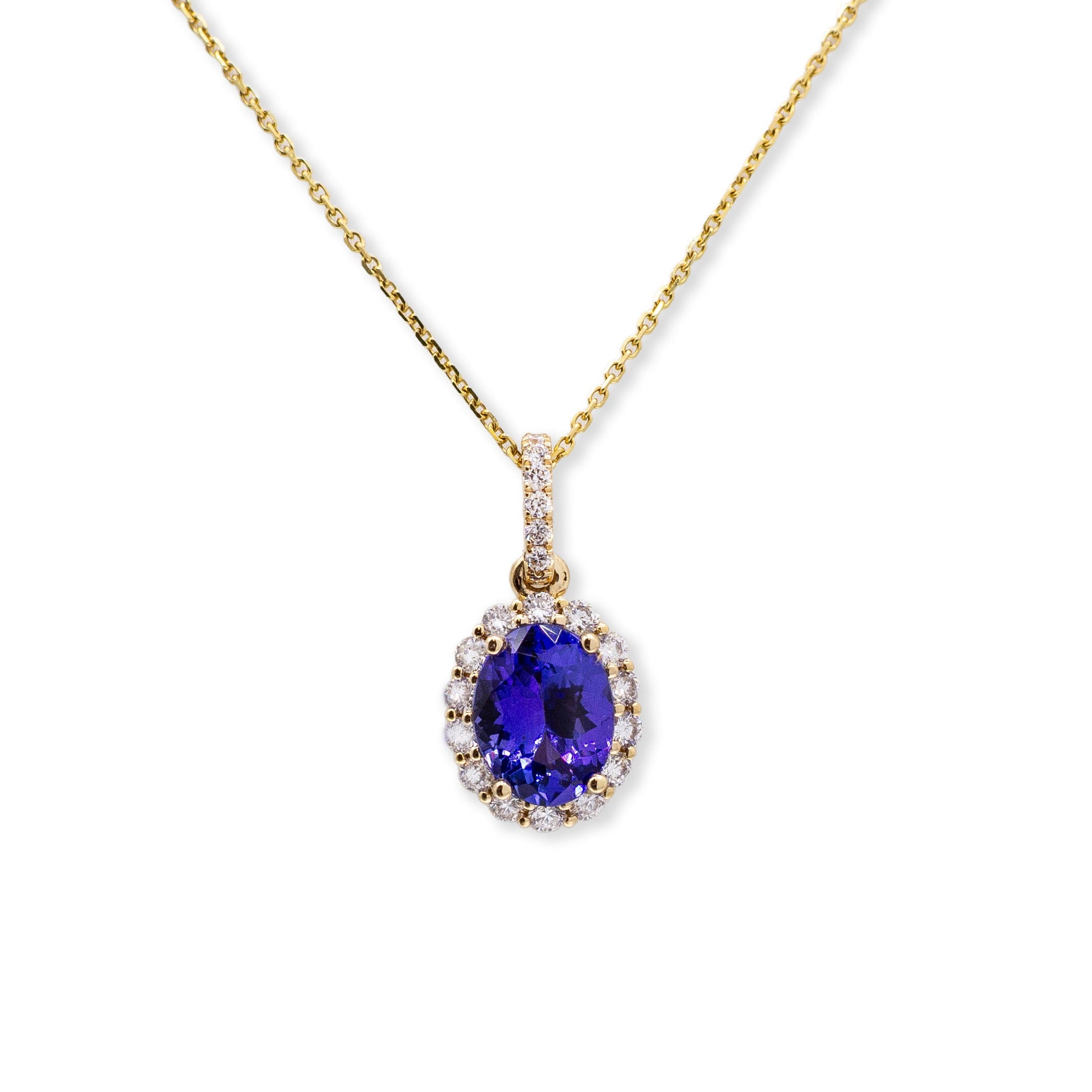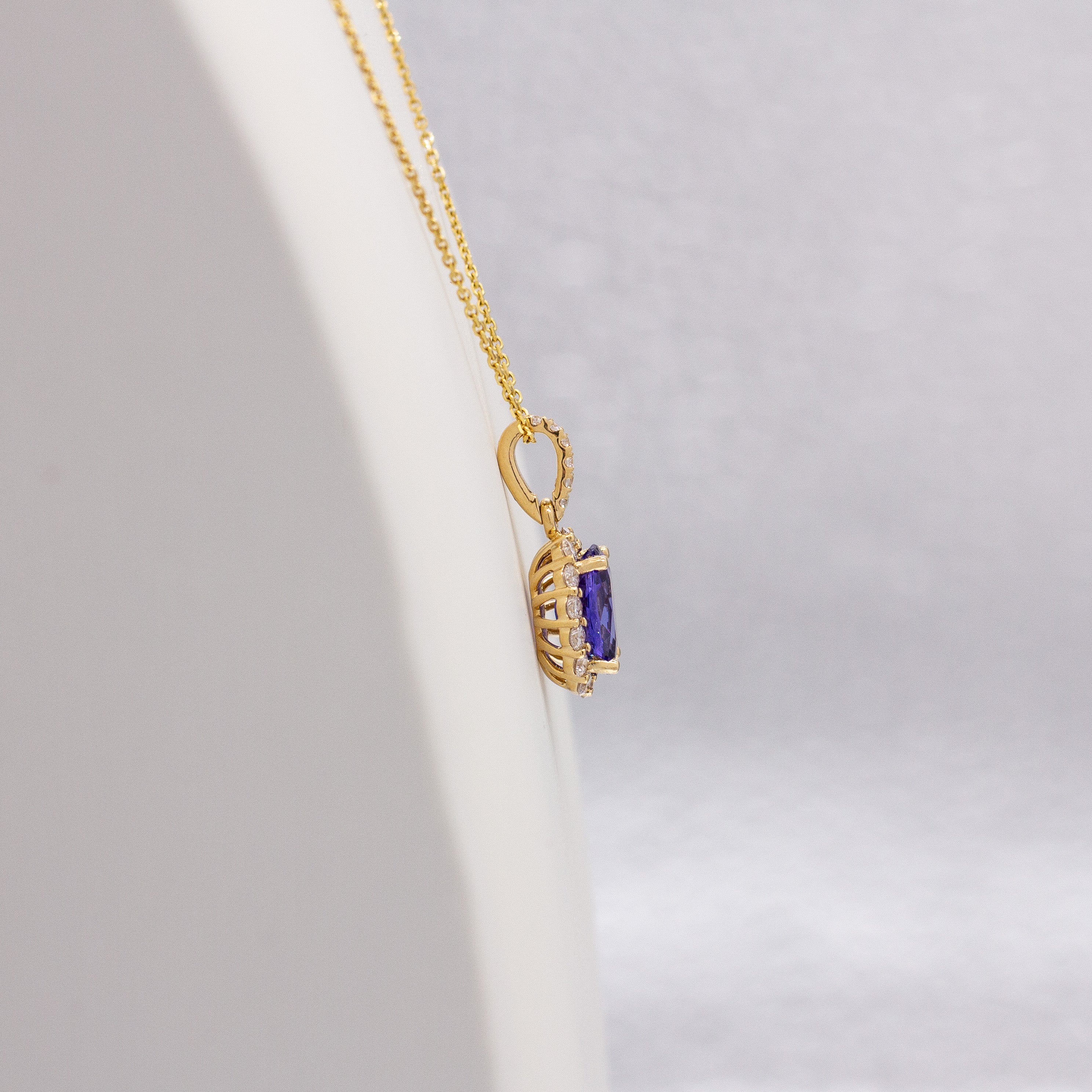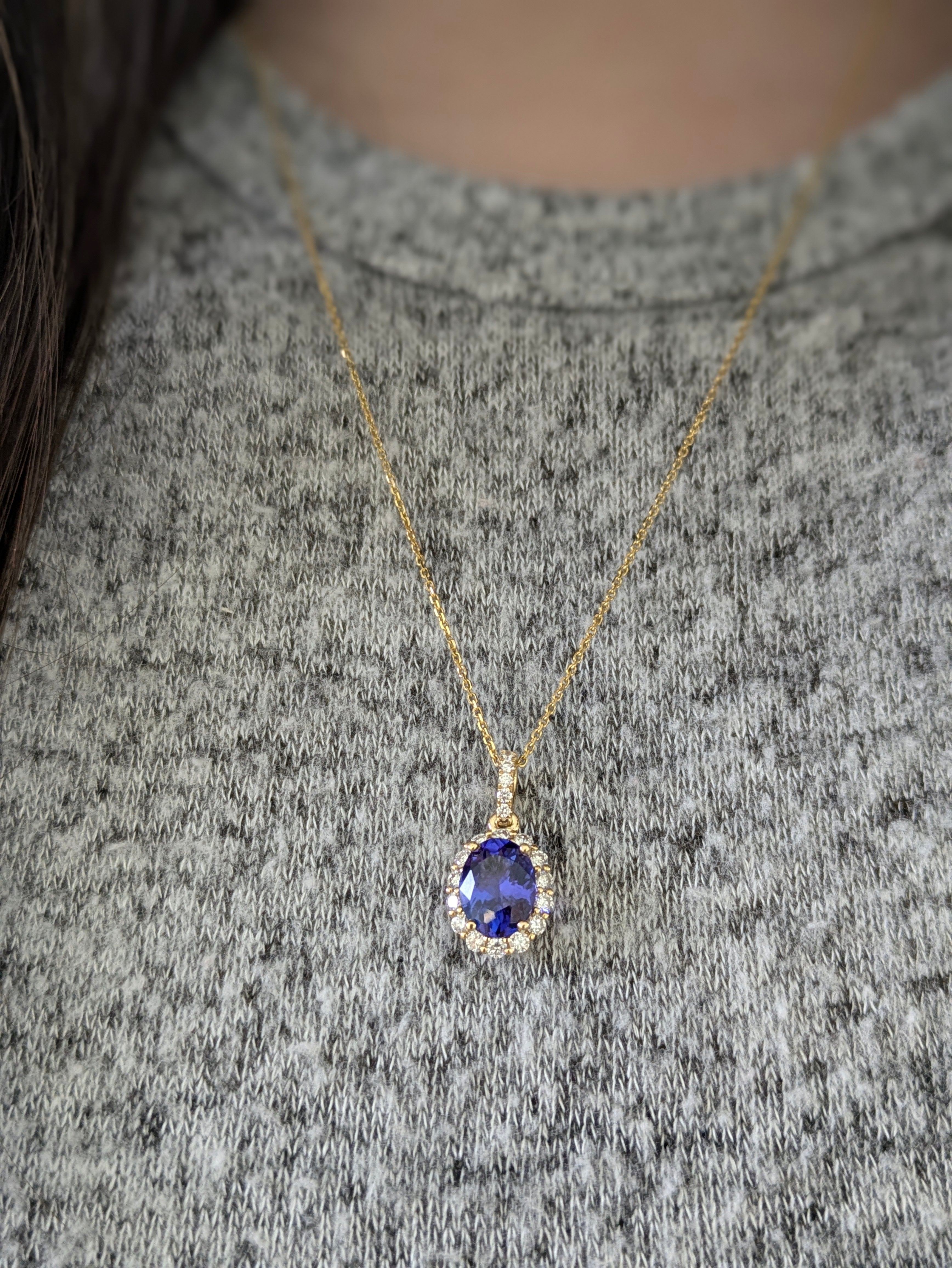 Make a statement with this stunning oval tanzanite pendant, set in 14k solid yellow gold and surrounded by a radiant halo of natural diamond accents. The vibrant blue of the tanzanite beautifully contrasts with the warm golden setting, creating a luxurious and eye-catching look. Perfect for elevating both everyday outfits and special occasion ensembles, this pendant exudes timeless elegance. A versatile piece that blends classic sophistication with modern charm, it’s a must-have addition to any jewelry collection.