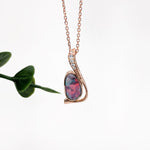 This beautifully crafted pendant showcases a striking 0.71ct Boulder Opal, cut in a unique fancy shape and measuring 8x4.7mm. Known for its captivating play of color, the opal is the star of the piece, radiating natural vibrancy and character. It is elegantly set in 1.0 gram of rich 14k gold, providing a warm and timeless backdrop. Enhancing the design are five delicately set diamonds with a total weight of 0.03cttw, adding a subtle sparkle and touch of luxury. Perfect for those who appreciate one-of-a-kind gemstones and refined craftsmanship, this pendant is both artistic and timeless.