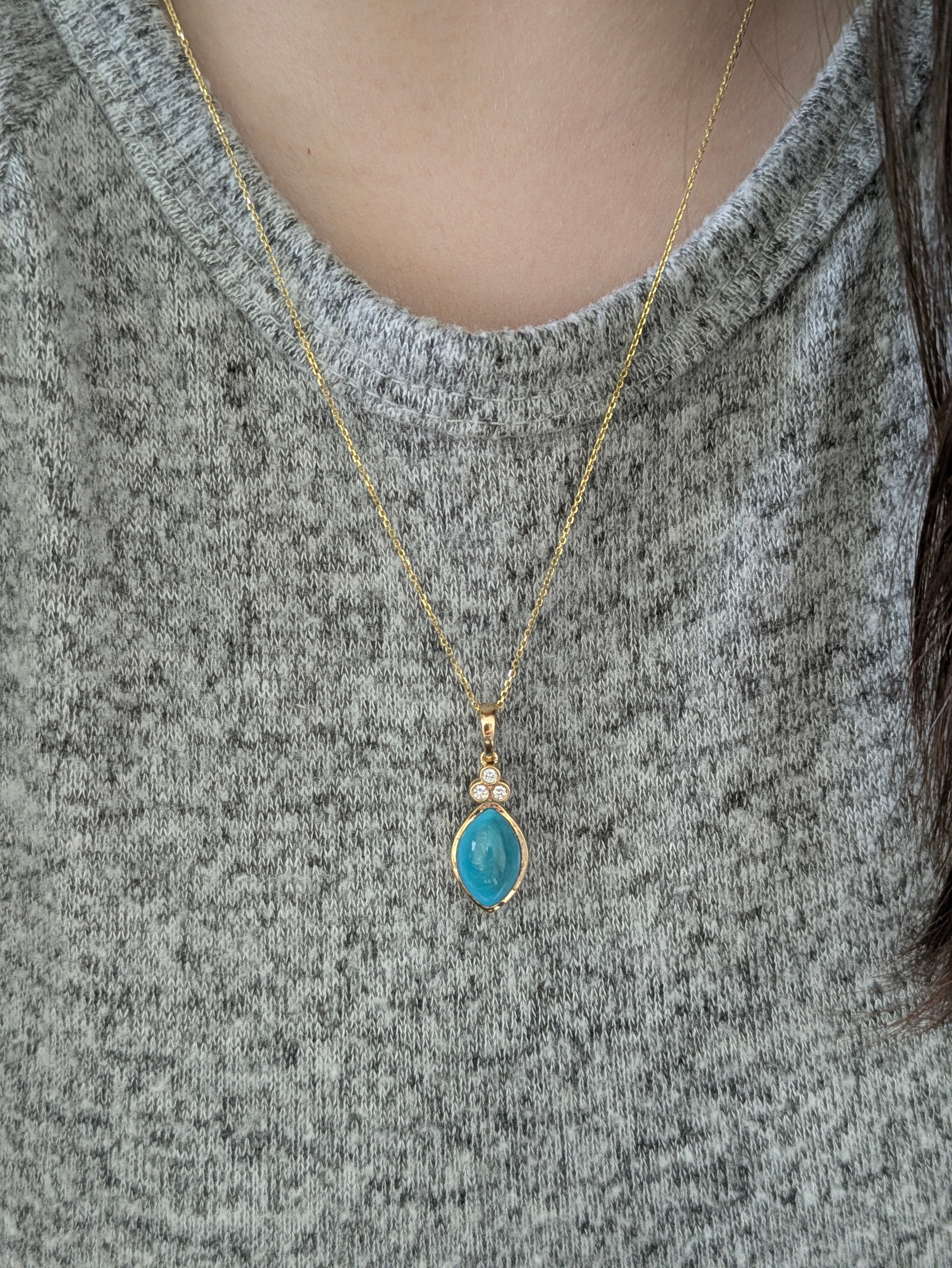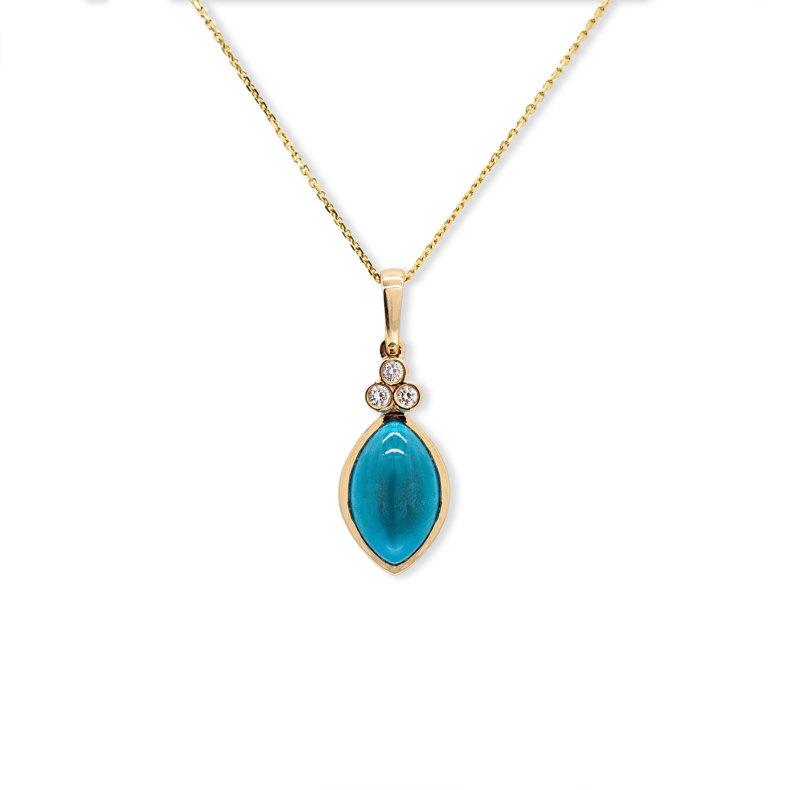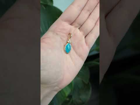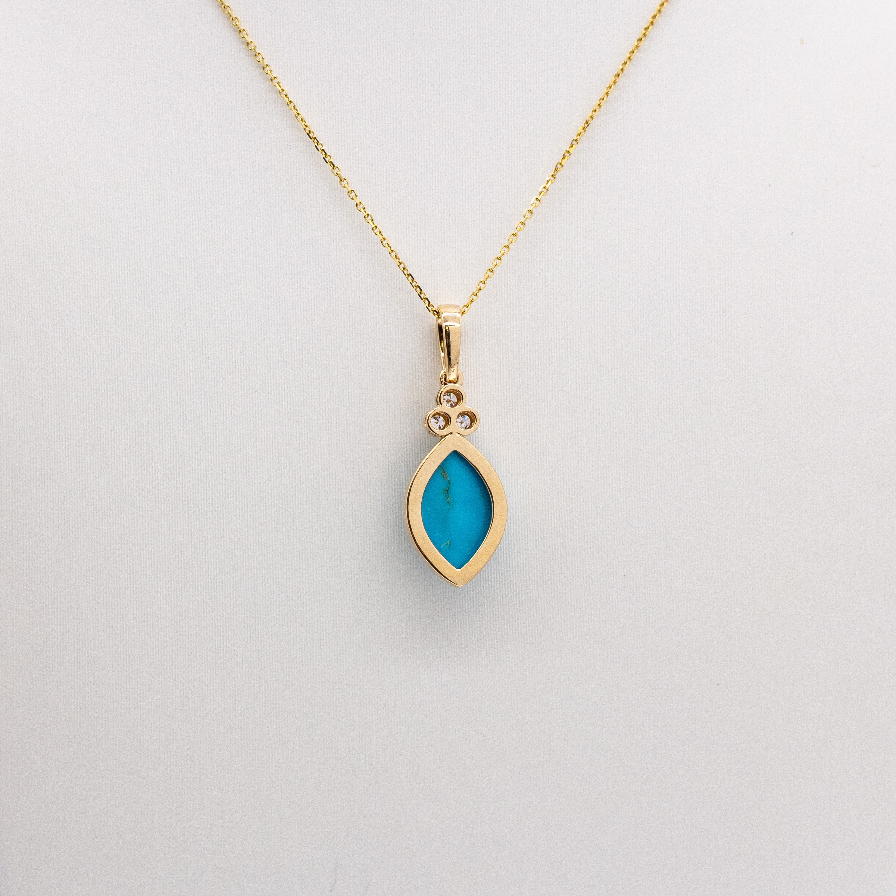This stunning pendant features a marquise-shaped turquoise center stone, celebrated for its vivid blue-green hue. Natural diamond accents add a sparkling contrast, enhancing its elegant design. Crafted in 14K solid yellow gold, the piece radiates warmth and sophistication. Perfect for both everyday wear and special occasions, it effortlessly elevates any outfit with a touch of luxury.