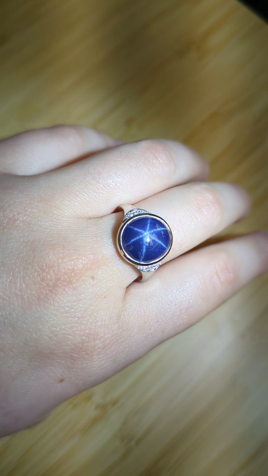 This exquisite ring features a captivating 8.57-carat oval star sapphire sourced from Ceylon, renowned for producing some of the finest sapphires in the world. Measuring 12.7x11mm, the center stone displays a beautiful natural asterism — a shimmering star that moves gracefully across the surface when viewed under light. Set in 14k gold (3.39g), the sapphire is accented by ten delicate diamonds with a total weight of 0.07cttw, adding a subtle sparkle that enhances the ring’s timeless charm. A truly unique piece, perfect for collectors or those seeking a one-of-a-kind statement ring.