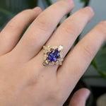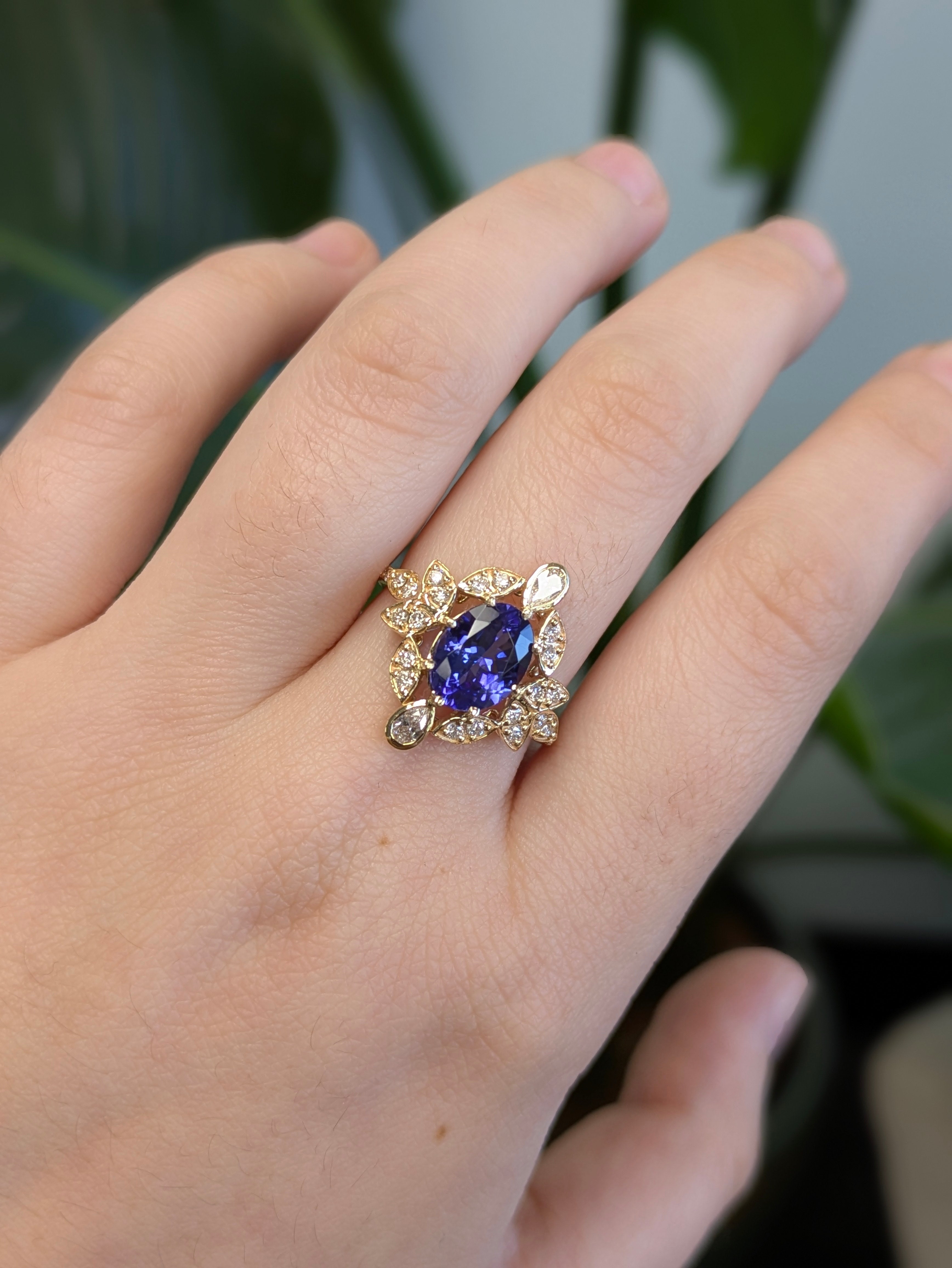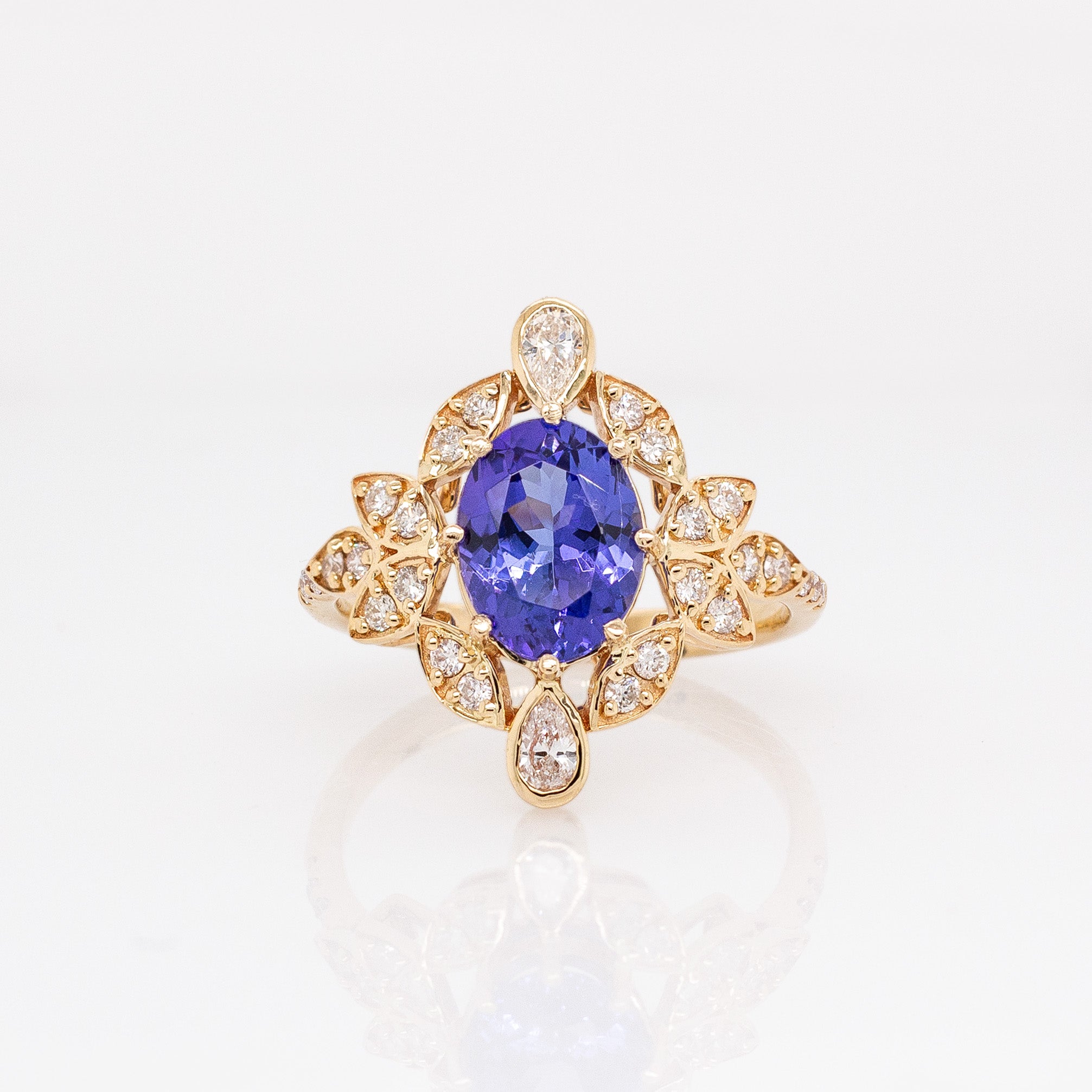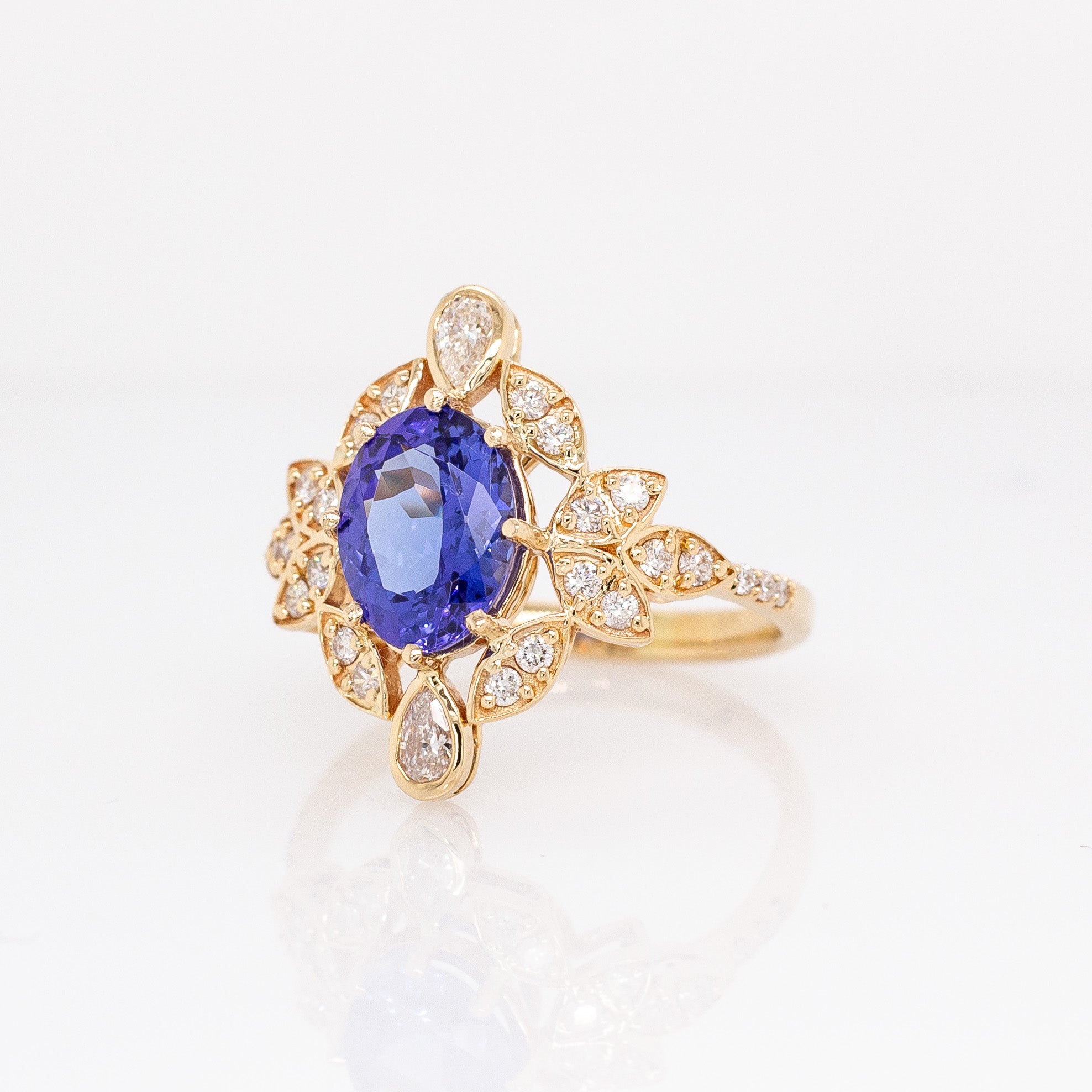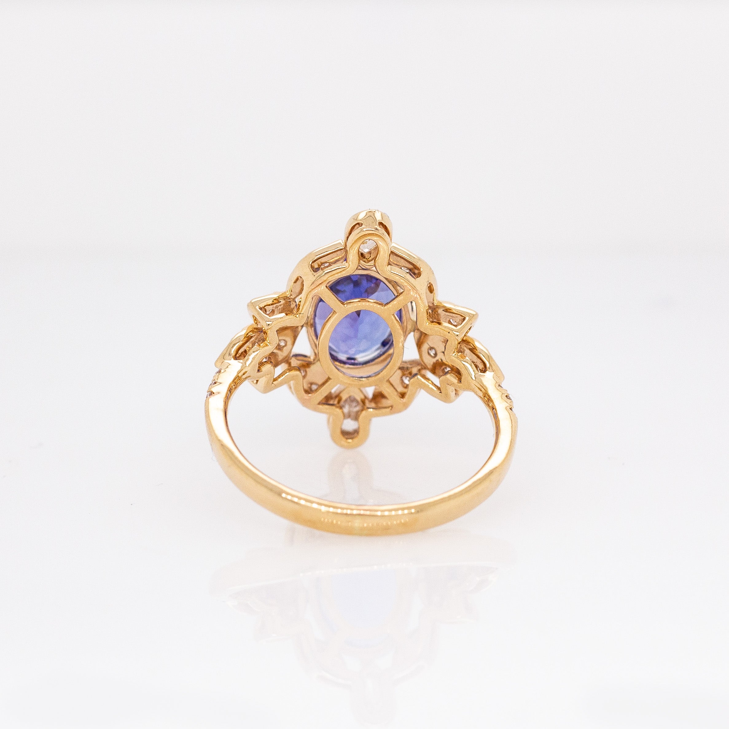 This exquisite 14K yellow gold ring showcases a mesmerizing oval-cut tanzanite as its centerpiece, glowing with vibrant blue-violet hues. Accented by sparkling natural diamonds, the design adds just the right touch of brilliance and elegance. The warm yellow gold setting beautifully enhances the rich colors of the tanzanite, creating a timeless piece perfect for any occasion. With its classic yet bold style, this ring is a true statement of sophistication and charm.