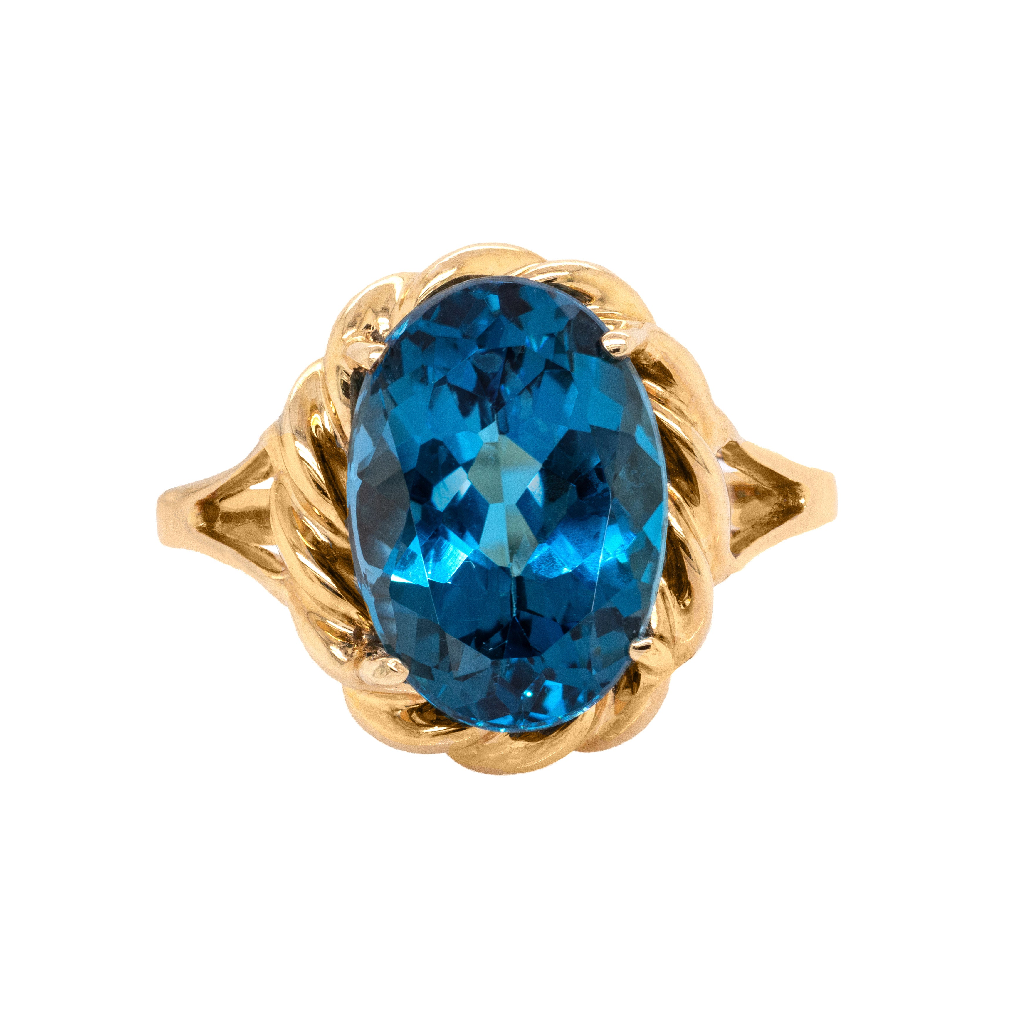 This exquisite estate ring features a stunning oval-cut London Blue Topaz as its centerpiece, radiating deep ocean hues. Crafted in rich 14K solid yellow gold, the setting beautifully complements the gemstone’s vibrant color. Its classic yet elegant design exudes timeless sophistication, perfect for both everyday wear and special occasions. A true heirloom-quality piece that captures refined luxury.