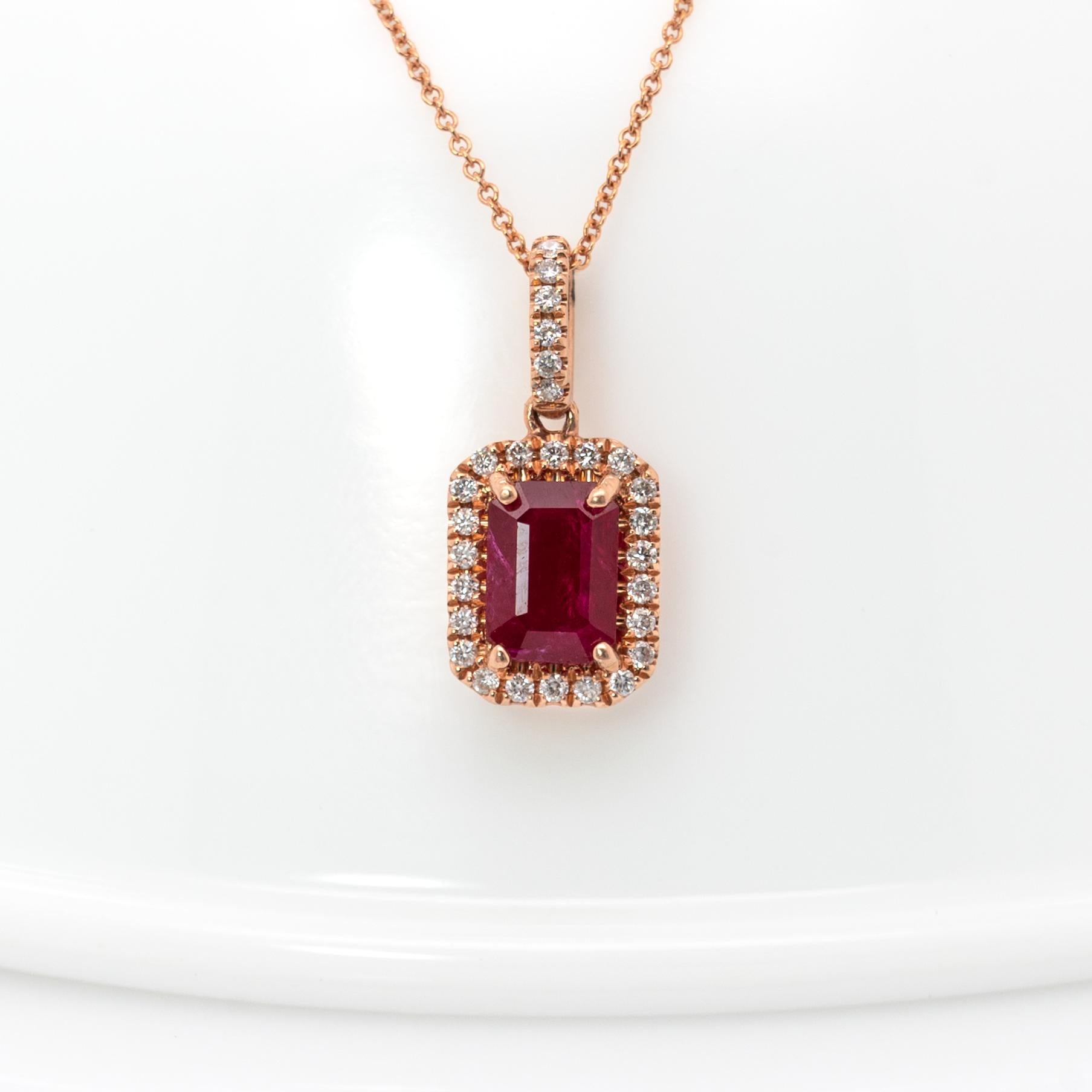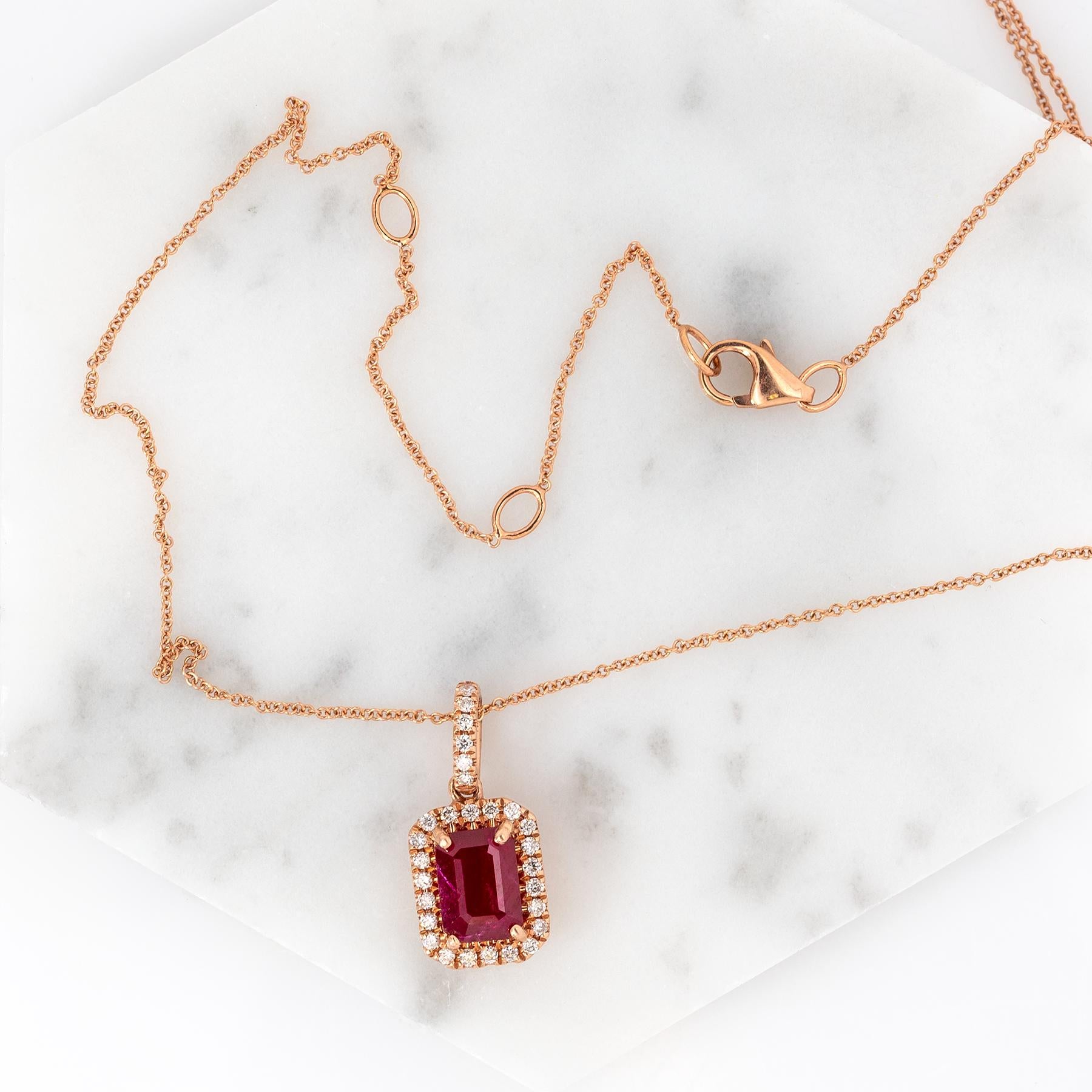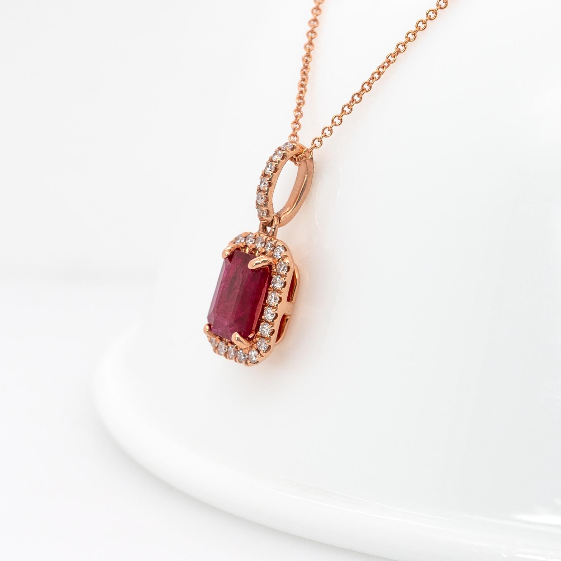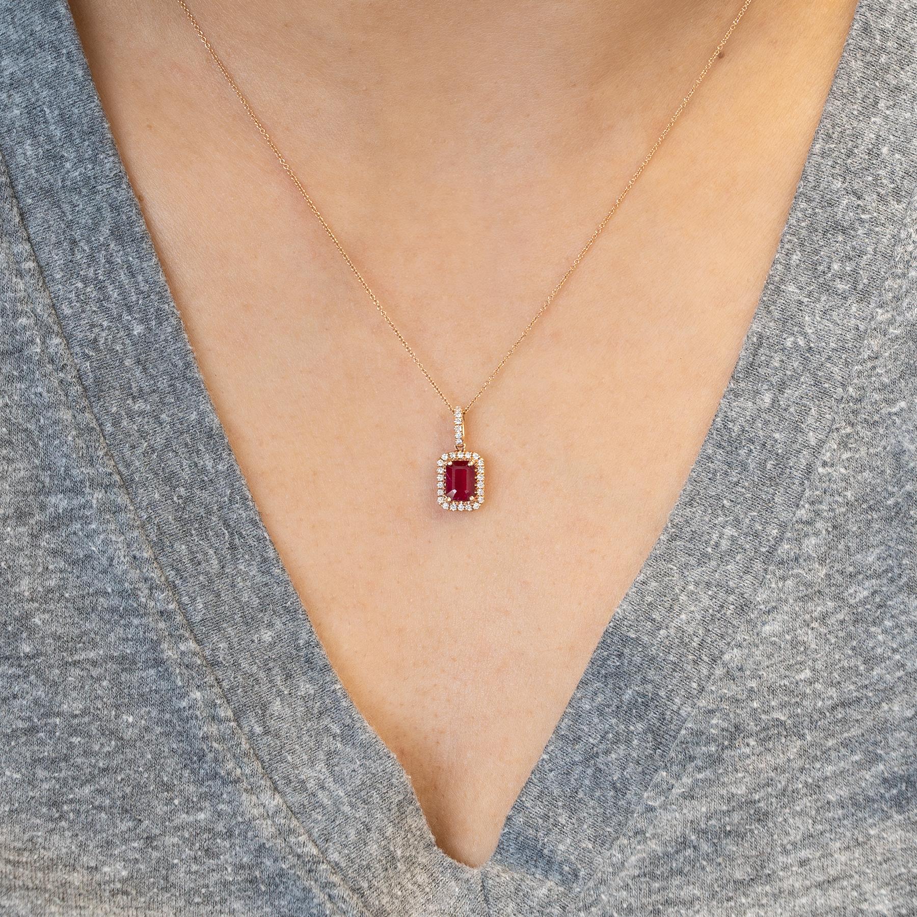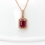 A sparkling halo of genuine natural diamonds enhances the rich red gemstone with timeless brilliance.