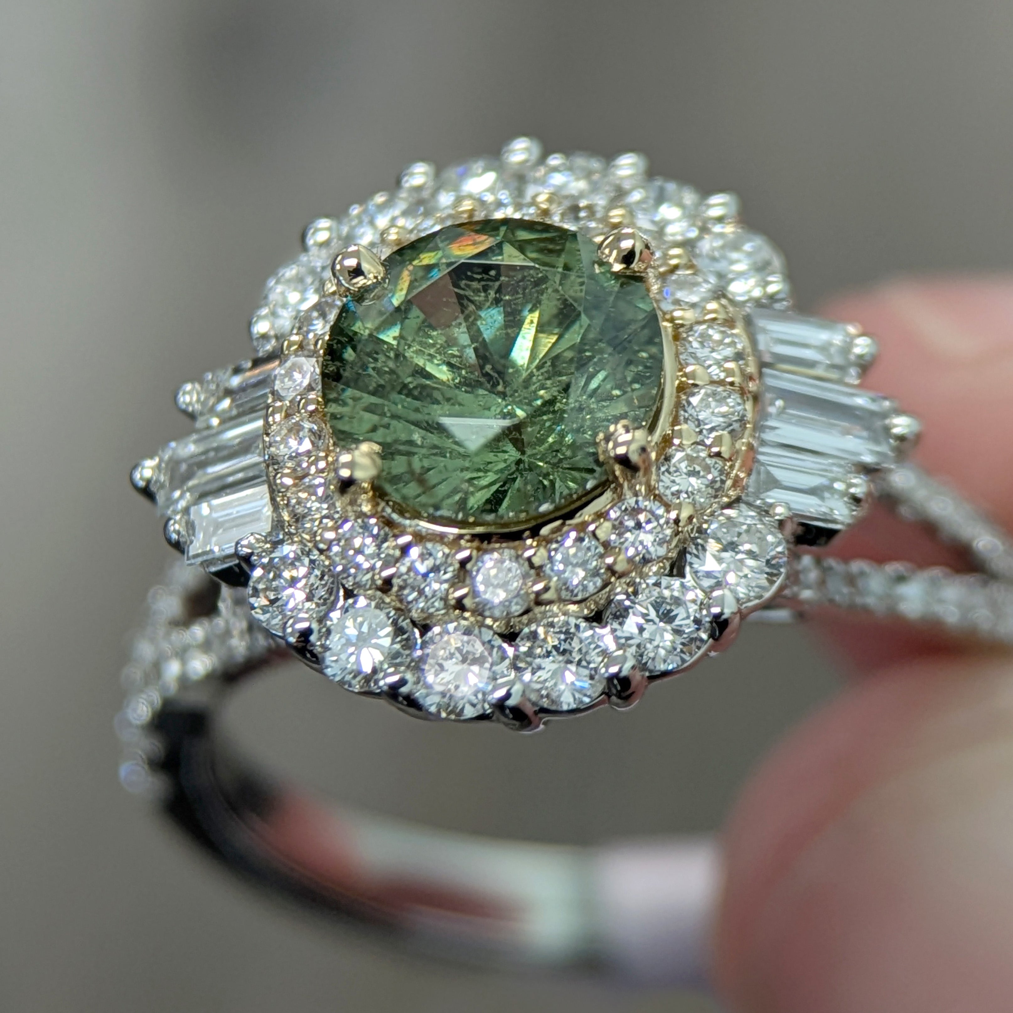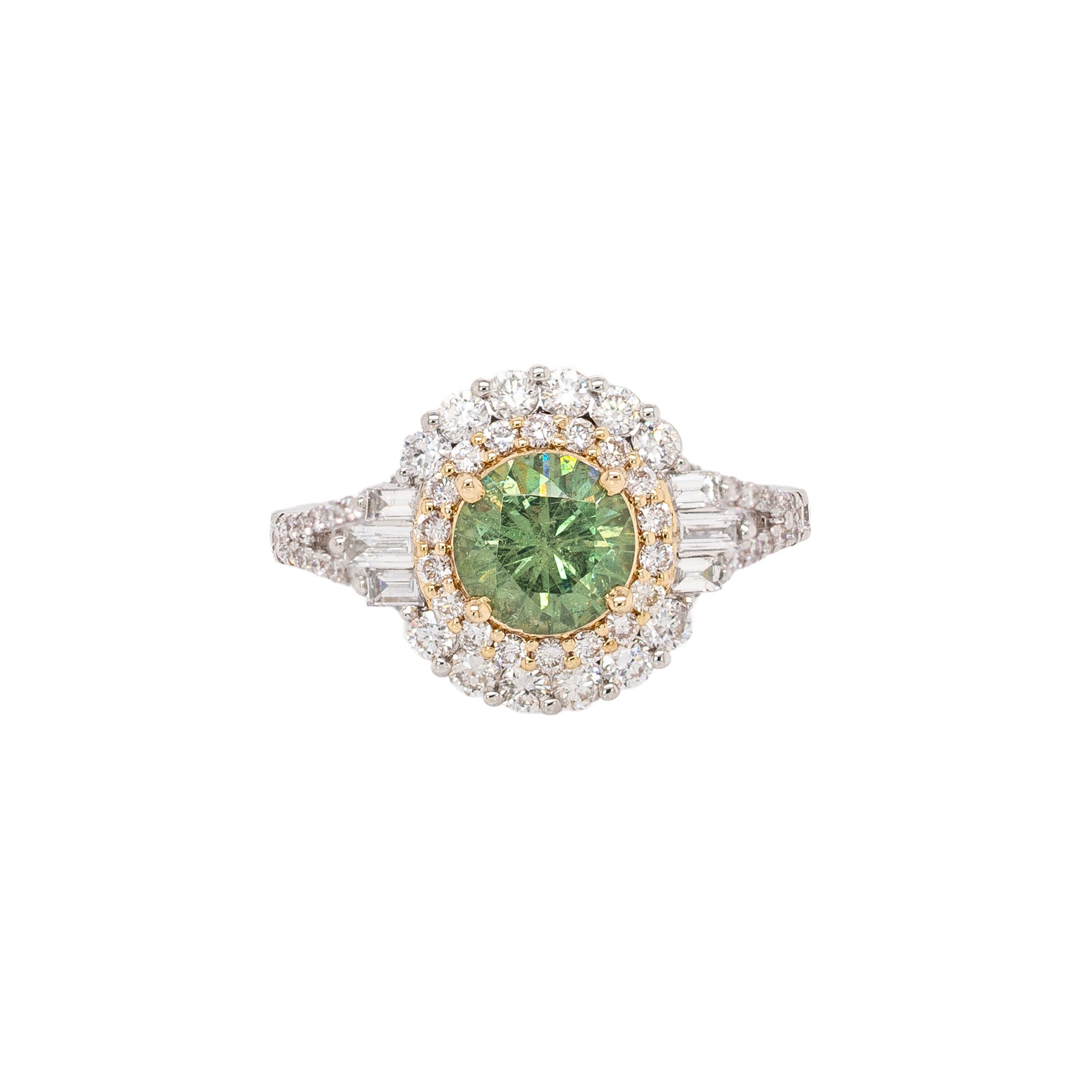 Sirin Solid 14k Dual Gold Demantoid Ring with Natural Diamonds Double Halo | Round 6mm