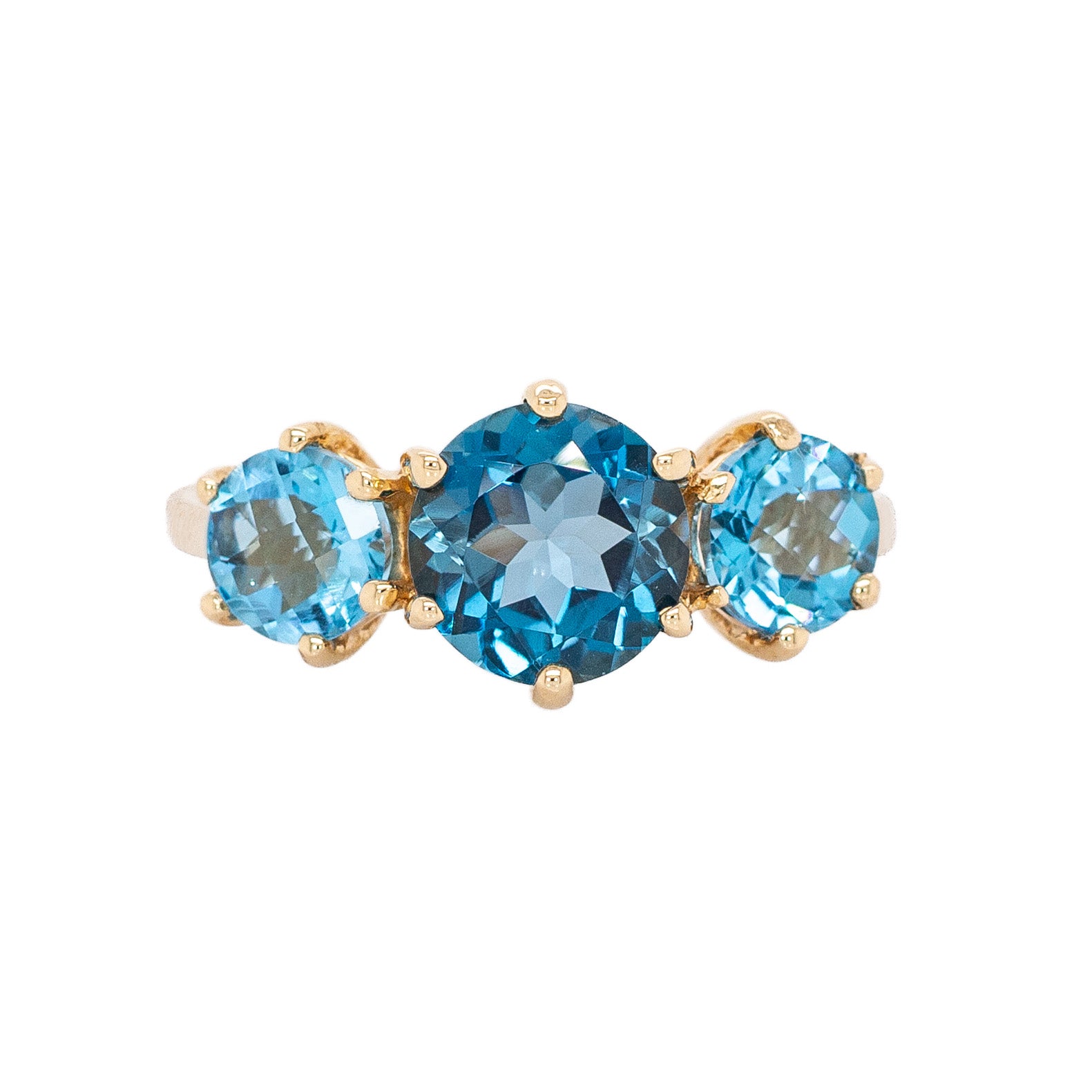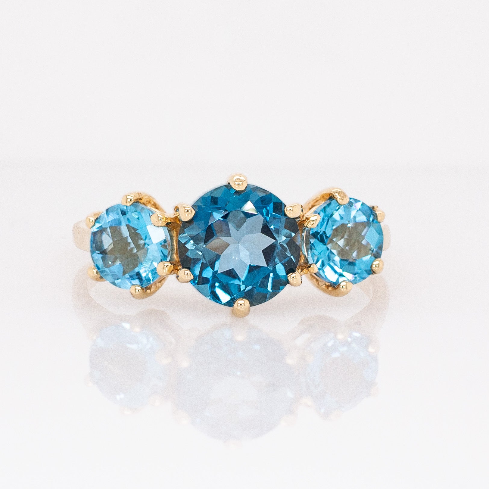 Aveline 14k Solid Gold London Blue Topaz Ring, Three Stone Setting | Round 8mm