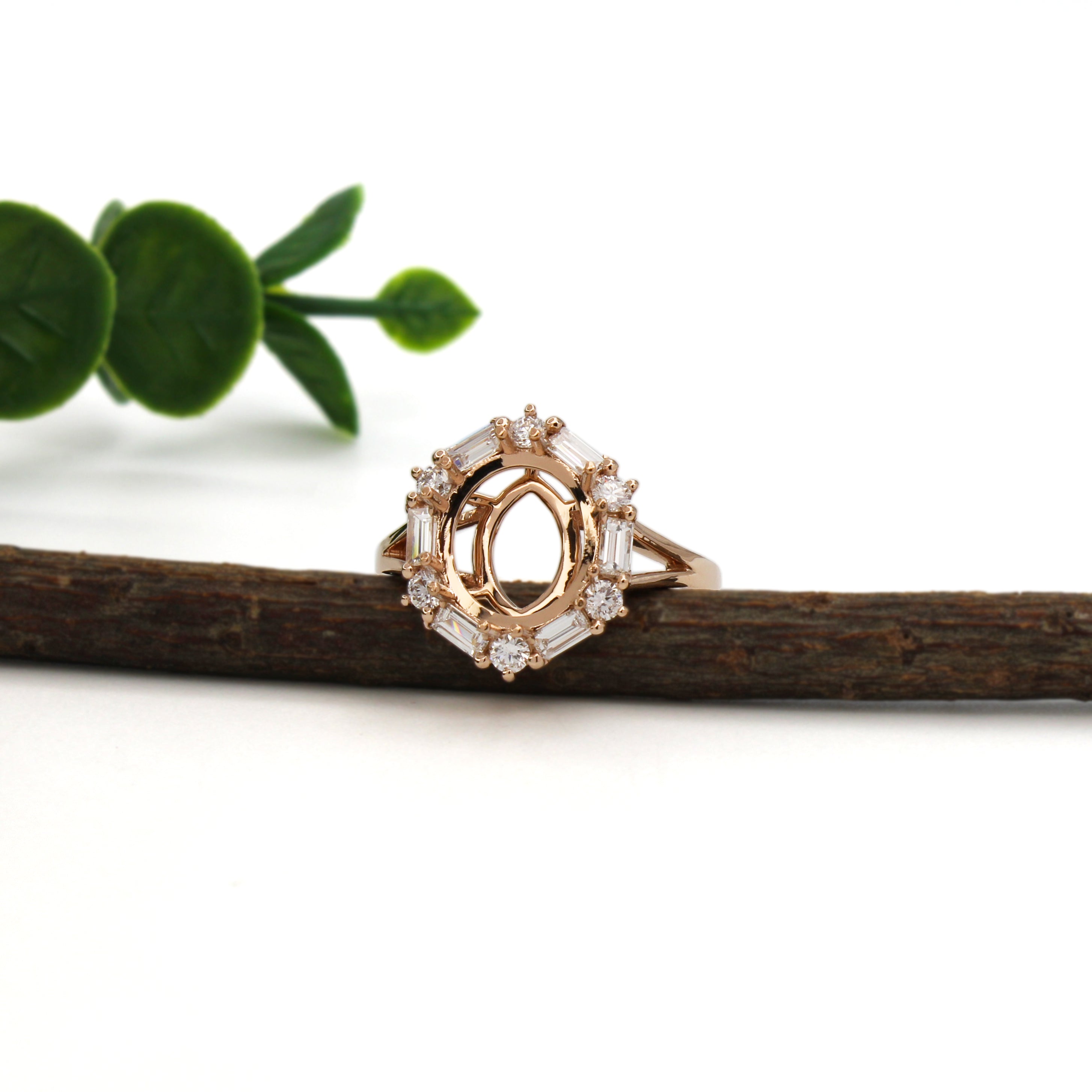 14K gold diamond halo vintage semi-mount ring showcases timeless elegance with its intricate design. The band is adorned with sparkling diamonds that surround the center, creating a stunning halo effect. The vintage-inspired style, combined with round and baguette-cut diamonds, adds a touch of classic sophistication. Perfect for those looking to design a custom engagement ring, this semi-mount setting serves as a beautiful foundation for your chosen gemstone, ensuring a piece that is both personal and luxurious.