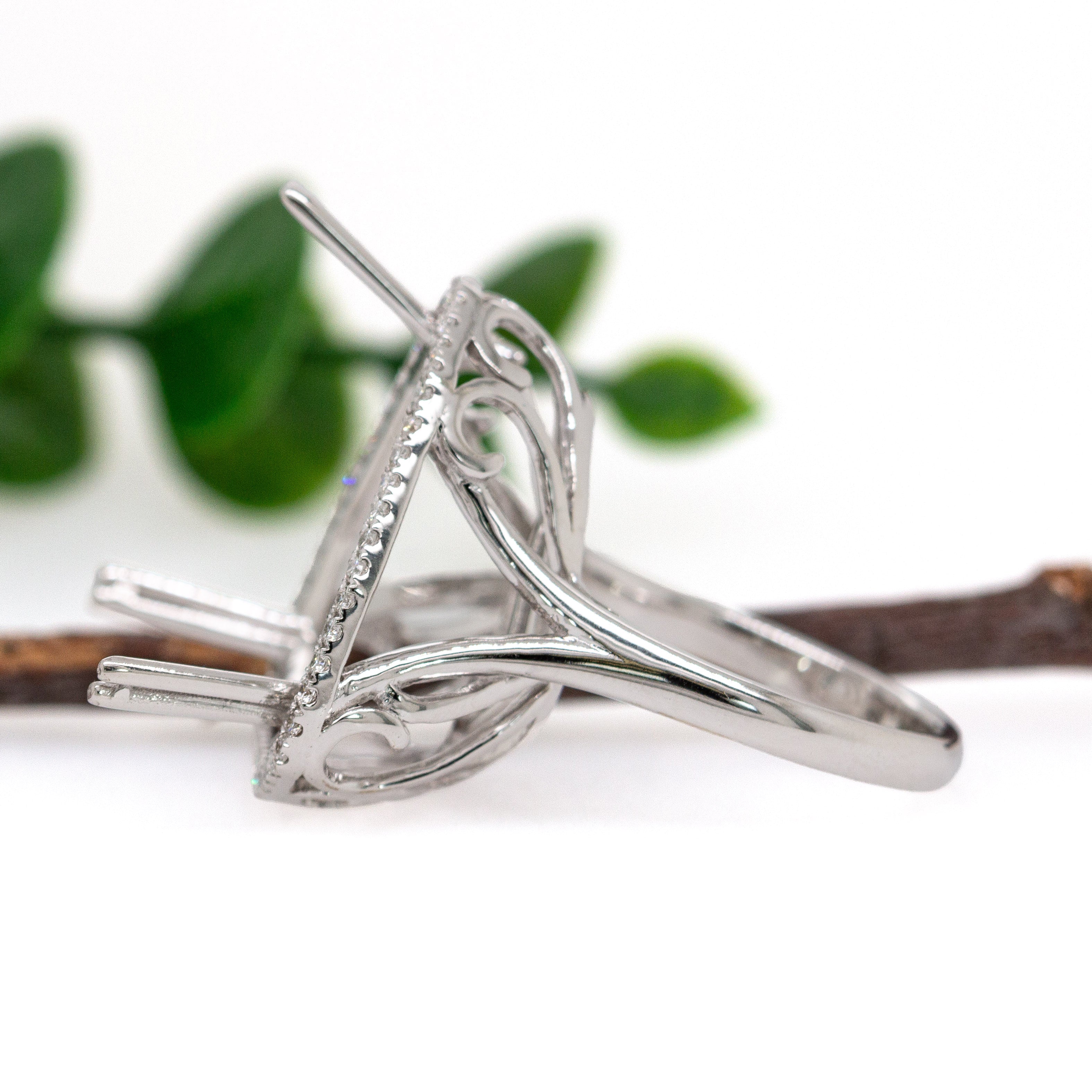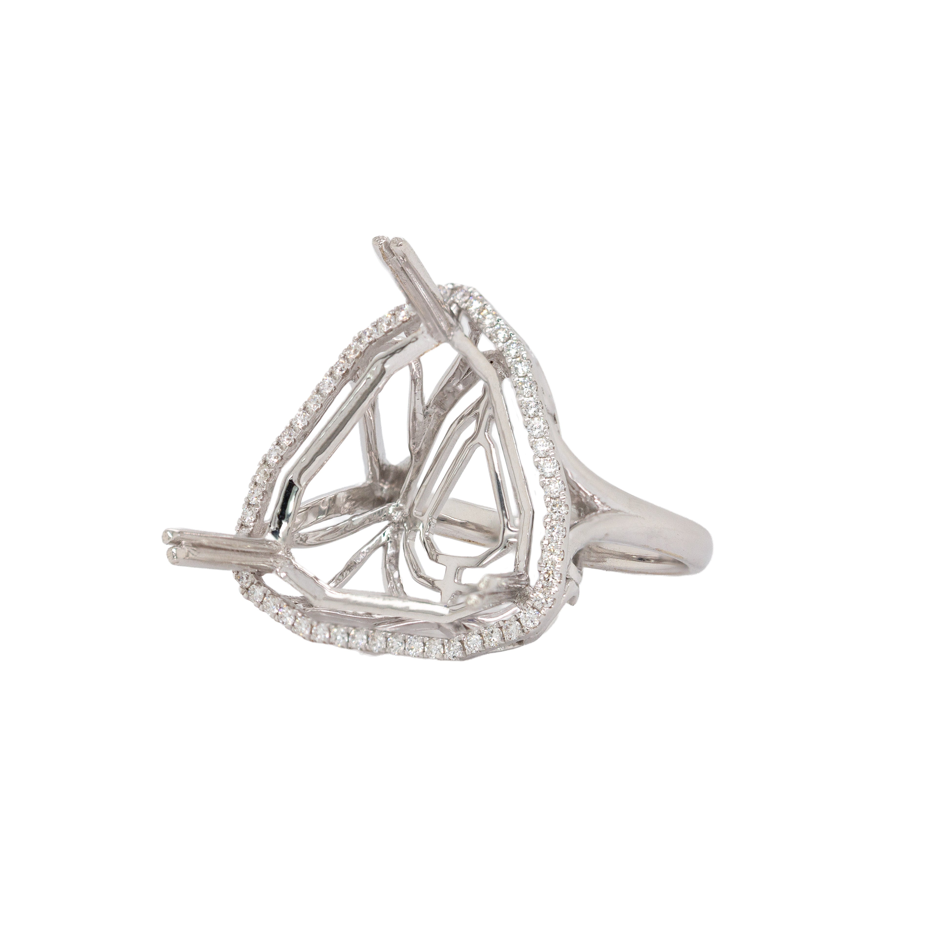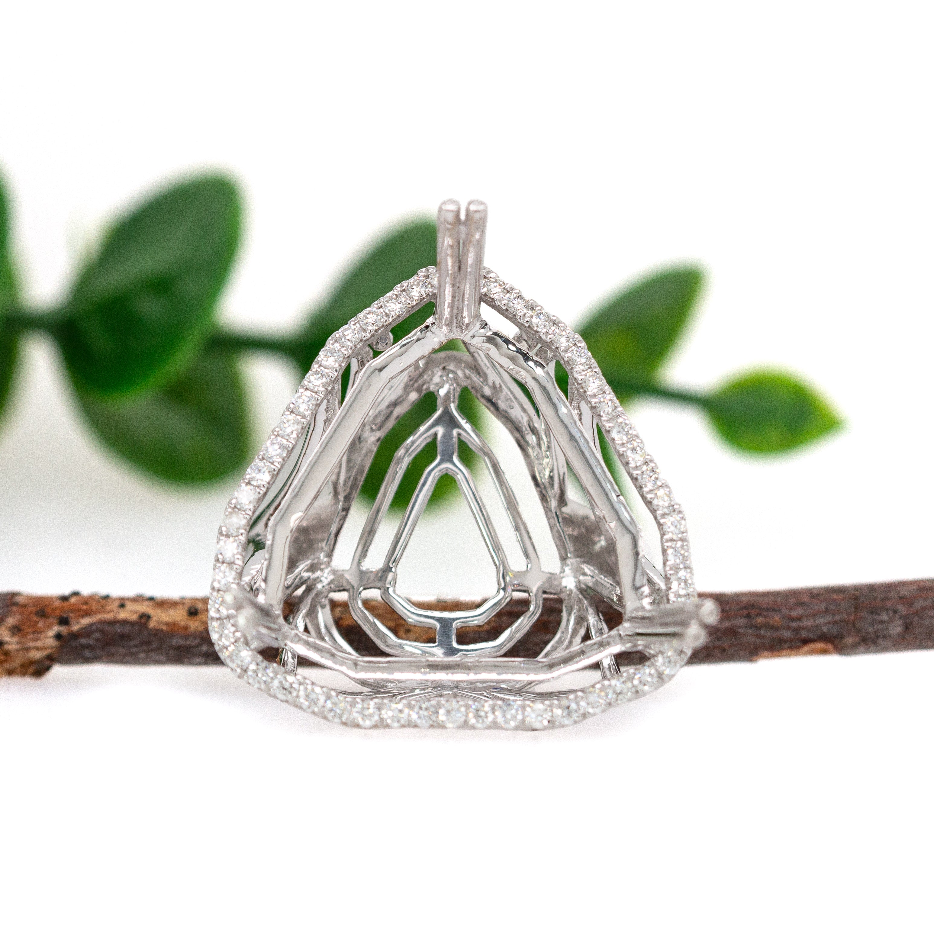 Elevate your style with this luxurious ring semi-mount, designed to showcase your unique taste and individuality. Crafted in solid 14K gold, this striking piece features a dramatic trillion-shaped center setting, perfect for highlighting your custom-selected gemstone or diamond. Surrounding the center is a glittering halo of natural, earth-mined diamonds, adding brilliance, depth, and an air of sophistication to the design.