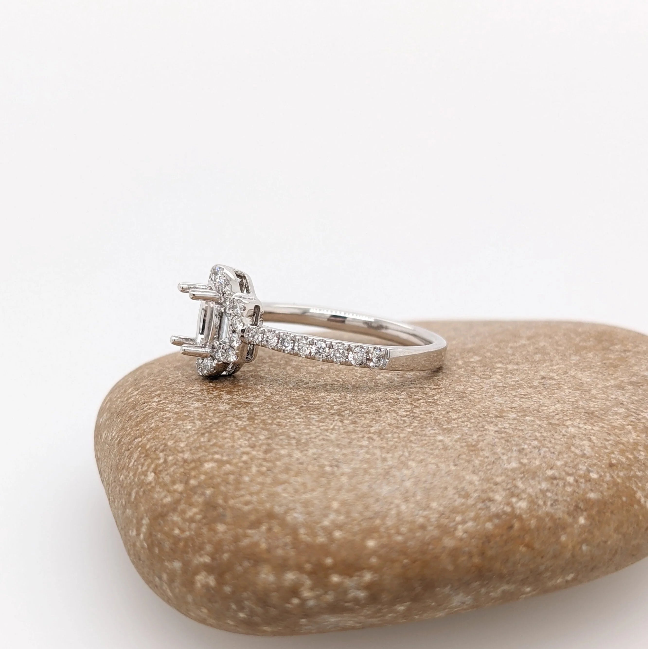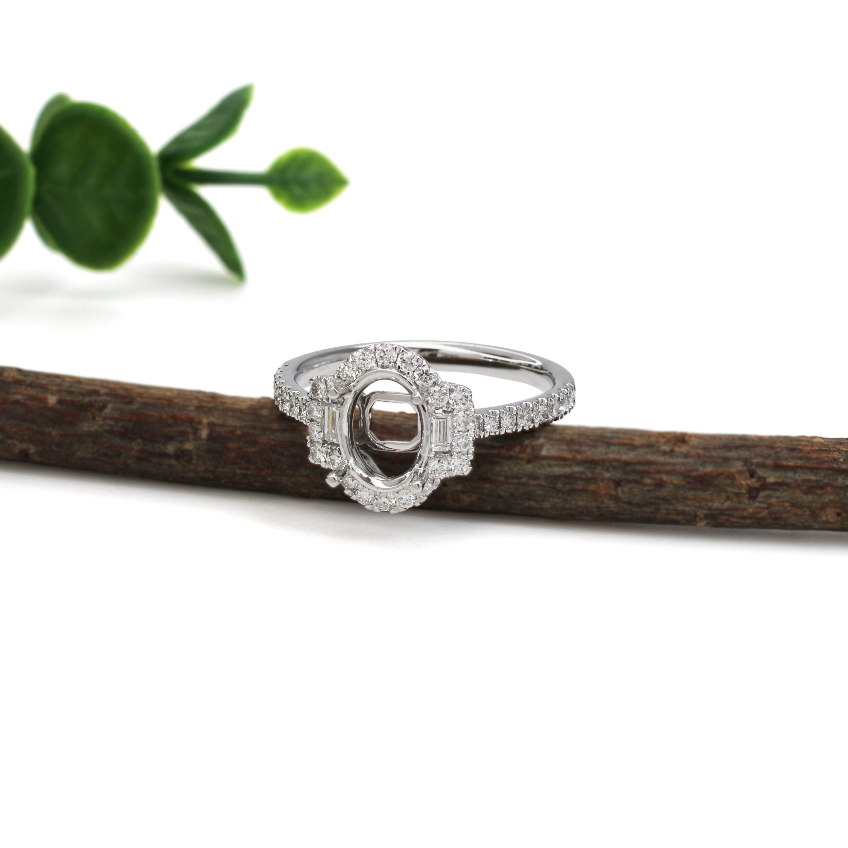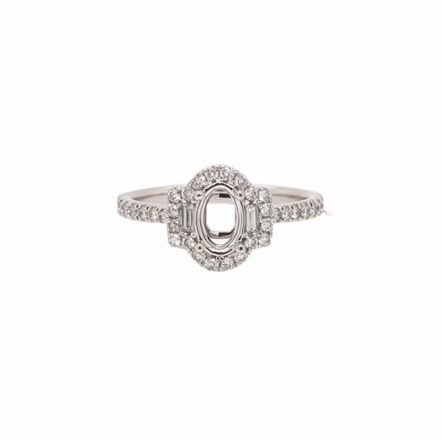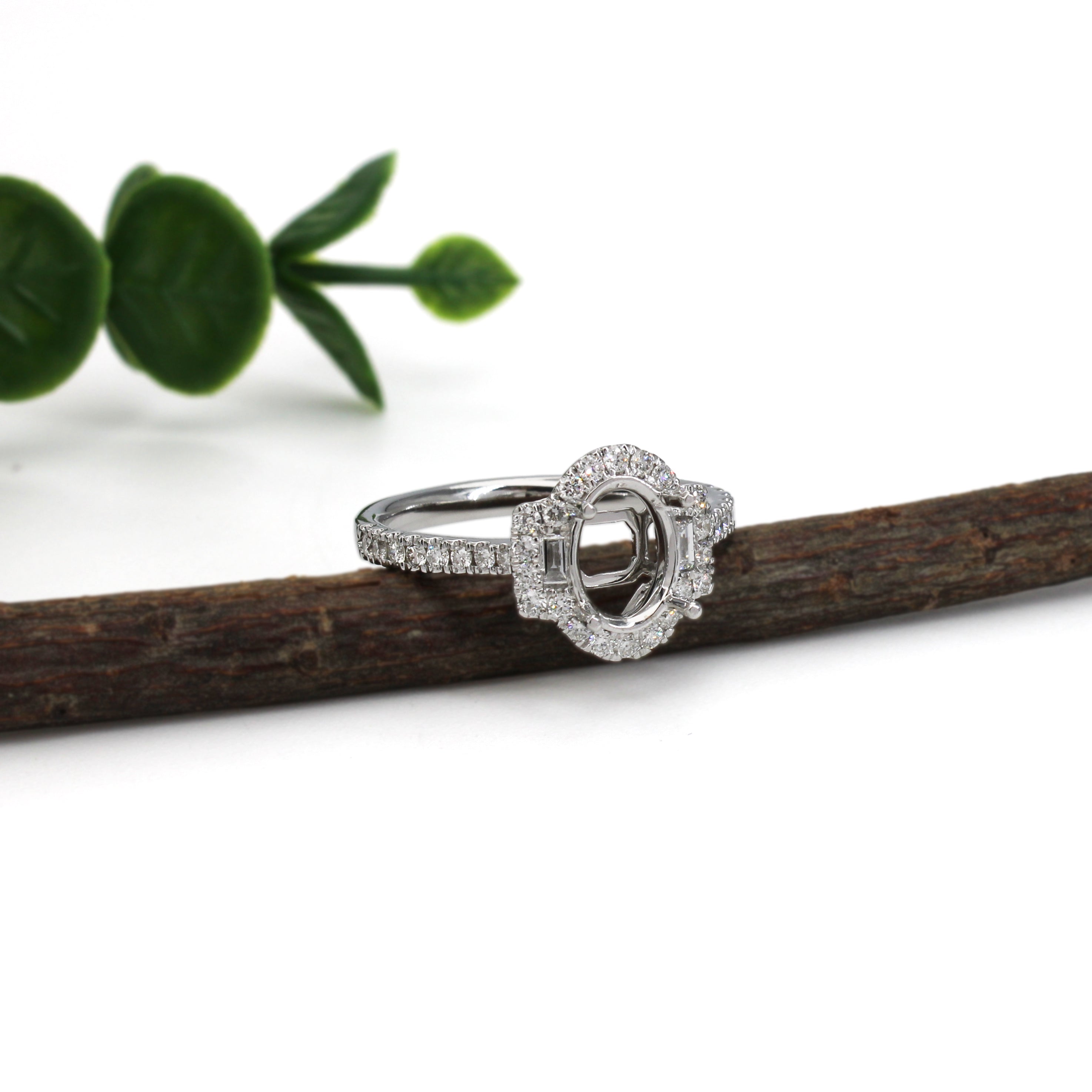 Collection Quality 14K gold ring semi mount featuring an oval shape basket pave diamond halo and baguette diamond split shank. A statement art deco ring design perfect for an eye catching engagement or anniversary. This ring also makes a beautiful birthstone ring for your loved ones.
