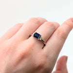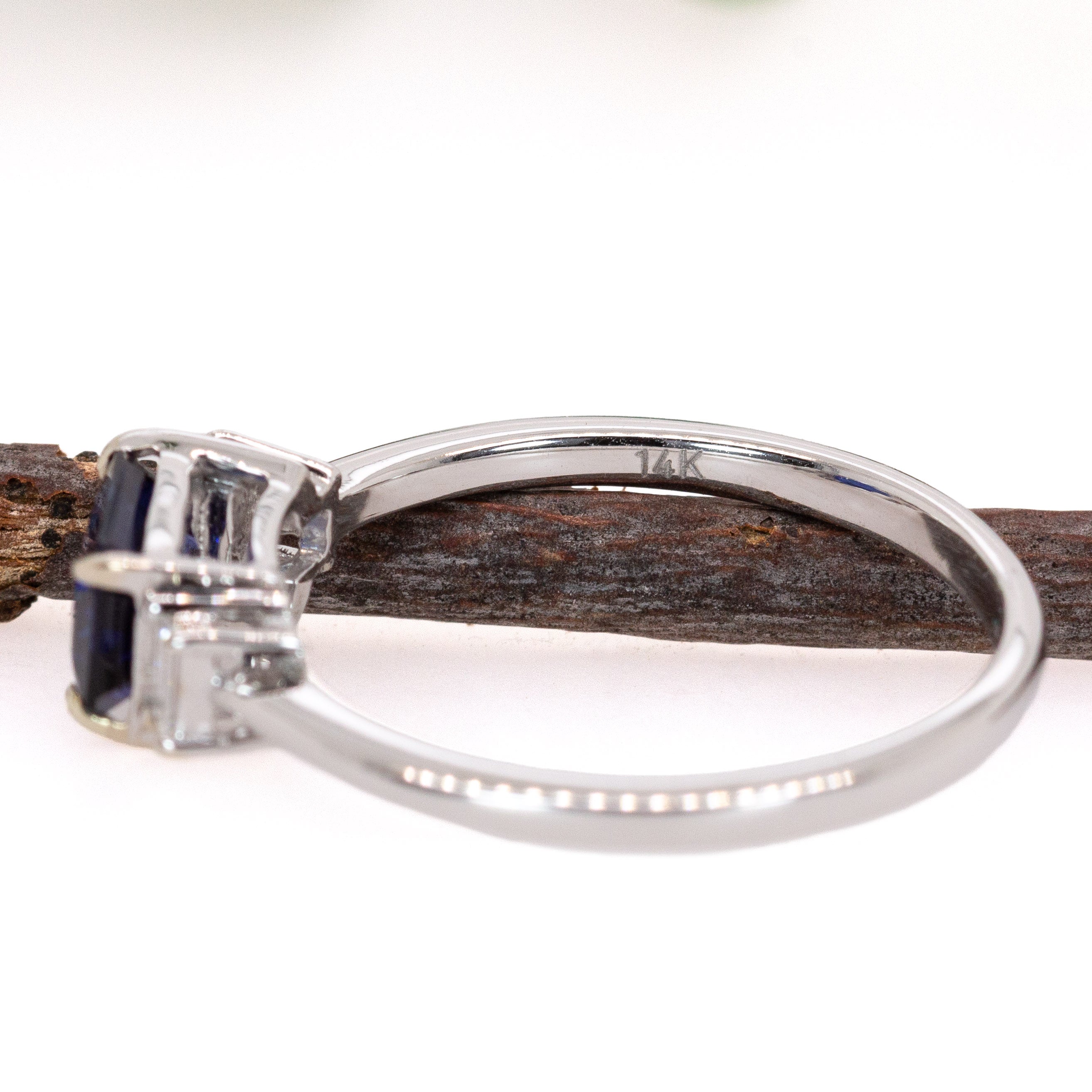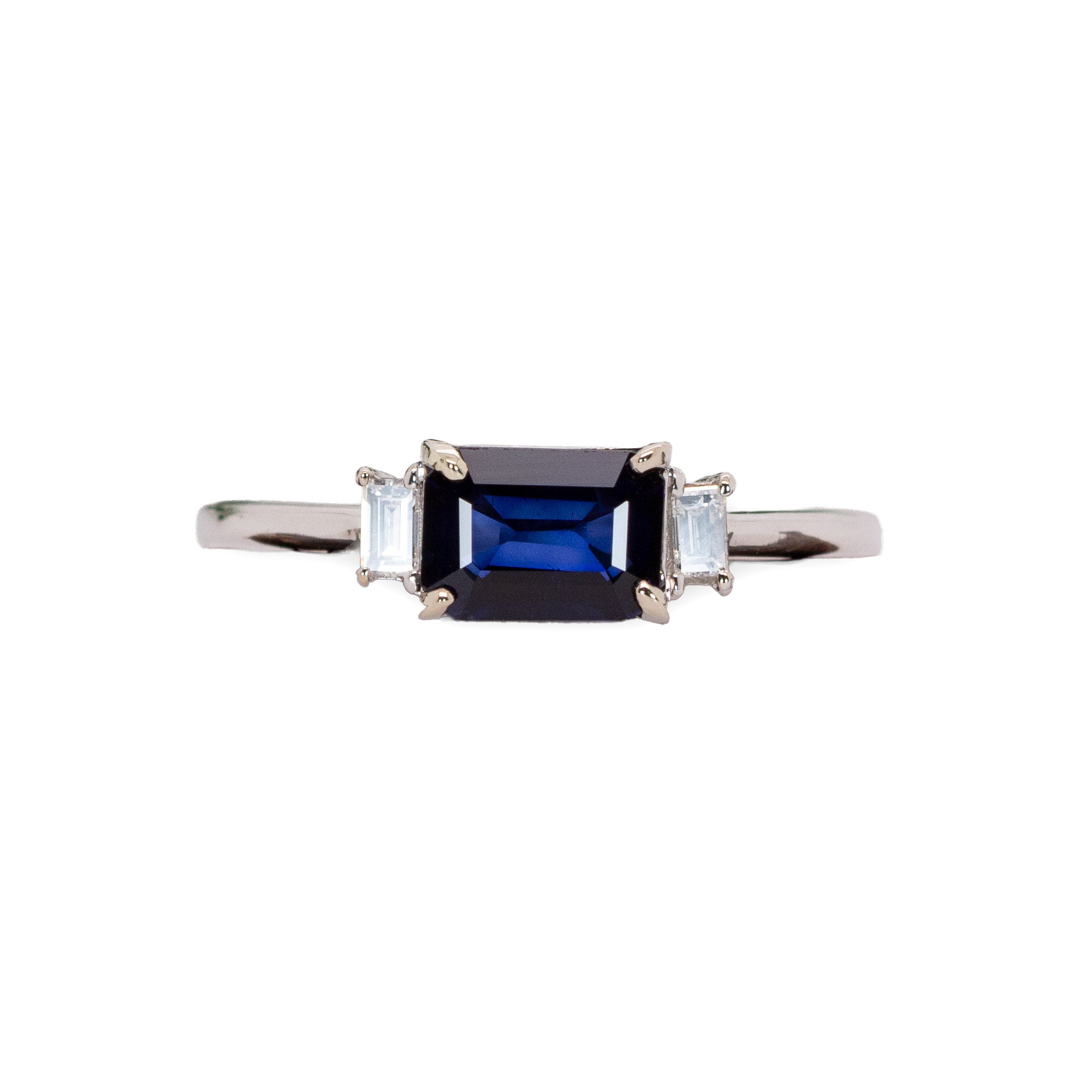 This elegant 14K White Gold ring features a 1.07-carat emerald-cut sapphire (7x5mm) at its center, flanked by two sparkling trapezoid-shaped diamonds, totaling 0.09 carats. The sleek design of the white gold band (weighing 2.012 grams) complements the vibrant blue hue of the sapphire, creating a sophisticated and timeless look. The combination of the striking sapphire and the diamonds on either side adds a touch of brilliance and refinement to this stunning piece. Ideal for those seeking a refined yet unique piece of jewelry, this ring is both classic and contemporary.
