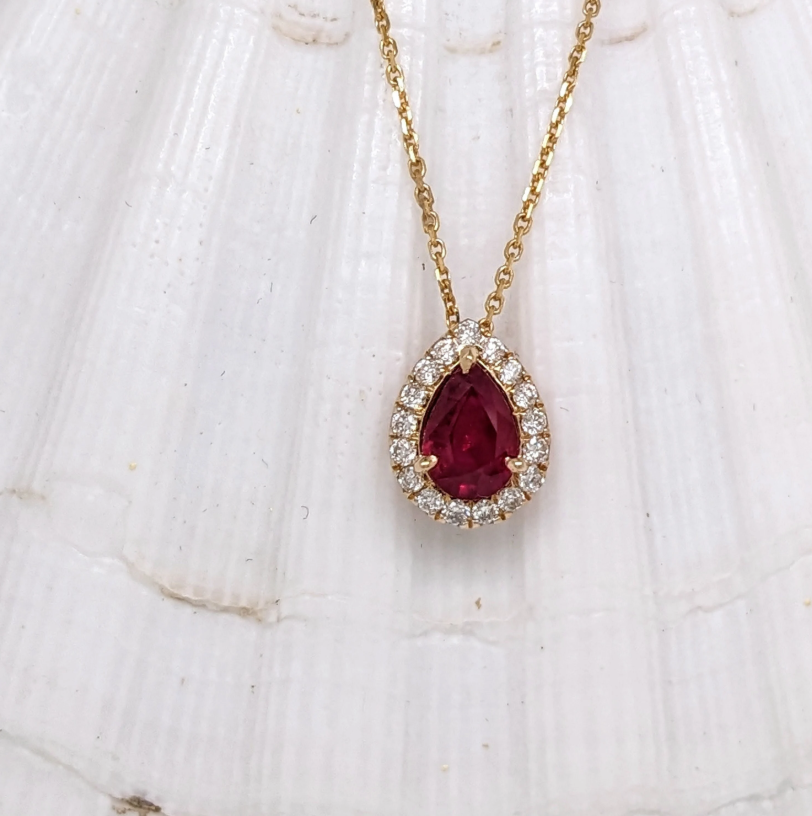 This beautiful pendant features a 0.70 carat pear cut ruby gemstone with natural earth mined diamonds all set in solid 14K gold. With its classic design and stunning July birthstone, this pendant is sure to brighten your look!