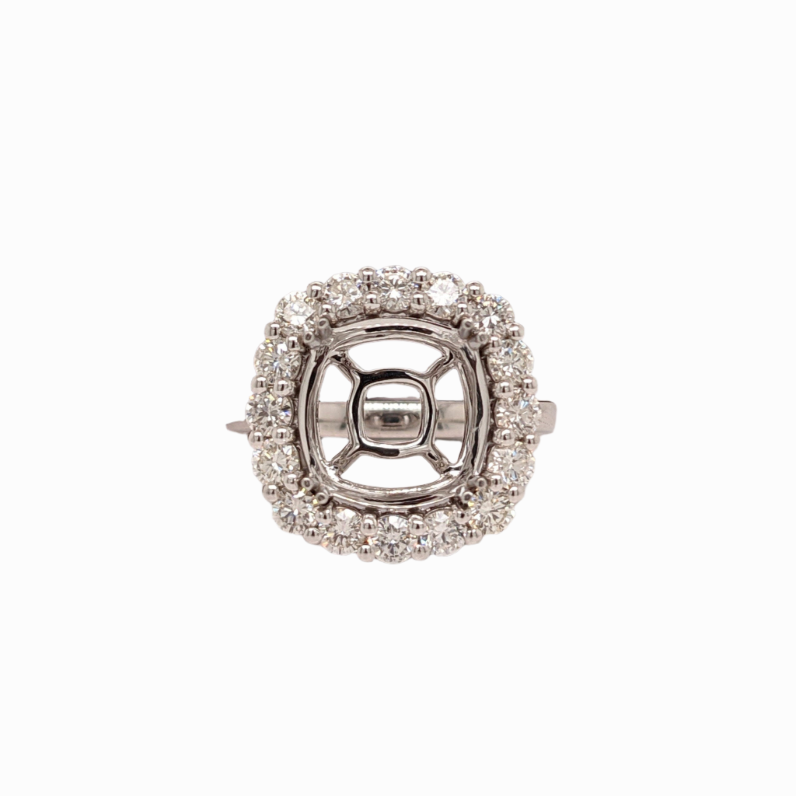 This fancy diamond ring semi mount features a large sparkling diamond halo with a solid gold tapered shank. A statement ring design perfect for an eye catching engagement or anniversary. This ring also makes a beautiful birthstone ring for your loved ones. Available in multiple colors of 14K Gold: Yellow, White and Rose.