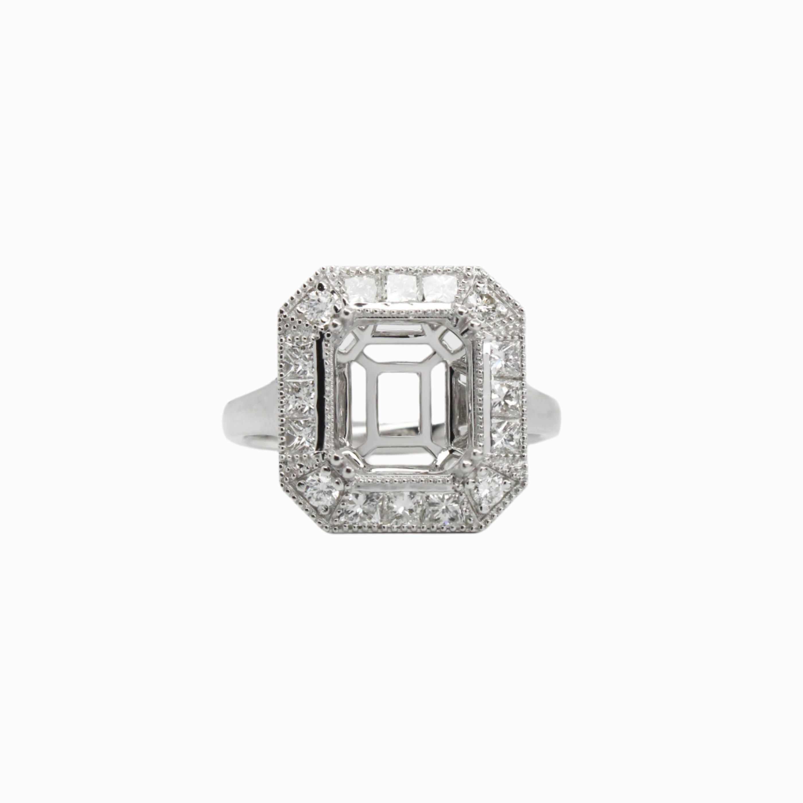 Art Deco Ring Semi Mount w Diamonds and Milgrain in 14K Solid Gold | Emerald Cut