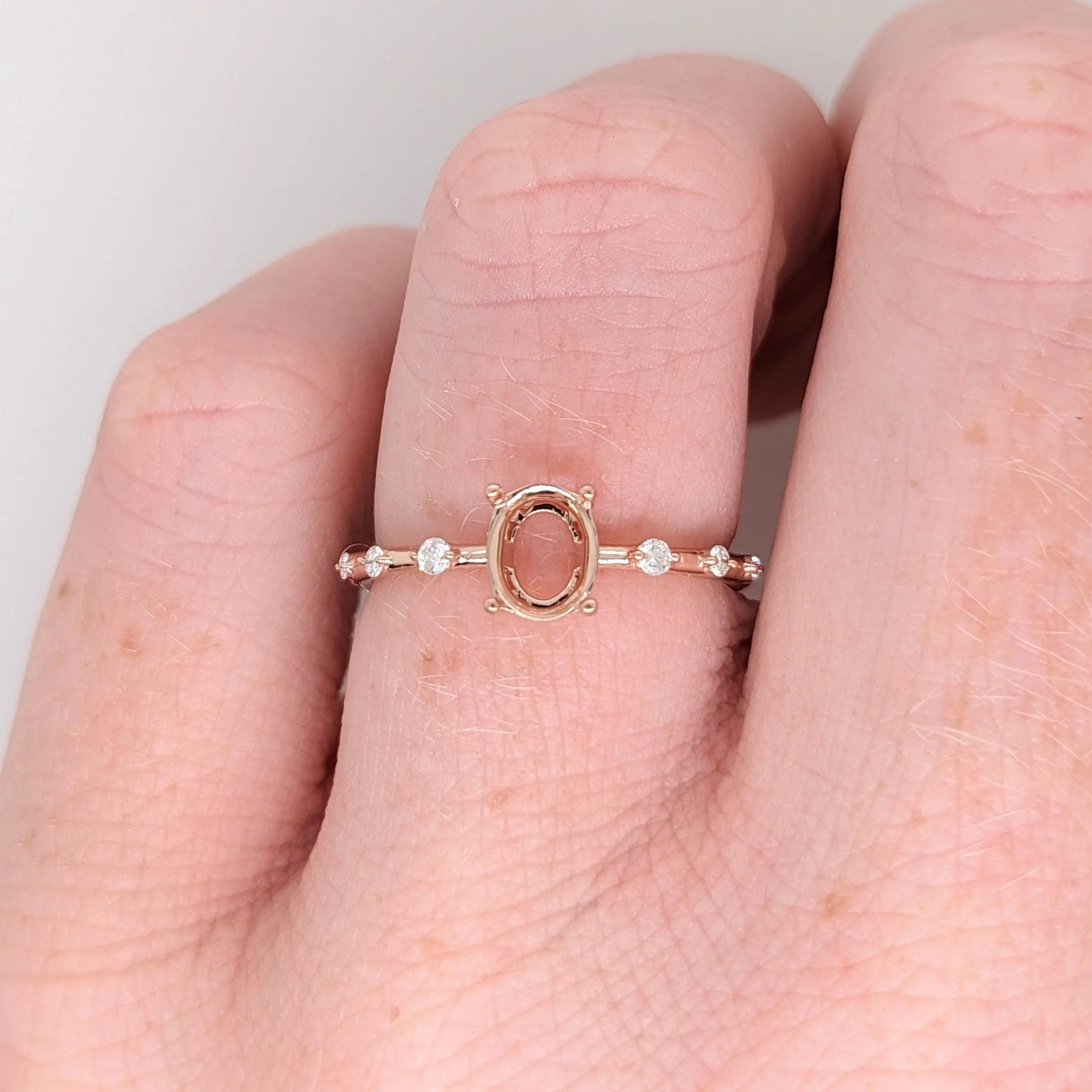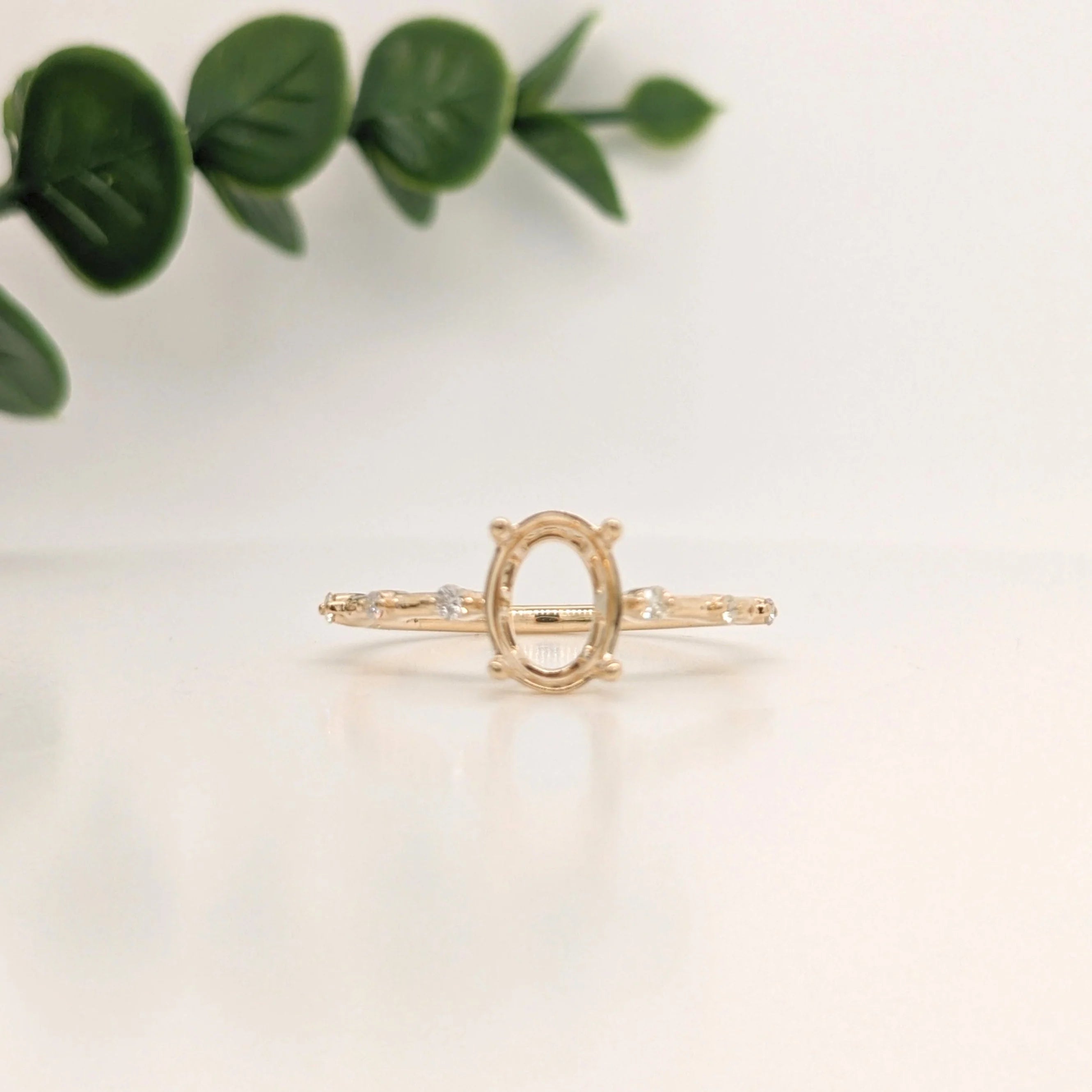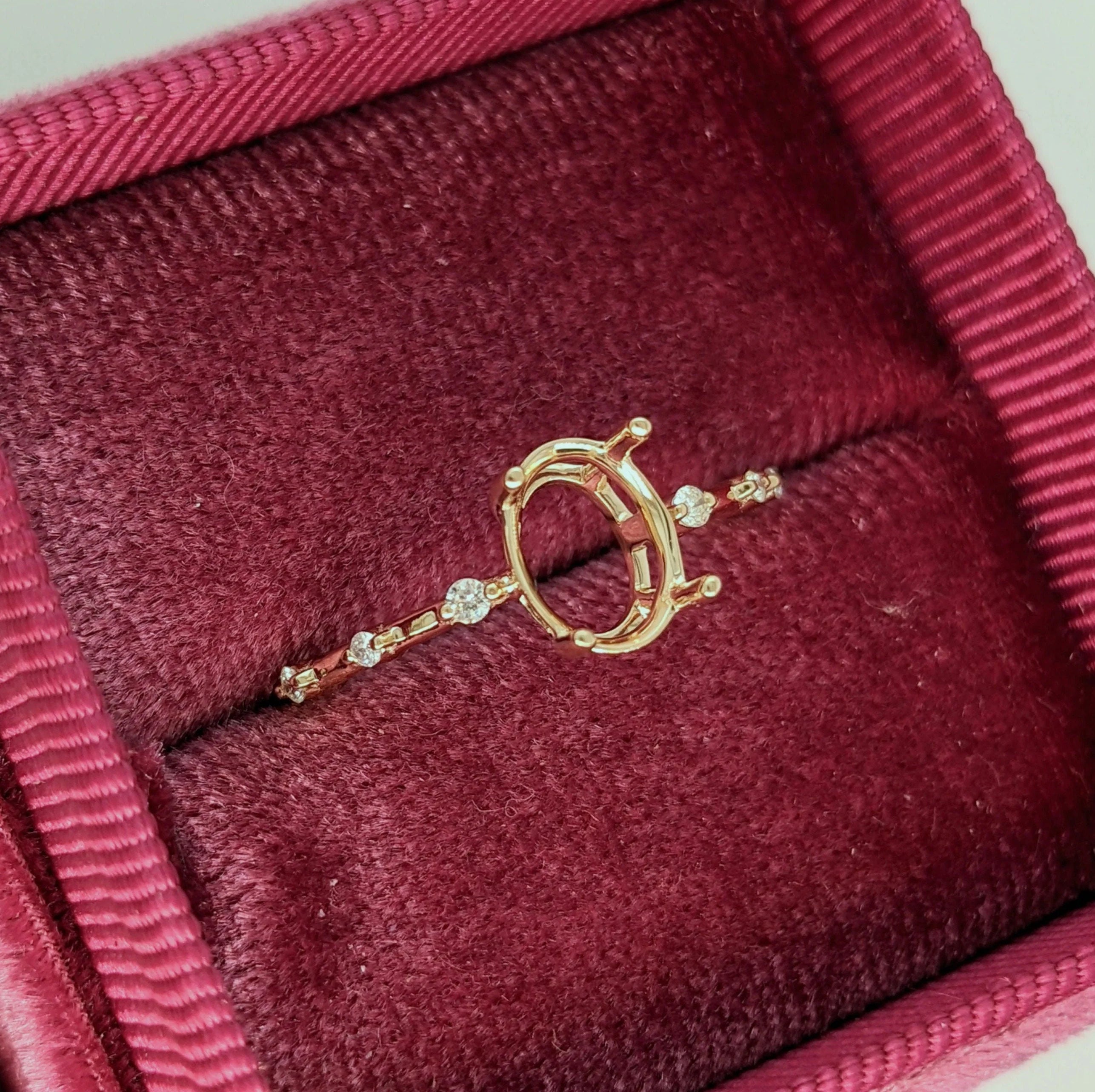 This classic 14K gold ring semi mount features an oval basket with a trio of diamond accents design on the shank. A dainty ring design perfect for an eye catching engagement or anniversary. This ring also makes a beautiful birthstone ring for your loved ones. Available in multiple colors of 14K Gold: Yellow, White and Rose