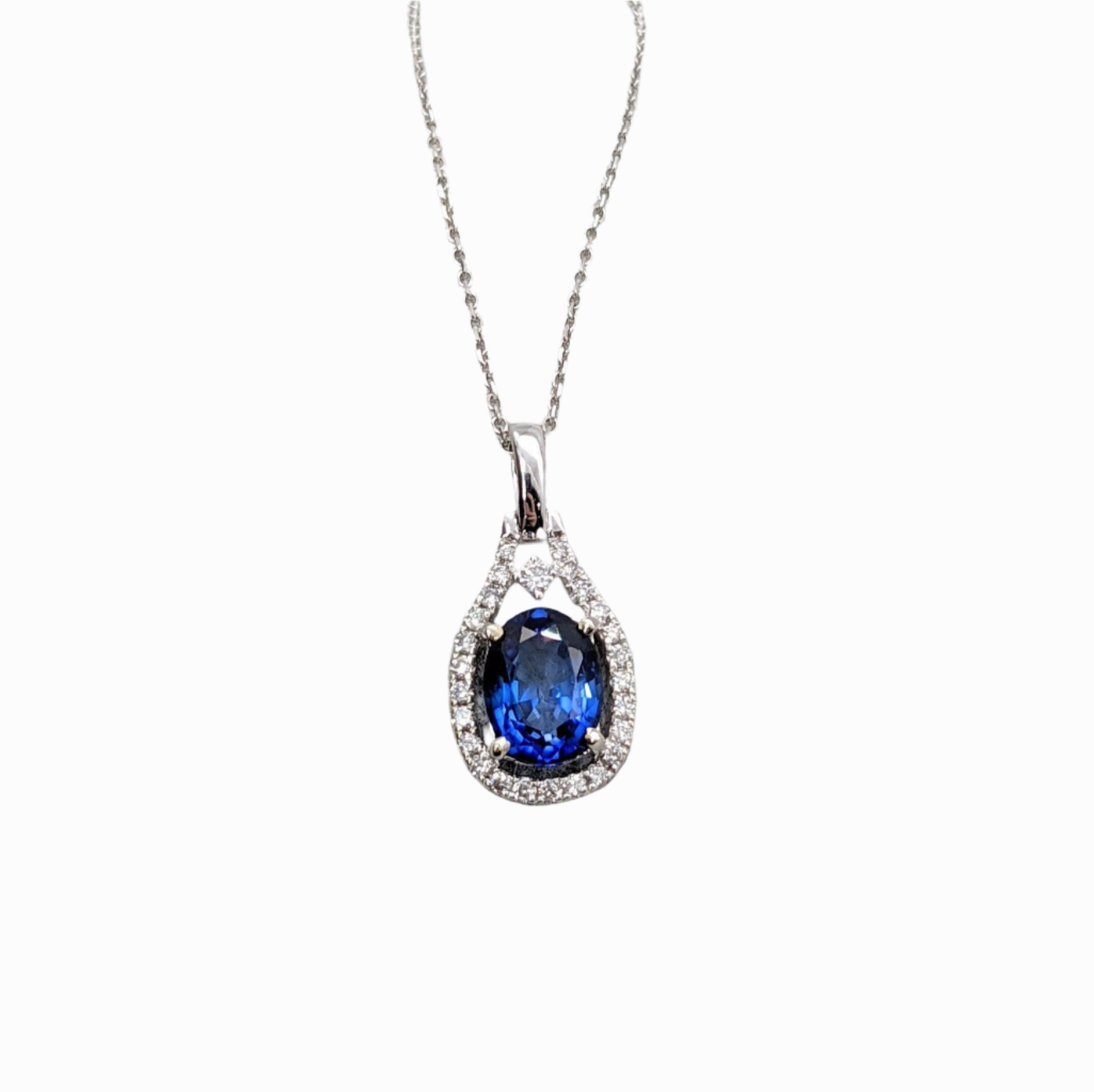 This minimalist blue sapphire pendant with natural diamond accents is sure to catch the eye. Made of 14K solid gold, its classic oval shape can be customized to suit your personal style. Elevate any outfit with this elegant and timeless piece.
