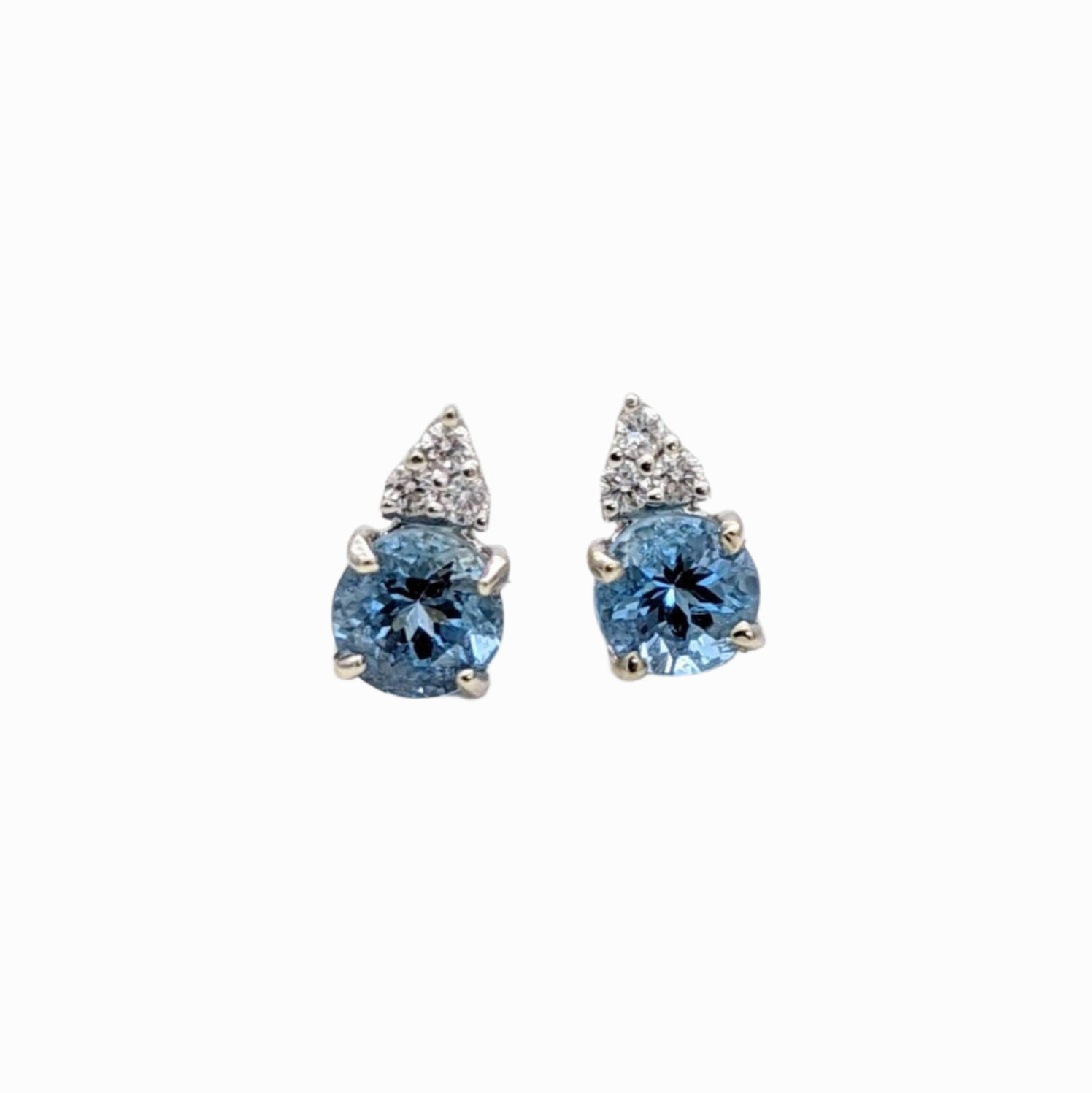 Stunning Aquamarine Diamond Earring Studs with a Round center setting with 3 diamonds. Available in multiple colors of 14K Gold: Yellow, White and Rose. Dual tone options are also available.