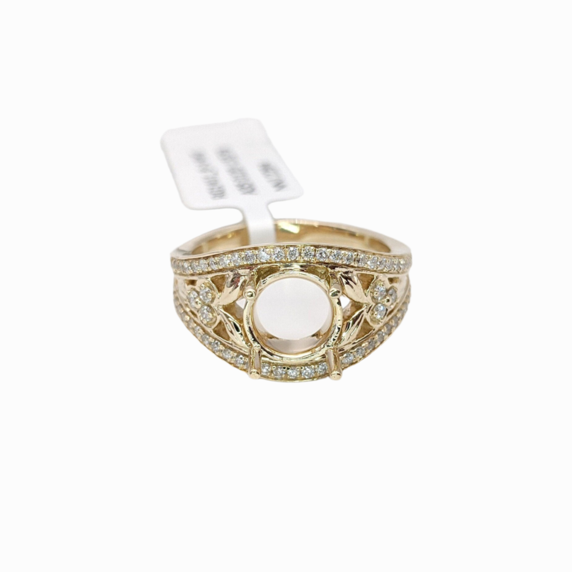This beautifully detailed ring features a round-shape center setting and gorgeous diamonds lining the band. Diamonds line the top and bottom of this ring in a pinpoint setting, accompanied by a leafy diamond design on either side of the center setting. Perfect for any center stone! Available in multiple colors of 14K Gold.
