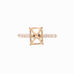 This sparkling diamond ring semi mount features a 4 prong emerald cut solitaire ring setting accented with a round and marquise diamond band. A twist on a classic ring design perfect for an anniversary or as an engagement ring. This ring also makes a beautiful birthstone ring for your loved ones. Available in multiple colors of 14K Gold: Yellow, White and Rose.