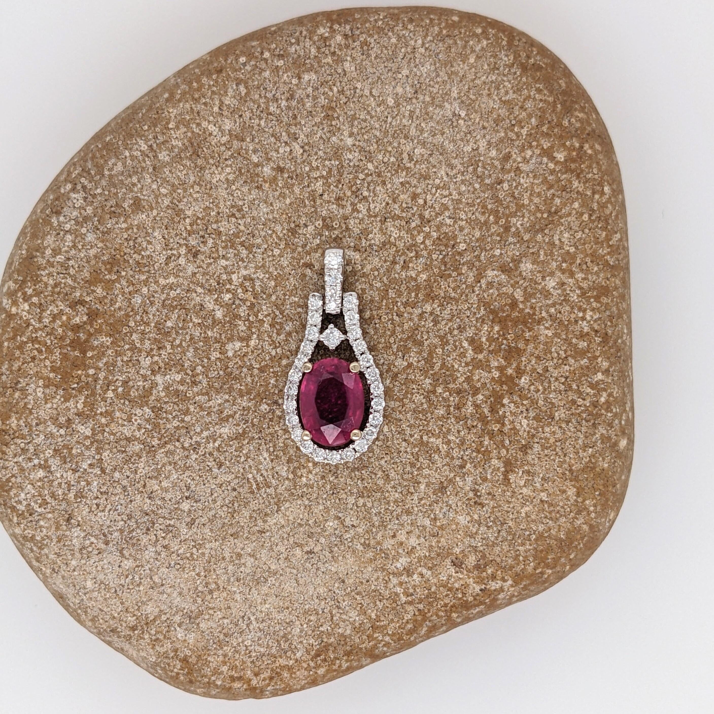 Adorn yourself in timeless elegance with this exquisite ruby pendant encircled by sparkling diamond accents. Crafted with solid 14K yellow, white or rose gold, this shimmering piece will capture the light and draw the eye. An undeniable symbol of beauty, this pendant will make a surefire statement!