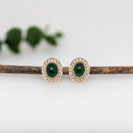 These elegant stud earrings showcase a pair of oval emerald gemstones encircled by a halo of sparkling natural earth mined diamonds, set in a luxurious solid 14k gold finish. Perfect for adding a touch of sophistication to any ensemble. These earrings make a beautiful May birthstone gift for your loved ones!
