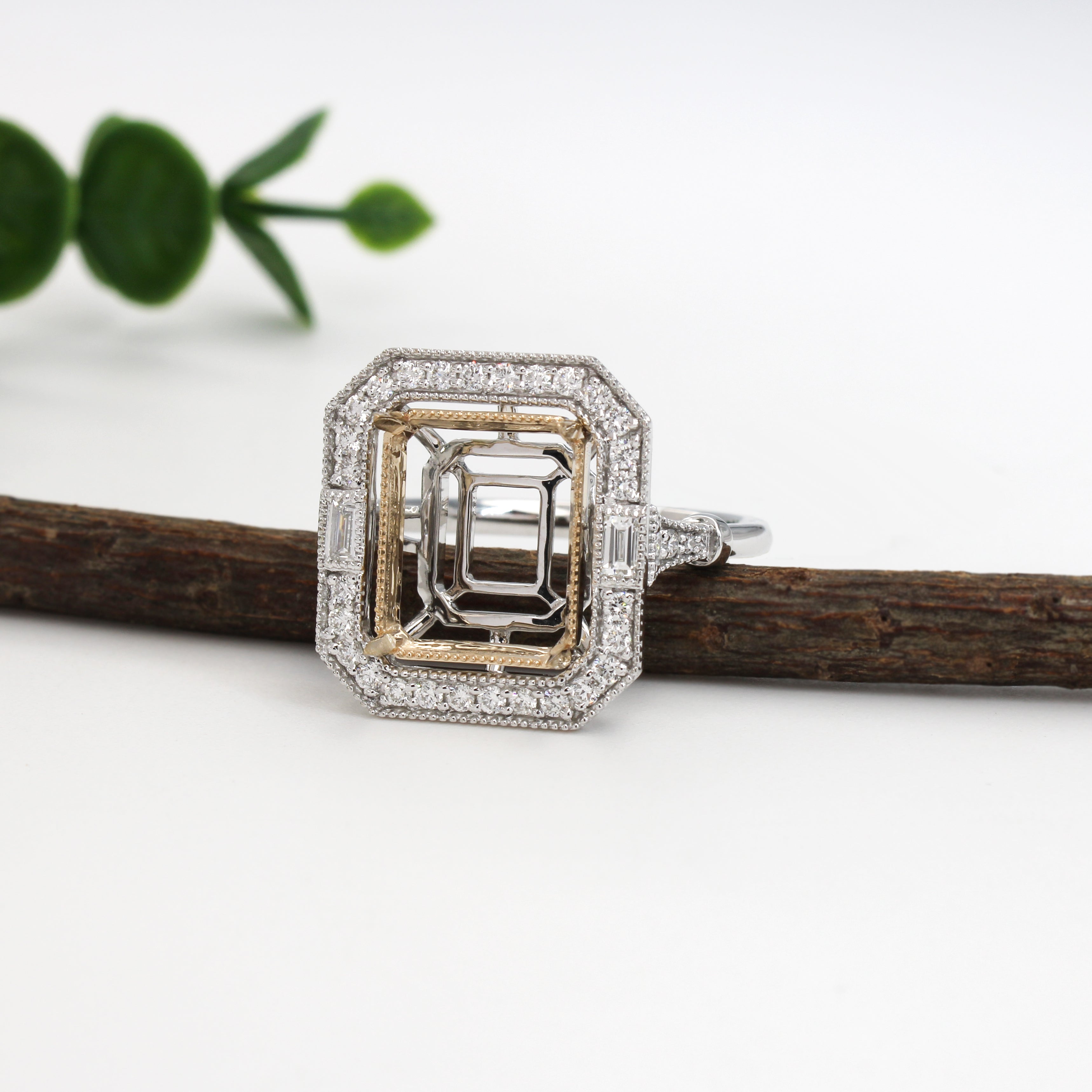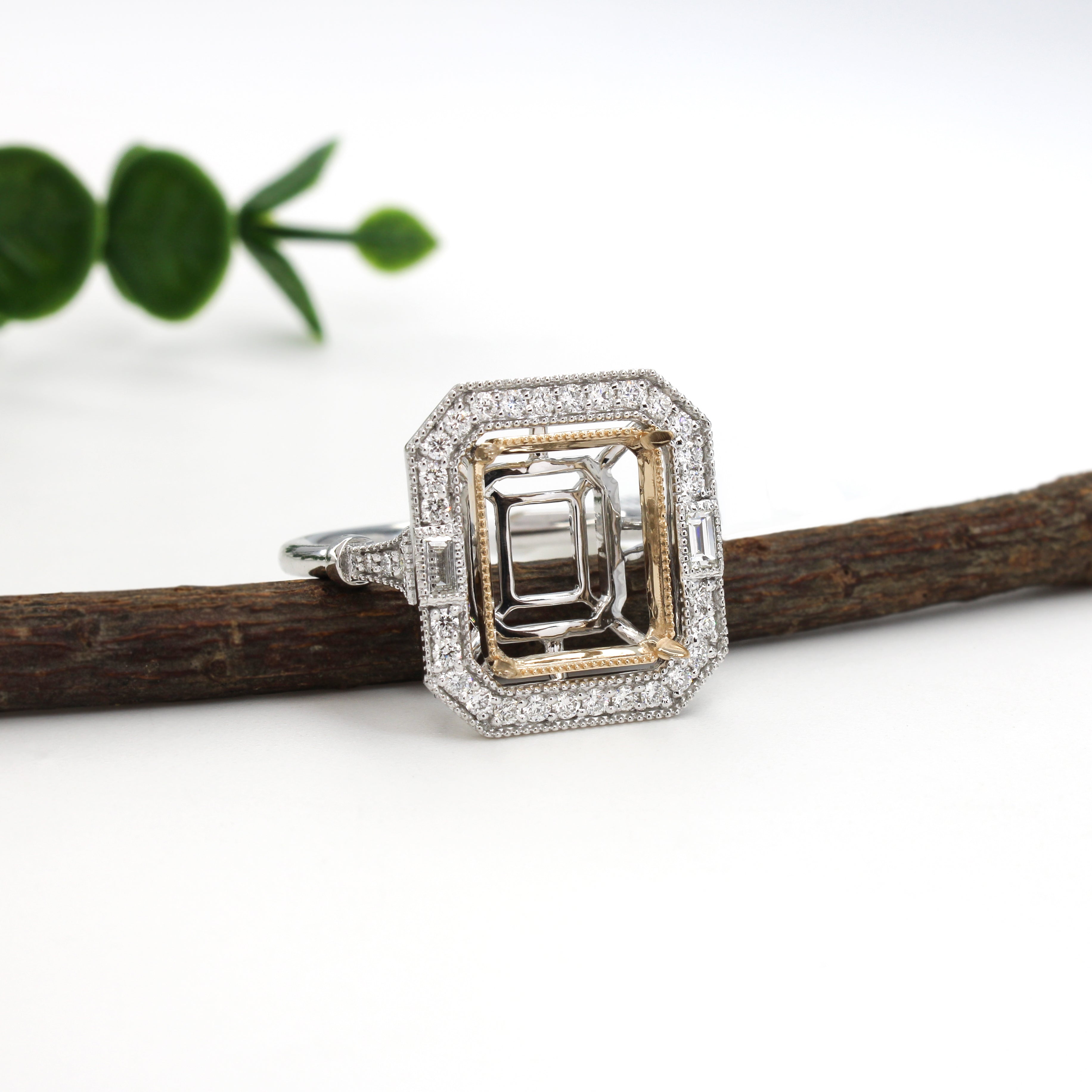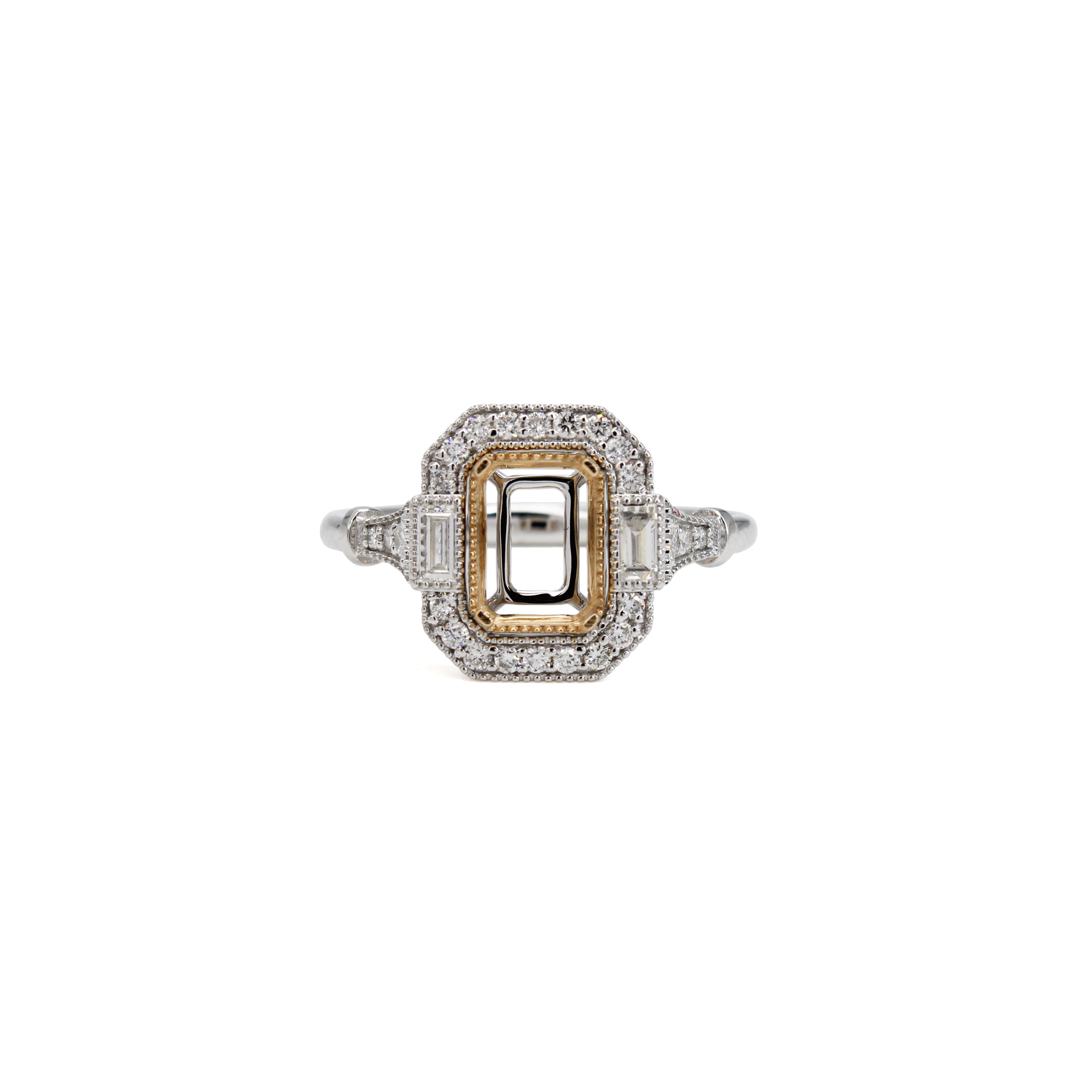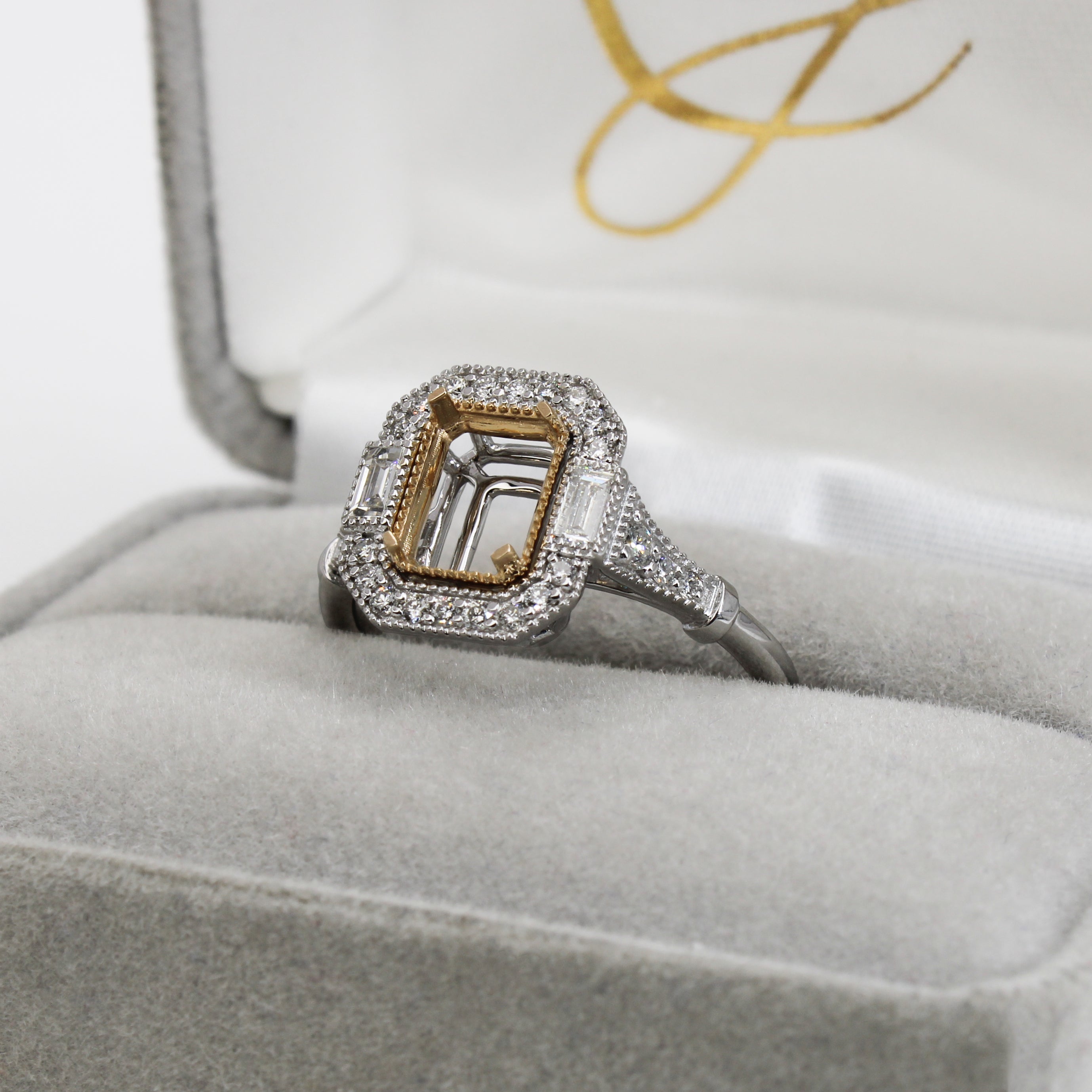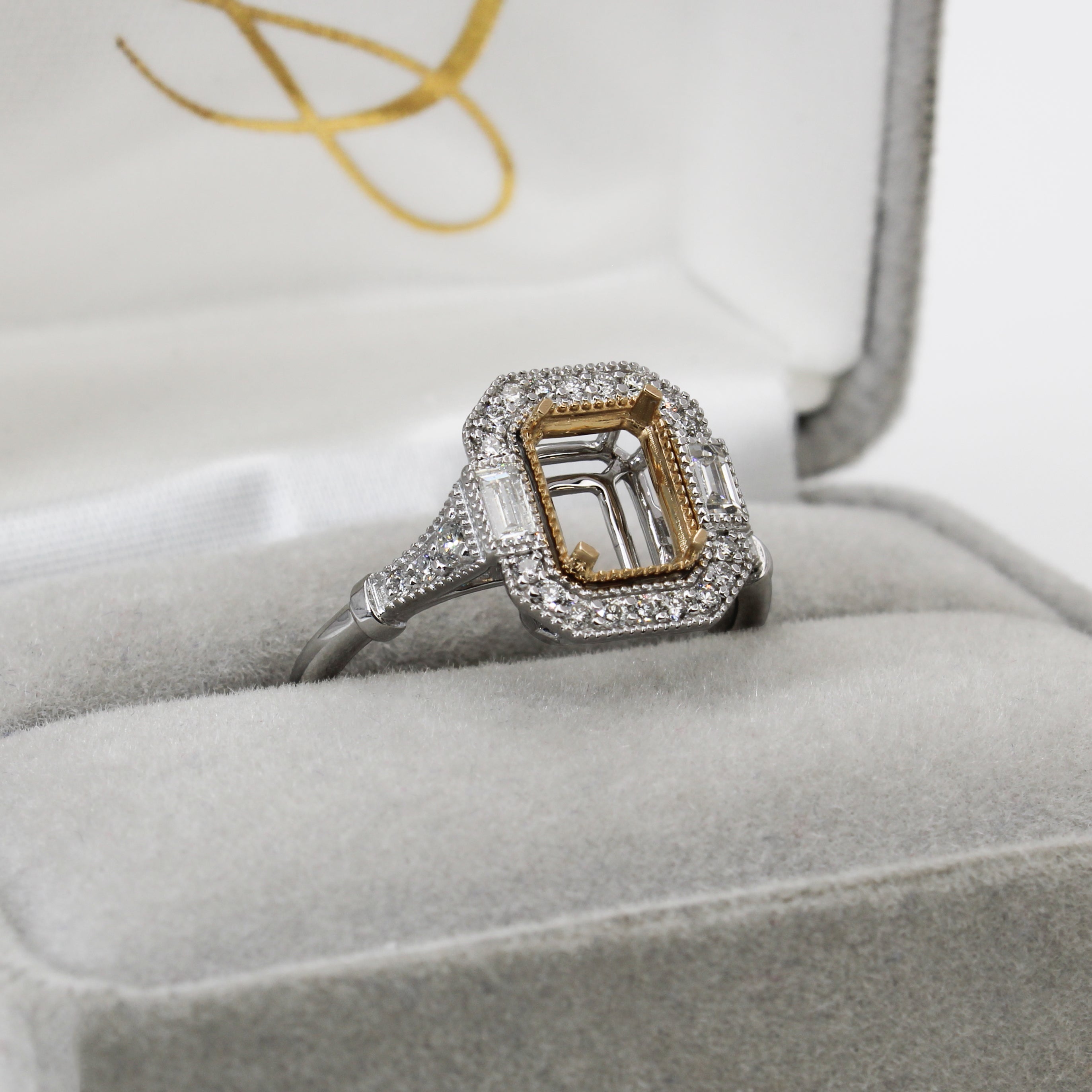 The ring showcases a beautifully detailed design with sparkling round and baguette diamonds that adorn the band and surround the center setting. The semi-mount features a unique mix of yellow and white gold accents, which adds a distinctive and refined touch. The open gallery beneath the setting allows light to flow through, enhancing the radiance of the diamonds and creating a brilliant sparkle from every angle.
