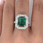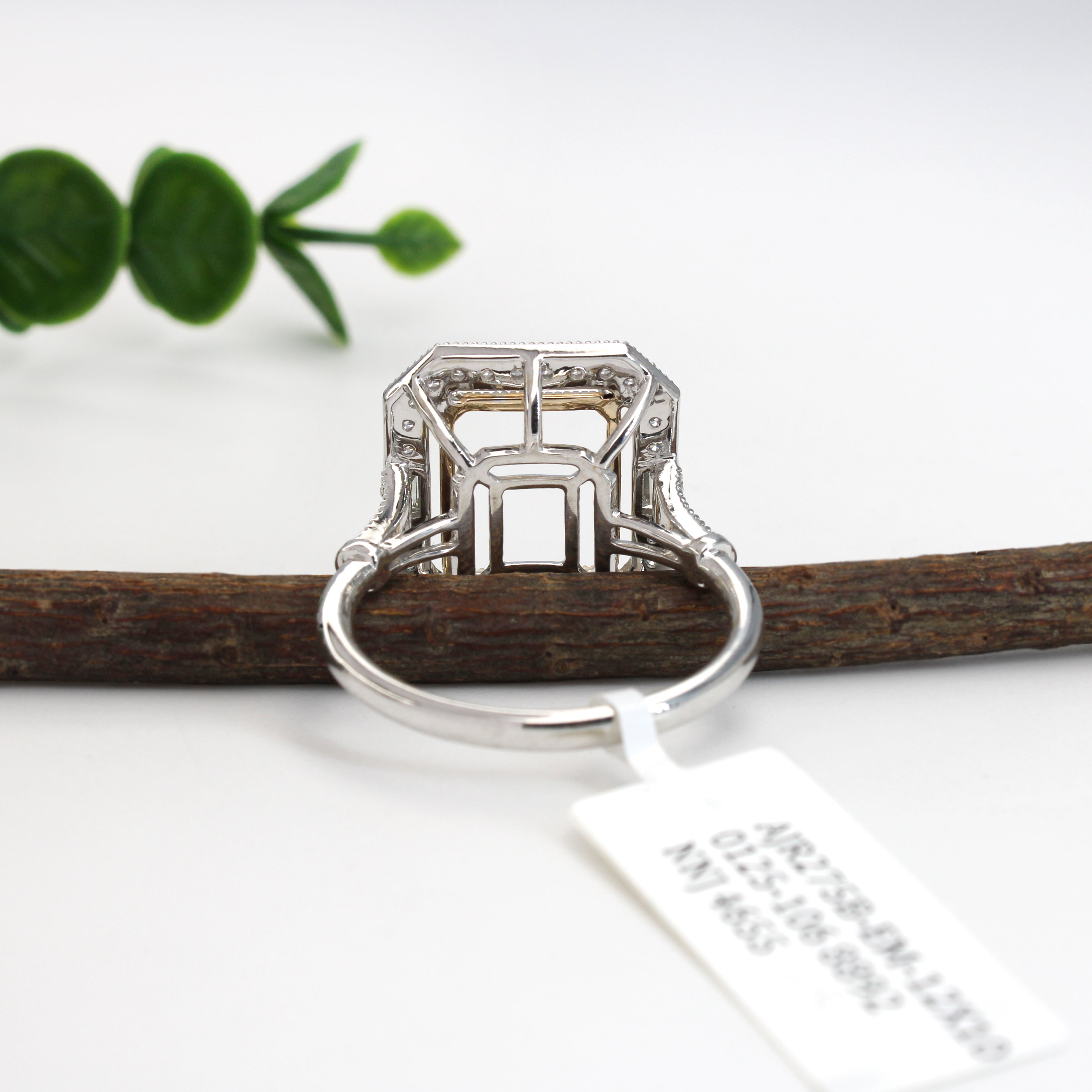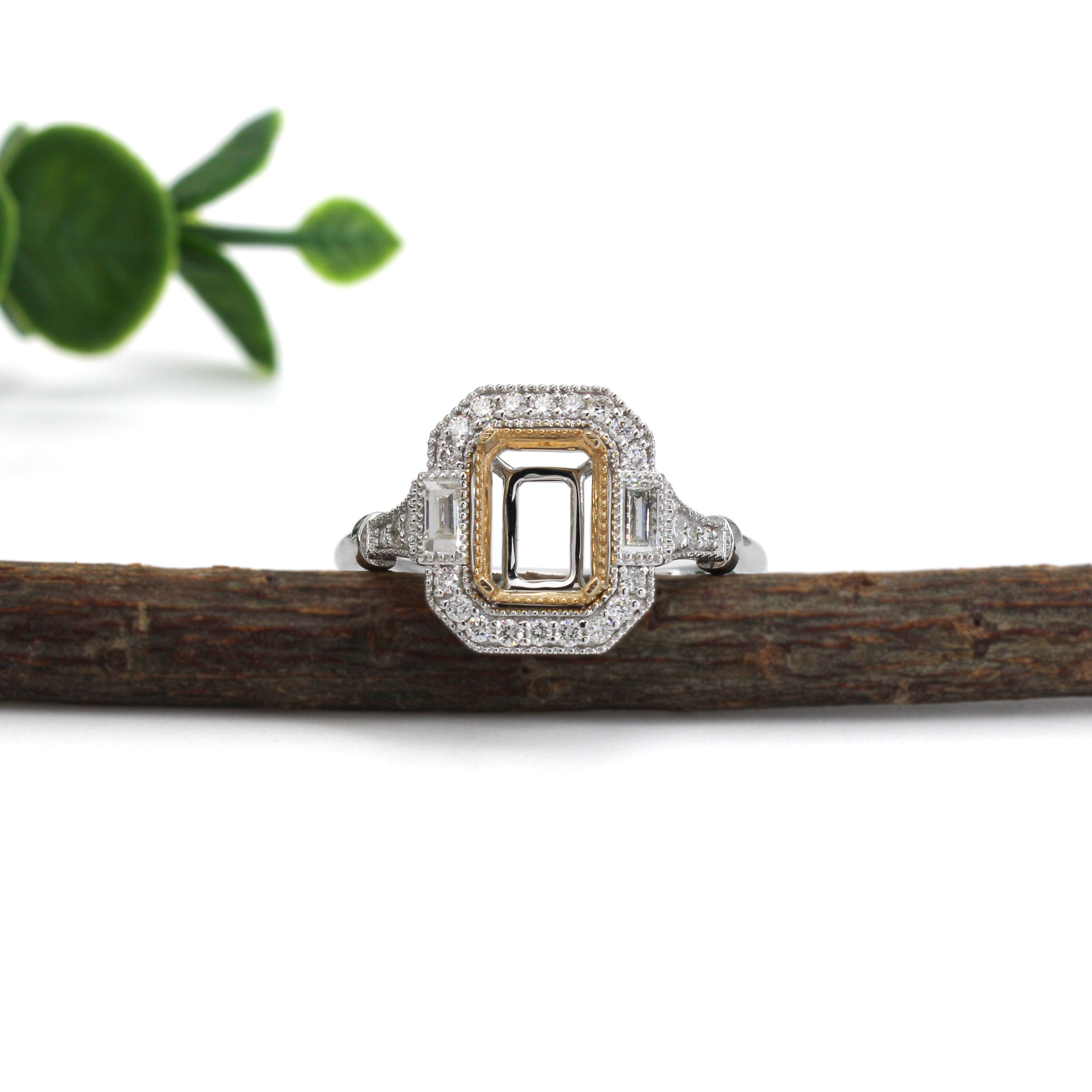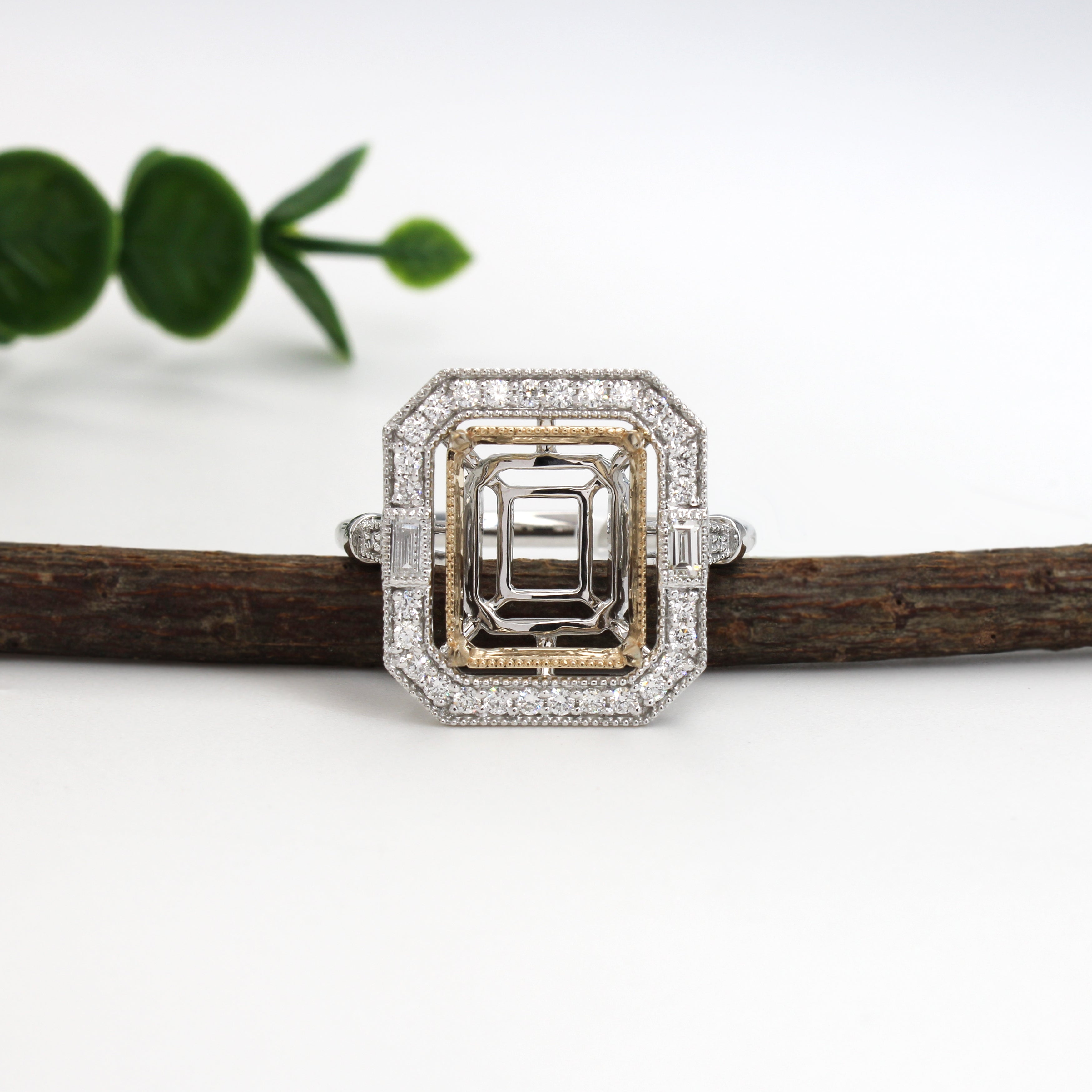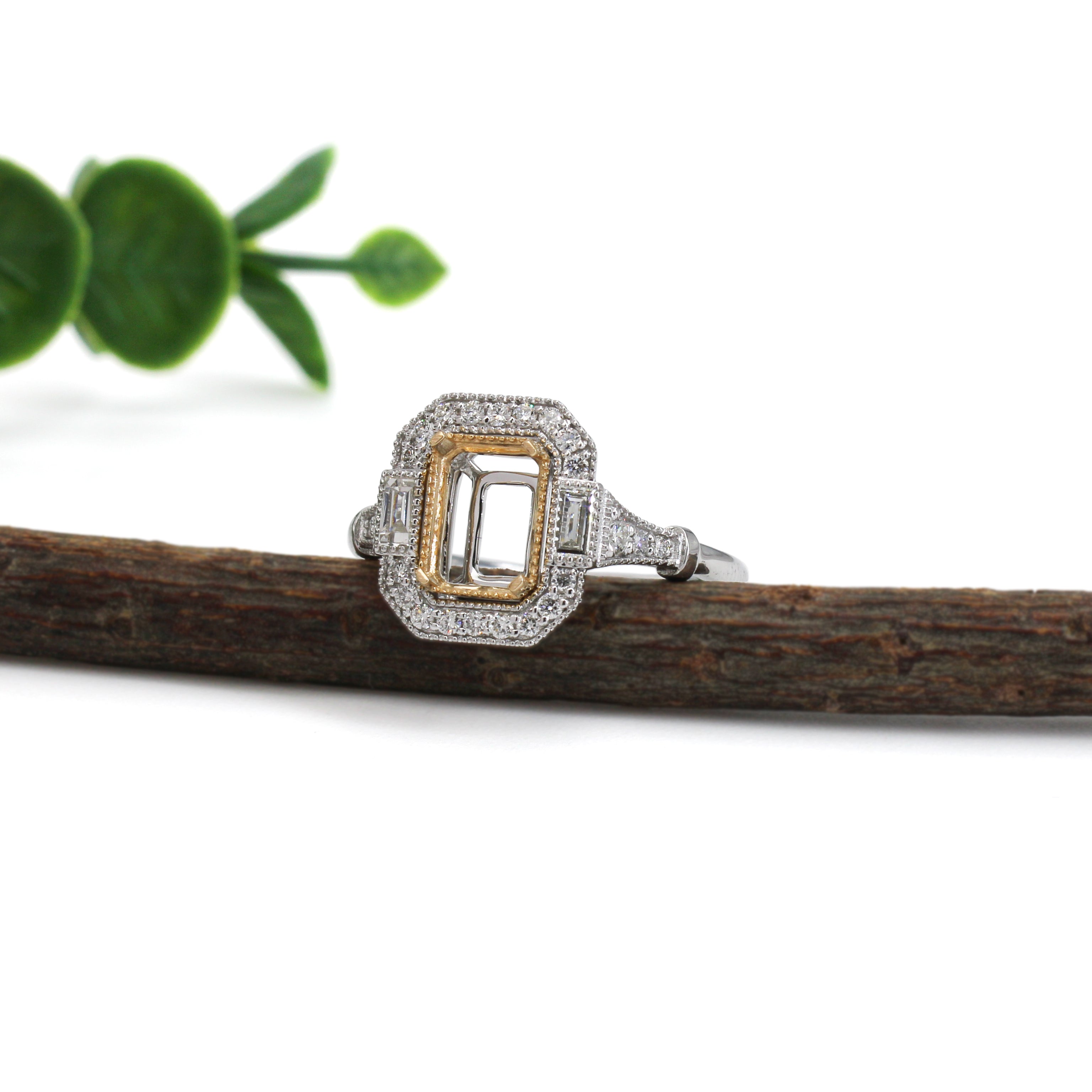 The ring showcases a beautifully detailed design with sparkling round and baguette diamonds that adorn the band and surround the center setting. The semi-mount features a unique mix of yellow and white gold accents, which adds a distinctive and refined touch. The open gallery beneath the setting allows light to flow through, enhancing the radiance of the diamonds and creating a brilliant sparkle from every angle.
