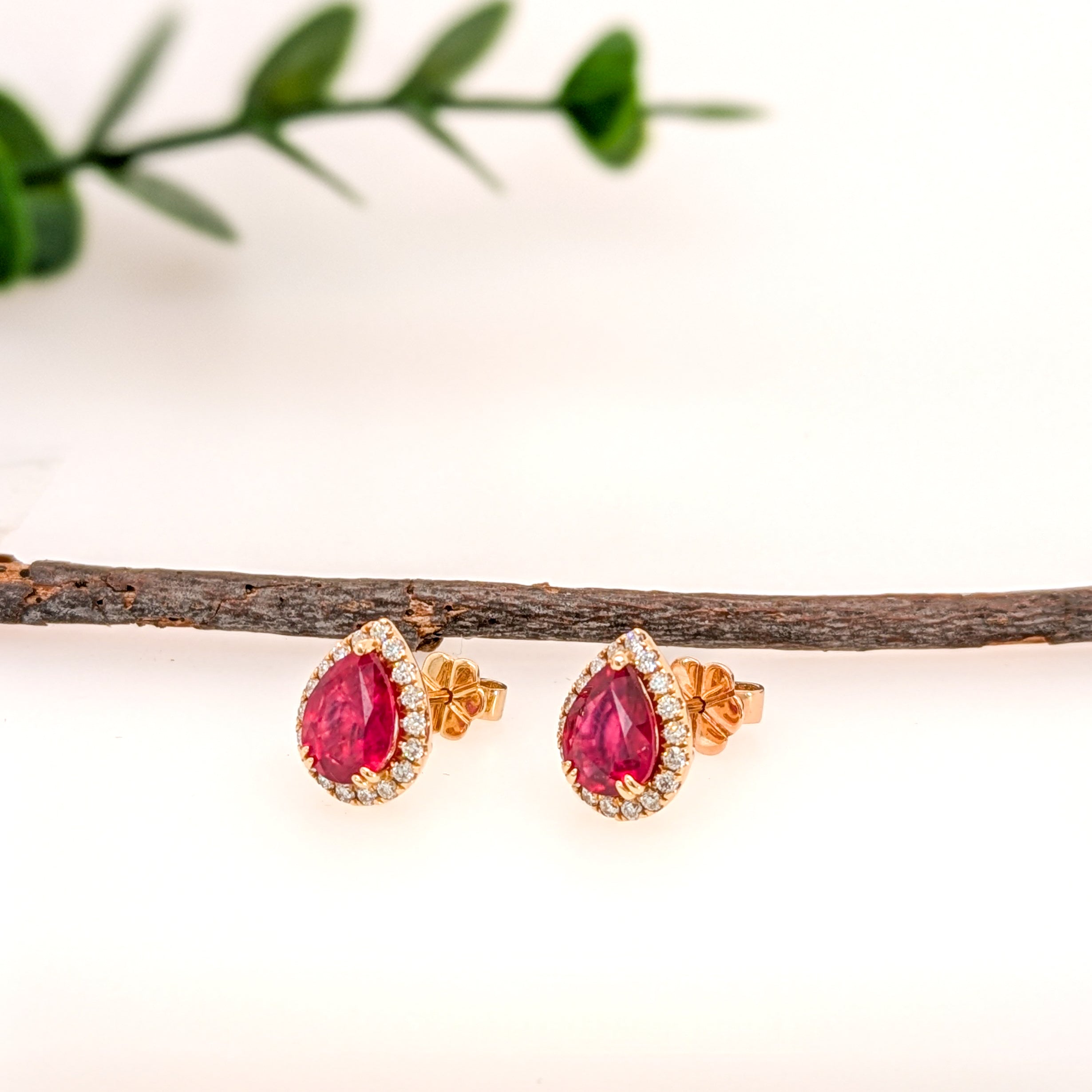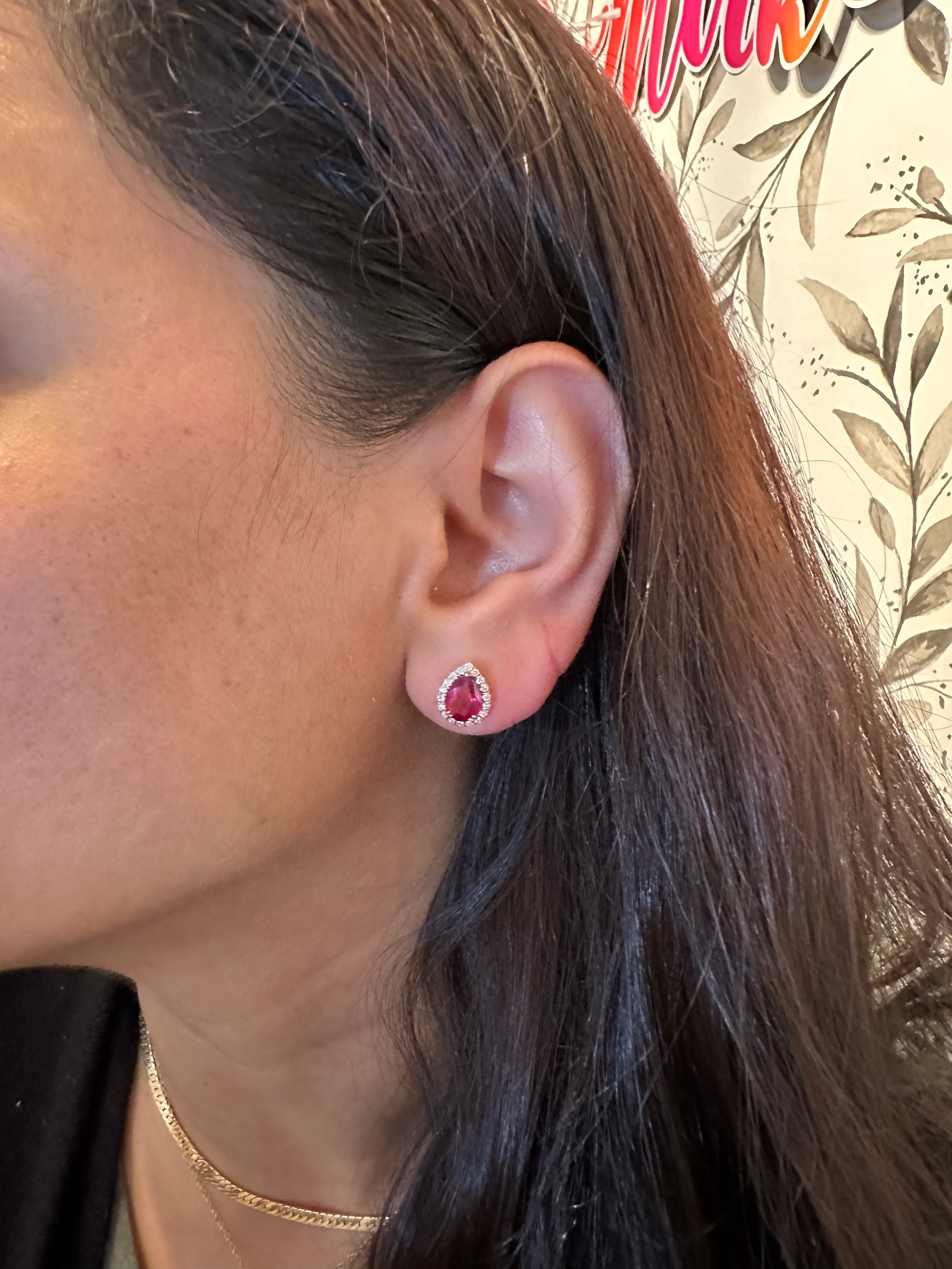 These beautiful stud earrings feature a pair of 2.86 carat weight pear cut ruby gemstones with a halo of natural earth mined diamonds, all set in solid 14K gold. These earrings can be a lovely July birthstone gift for your loved ones!