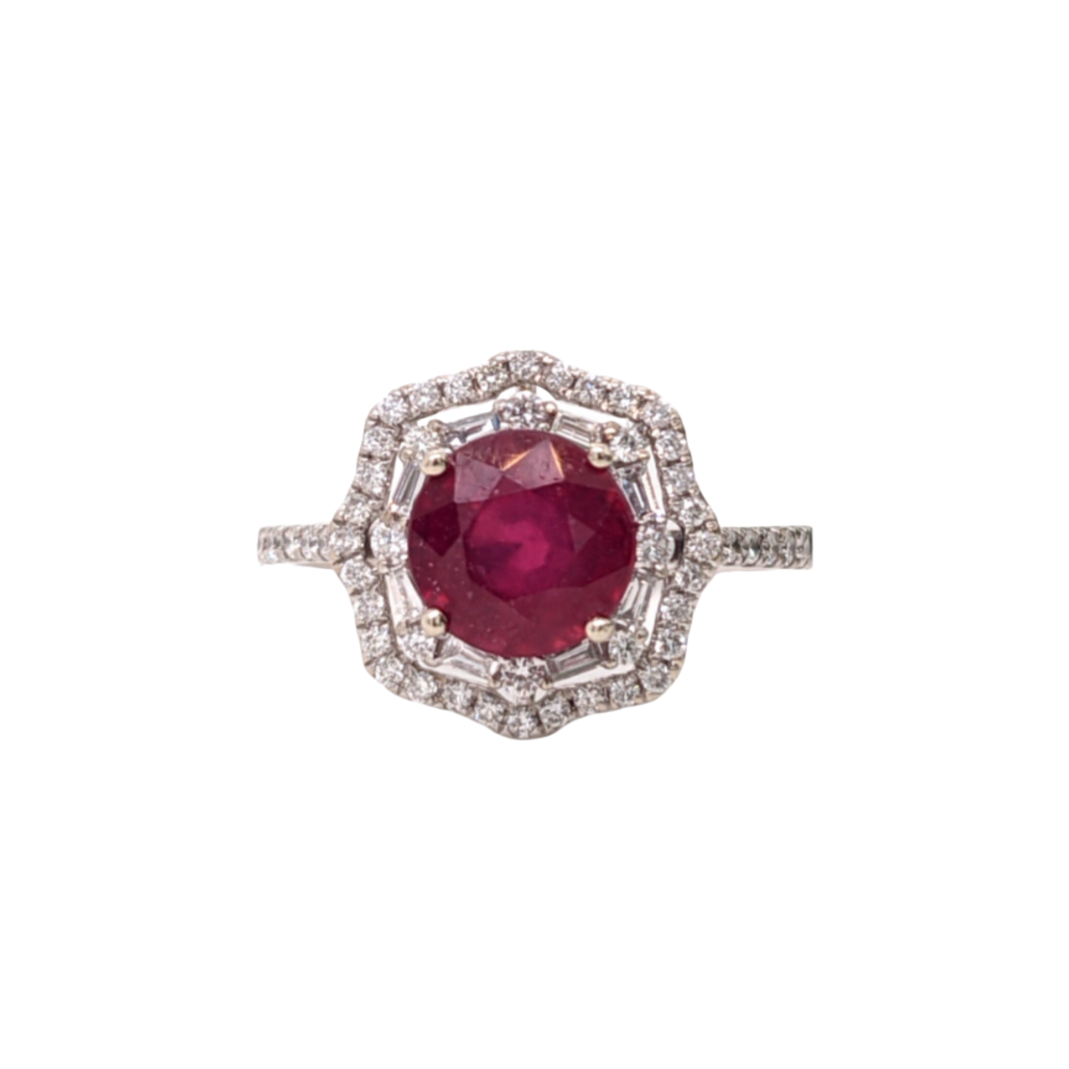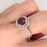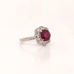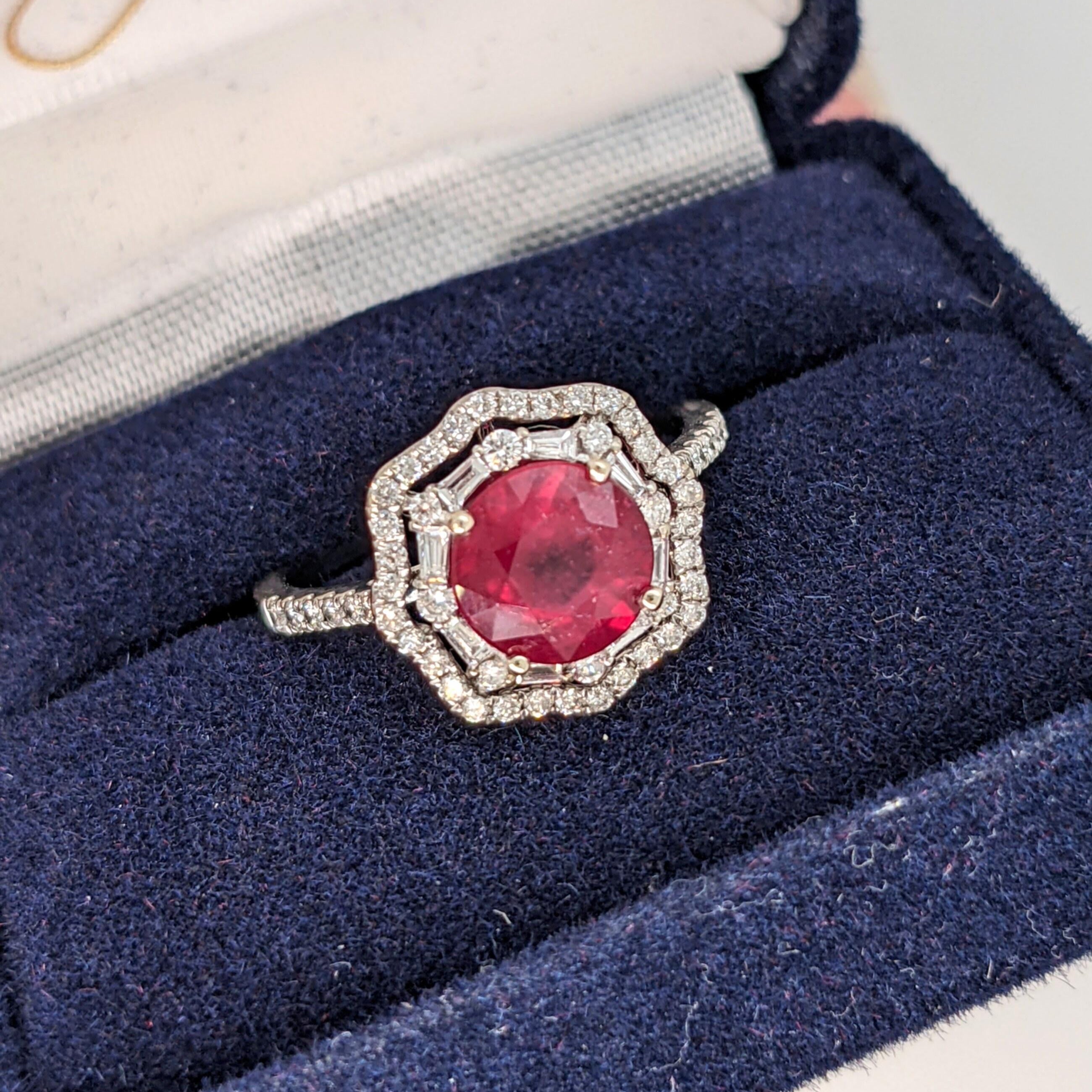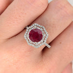 This stunning 14K gold Art Deco setting features a brilliant cut a vibrant earth mined ruby and natural diamond double halo with pave diamond shank. A statement ring design perfect for an eye catching engagement or anniversary. This ring also makes a beautiful birthstone ring for your loved ones.