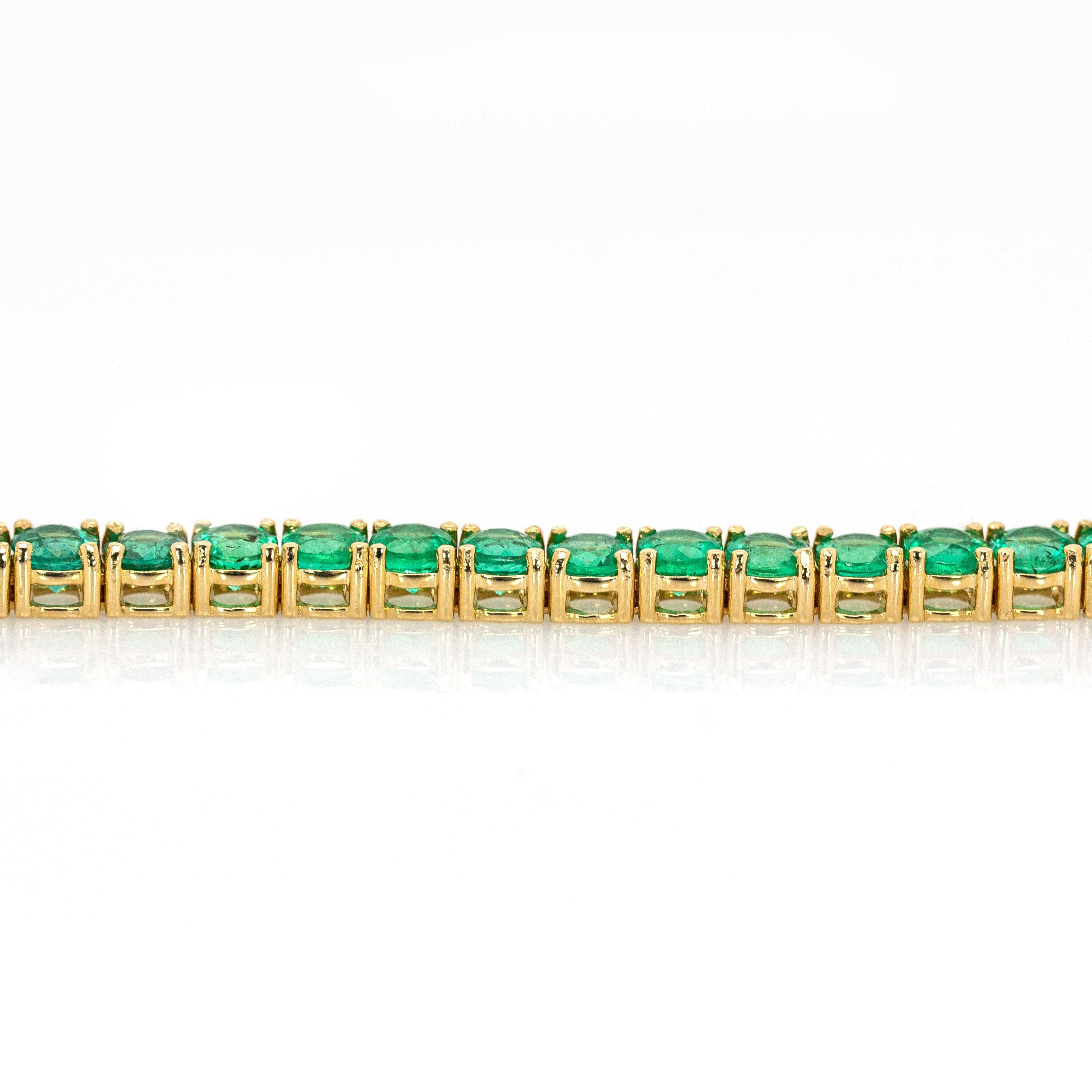 Timeless and elegant, this handcrafted bracelet showcases 50 round emeralds totaling 7.34 carats. Each 3.4mm stone is sourced from Zambia, known for producing some of the world’s most vibrant green emeralds. Set in 14K gold with a total weight of 9.3 grams, the piece offers a bold yet sophisticated look. Ideal for special occasions or adding a touch of luxury to everyday wear. Customization options are available to suit your style.