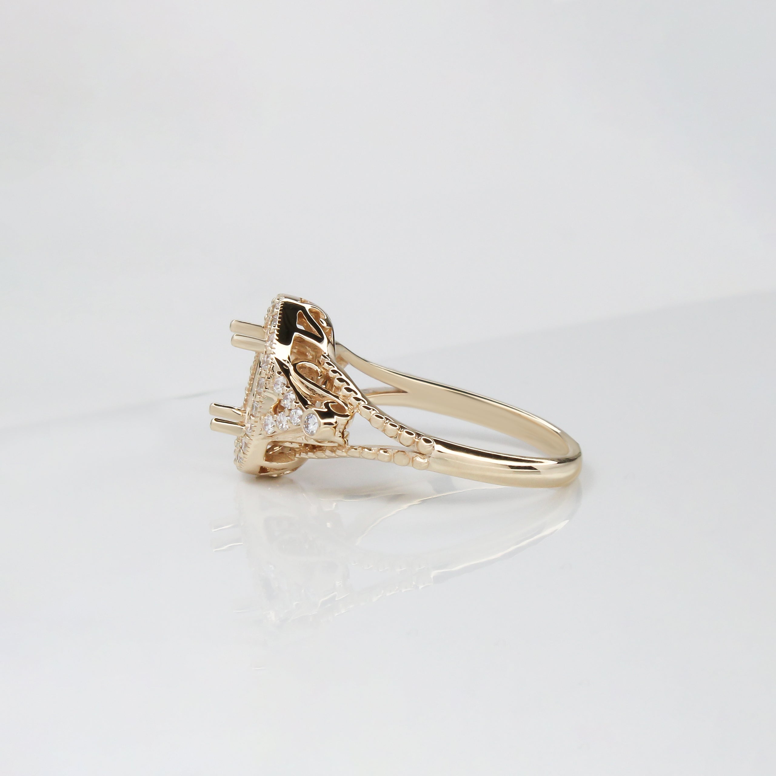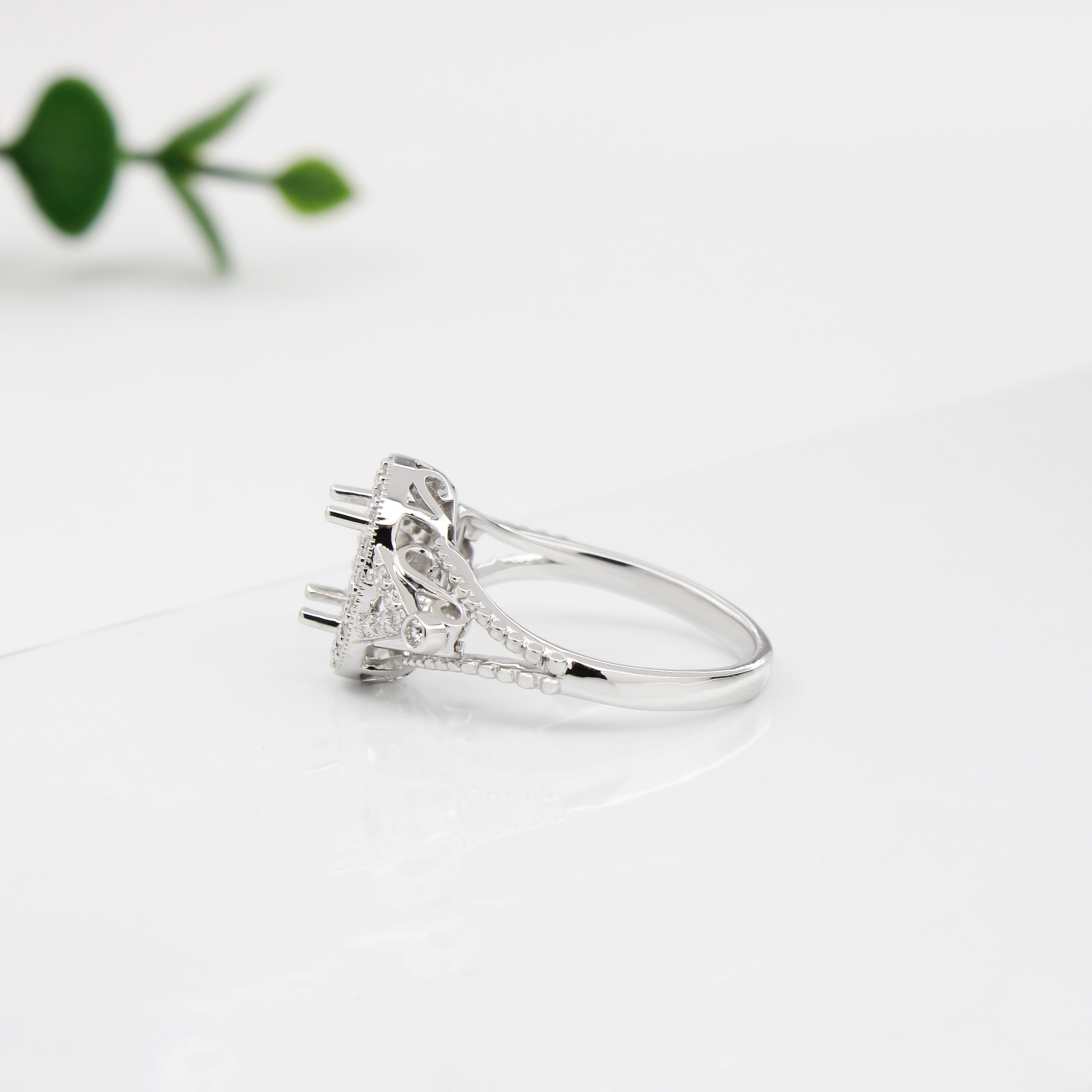 This beautiful ring semi mount features an natural earth mined diamond halo, pave split shank, and milgrain details, all set in solid 14K gold. This ring setting would be perfect for the center gemstone of your choice and can be a lovely birthstone gift for your loved ones!