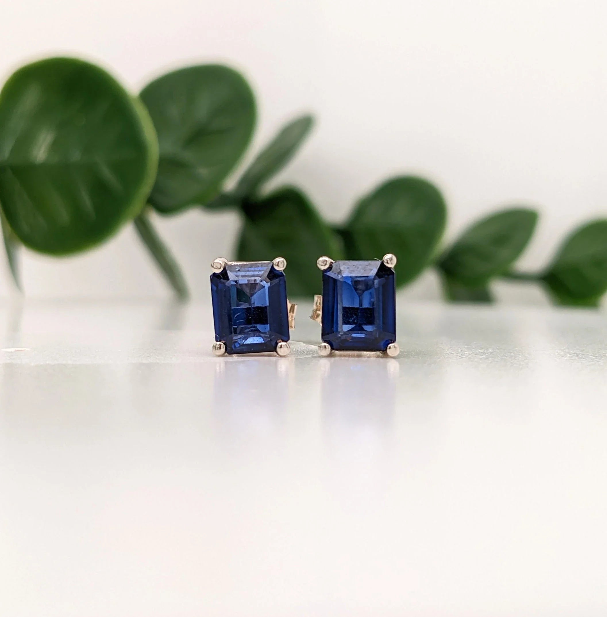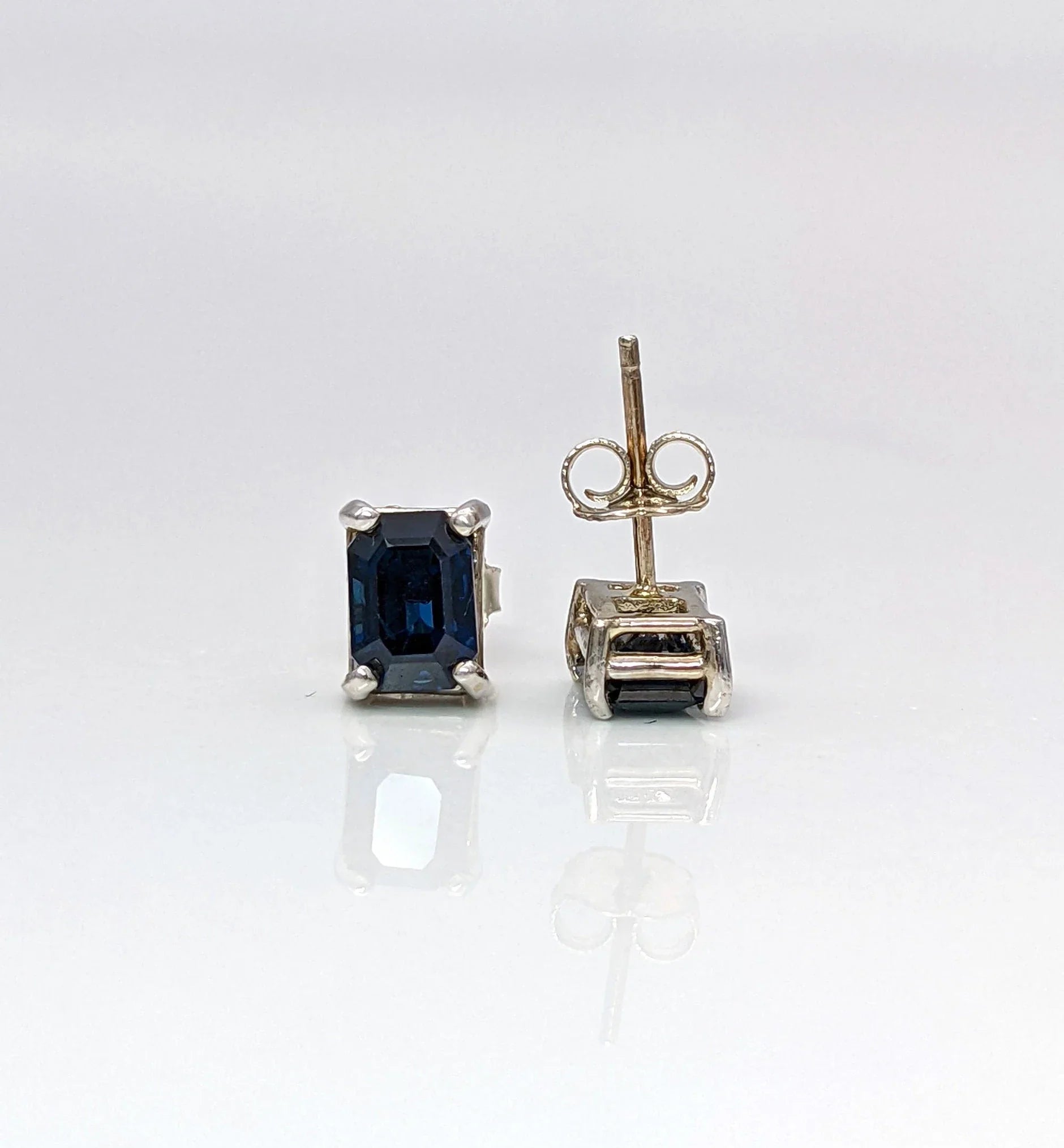 Solitaire Emerald Cut Twilight Blue Sapphire Solitaire Stud Earrings | 7x5mm