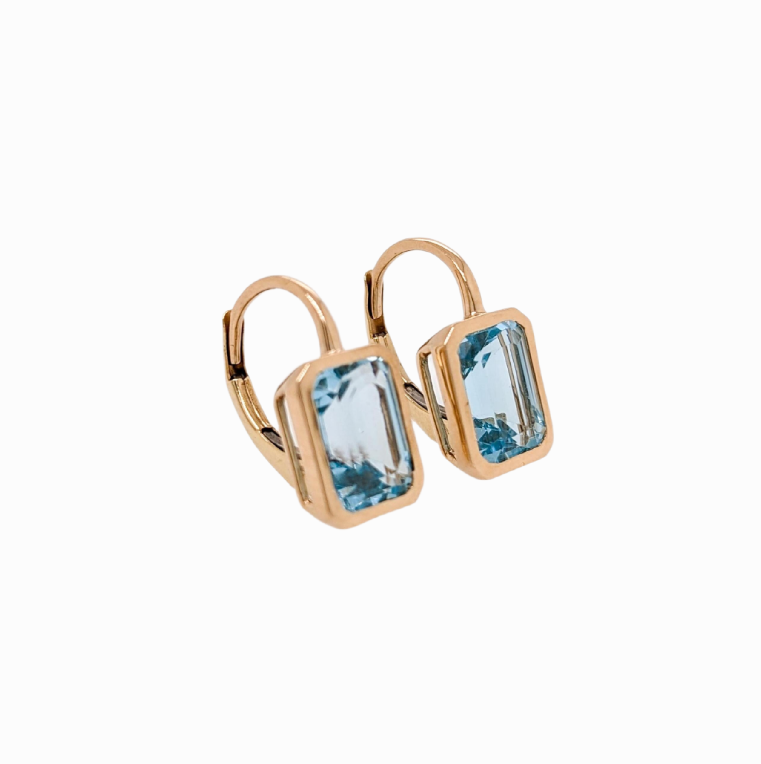 These beautiful lever back earrings feature a pair of emerald cut Swiss Blue Topaz gemstones set in solid 14K gold. These solitaire drops can be a lovely December birthstone gift for your loved ones!