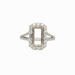 This exquisite ring semi mount features a unique emerald cut design with a split shank, surrounded by a halo of sparkling natural earth mined diamonds. The band is adorned with additional diamonds, enhancing its elegance. Crafted for versatility, this setting can be customized to the exact size of your gemstone!