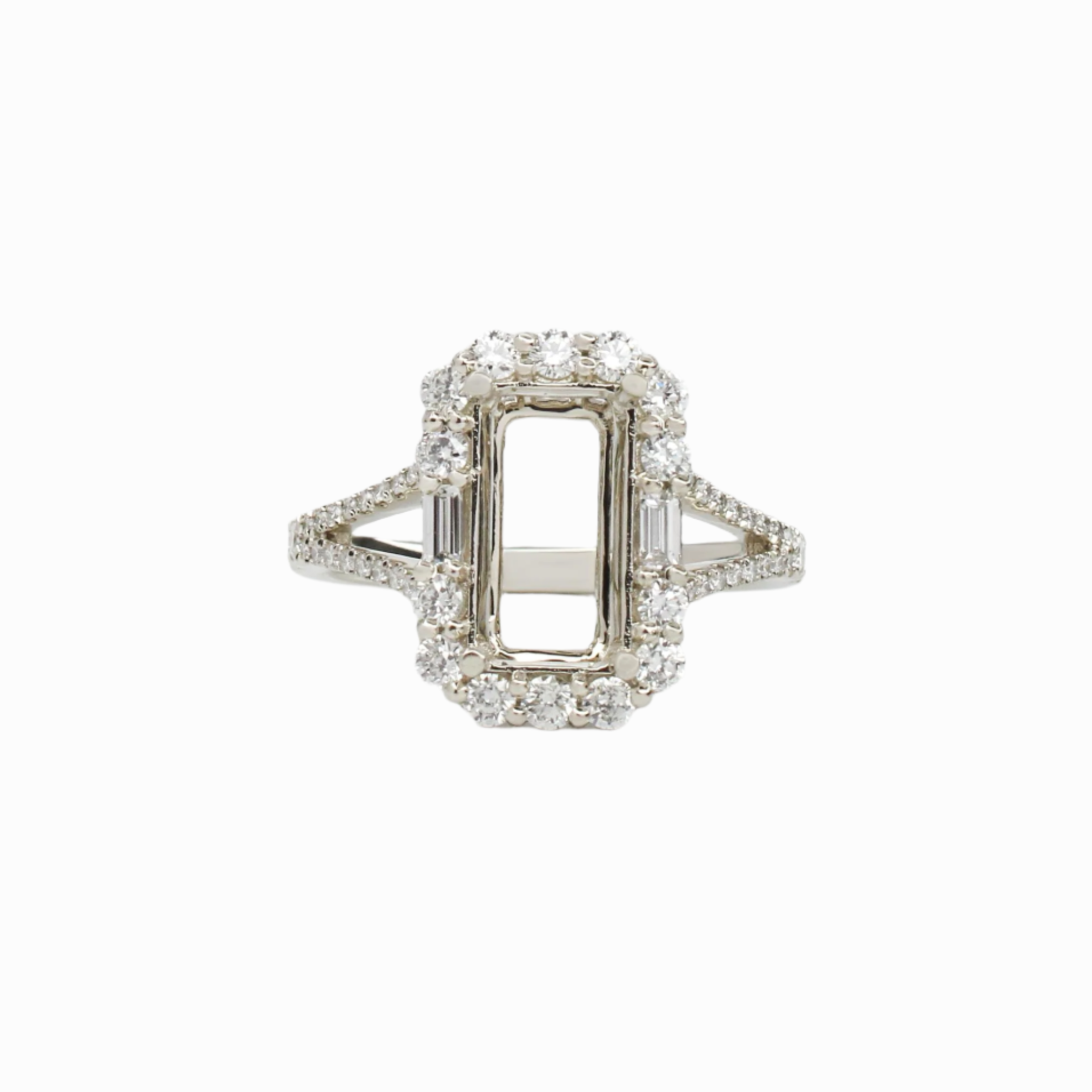 Split Shank Ring Semi Mount w Round & Baguette Diamonds in Solid 14K Gold | Emerald Cut