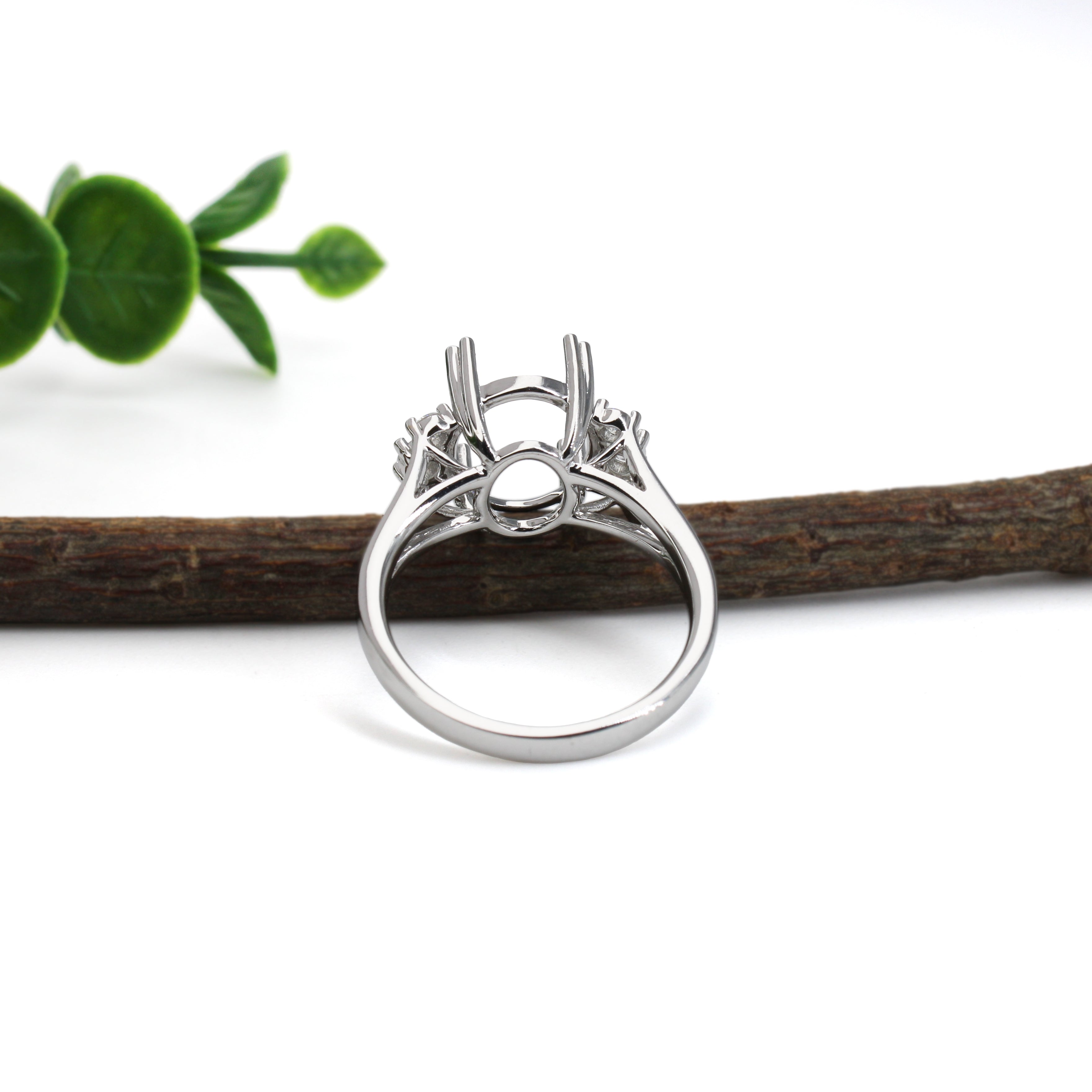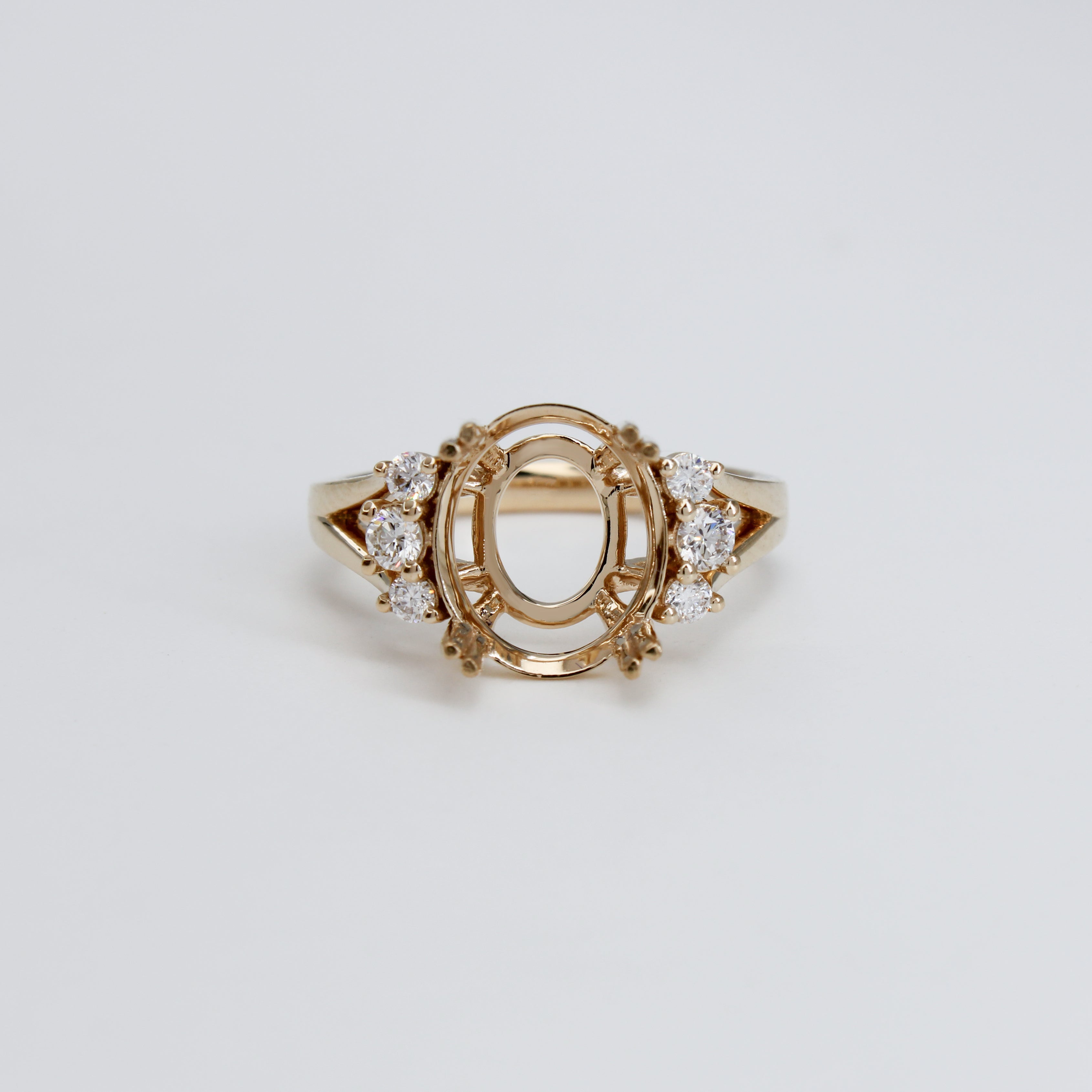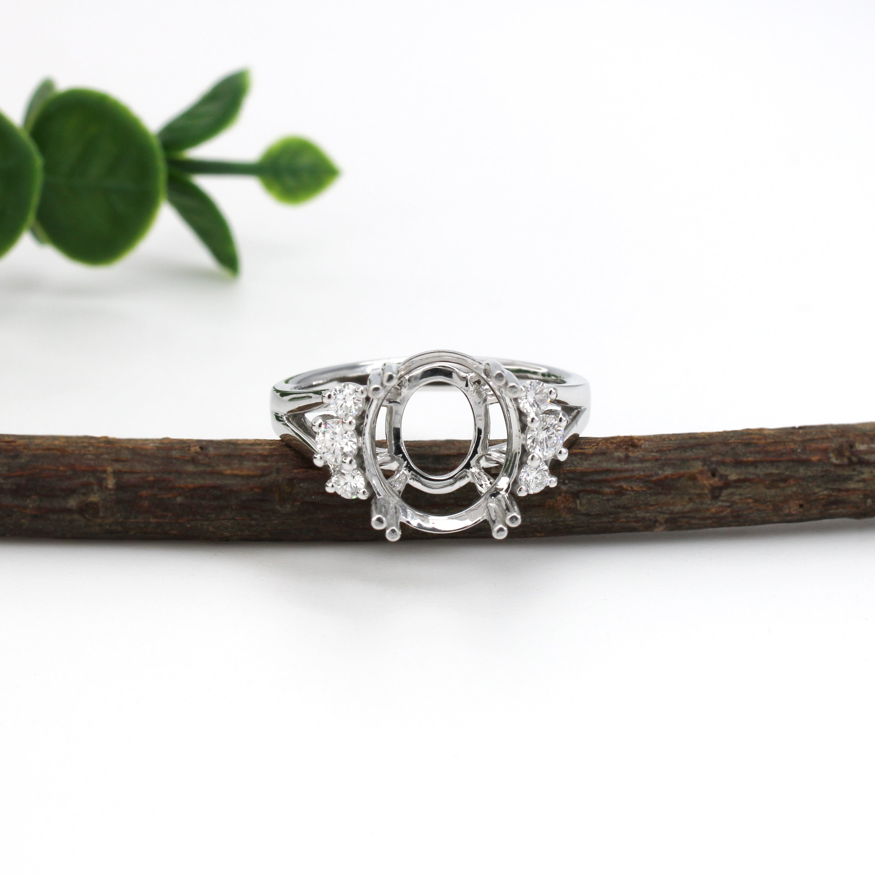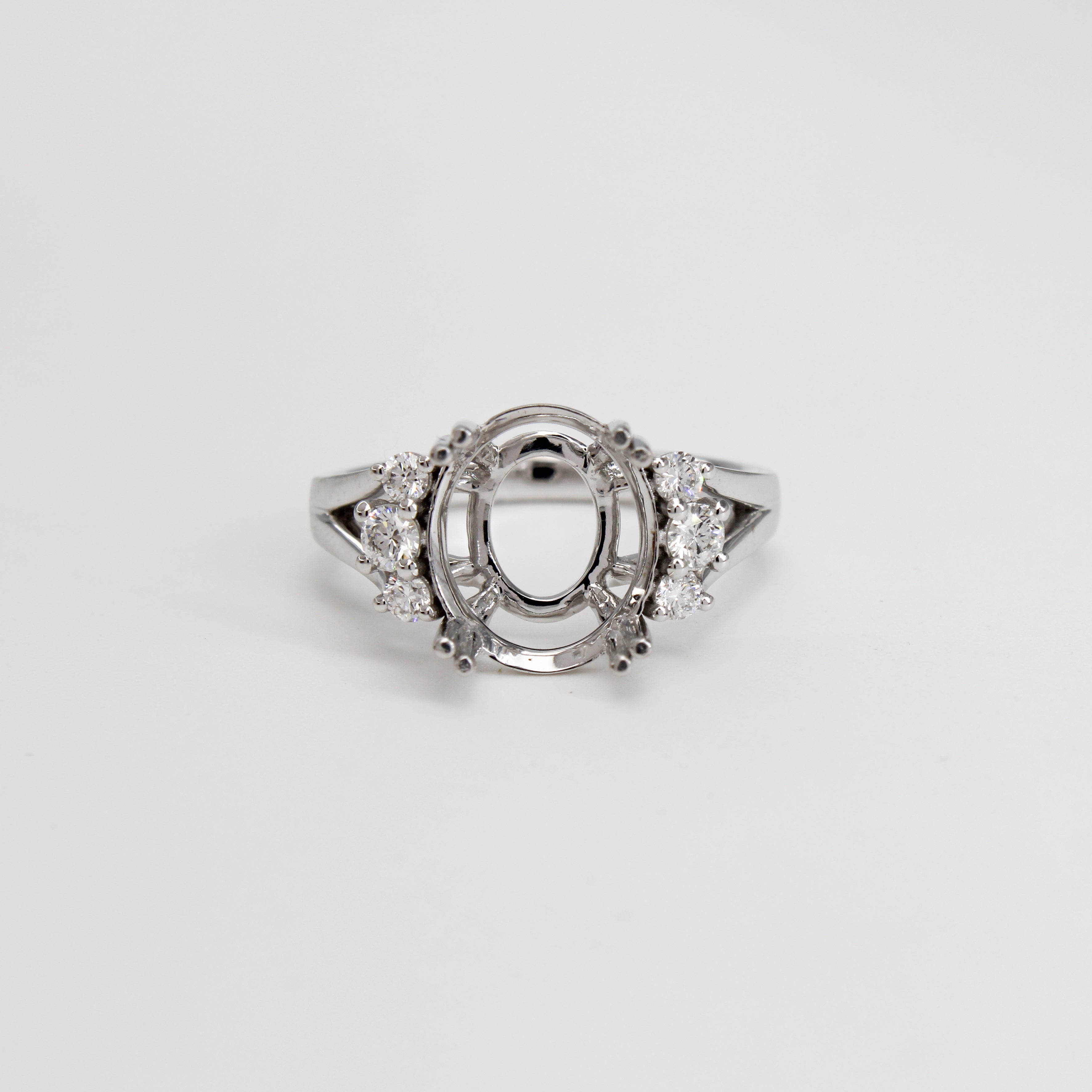 Collection quality 14k White, Yellow, or Rose Gold Engagement Ring Semi-mount with beautiful earth mined diamond accents and classic basket. This ring features a trio of diamonds framing the basket with a split band. This diamond ring setting can comfortably fit an oval shape gemstone without any alterations.